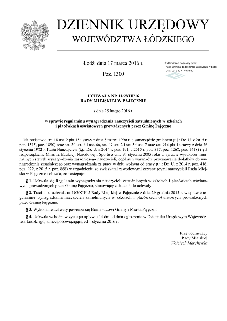 DZIENNIK URZĘDOWY WOJEWÓDZTWA ŁÓDZKIEGO Łódź, dnia 17 marca 2016 r. Elektronicznie podpisany przez: Anna Siwińska; Łódzki Urząd Wojewódzki w Łodzi Poz. 1300 Data: 2016-03-17 13:28:32 UCHWAŁA NR 116/XIII/16 RADY MIEJSKIEJ W PAJĘCZNIE z dnia 25 lutego 2016 r. w sprawie regulaminu wynagradzania nauczycieli zatrudnionych w szkołach i placówkach oświatowych prowadzonych przez Gminę Pajęczno Na podstawie art. 18 ust. 2 pkt 15 ustawy z dnia 8 marca 1990 r. o samorządzie gminnym (t.j.: Dz. U. z 2015 r. poz. 1515, poz. 1890) oraz art. 30 ust. 6 i ust. 6a, art. 49 ust. 2 i art. 54 ust. 7 oraz art. 91d pkt 1 ustawy z dnia 26 stycznia 1982 r. Karta Nauczyciela (t.j.: Dz. U. z 2014 r. poz. 191, z 2015 r. poz. 357, poz. 1268, poz. 1418) i § 5 rozporządzenia Ministra Edukacji Narodowej i Sportu z dnia 31 stycznia 2005 roku w sprawie wysokości minimalnych stawek wynagrodzenia zasadniczego nauczycieli, ogólnych warunków przyznawania dodatków do wynagrodzenia zasadniczego oraz wynagradzania za pracę w dniu wolnym od pracy (t.j.: Dz. U. z 2014 r. poz. 416, poz. 922, z 2015 r. poz. 868) w uzgodnieniu ze związkami zawodowymi zrzeszającymi nauczycieli Rada Miejska w Pajęcznie uchwala, co następuje: § 1. Uchwala się Regulamin wynagradzania nauczycieli zatrudnionych w szkołach i placówkach oświatowych prowadzonych przez Gminę Pajęczno, stanowiący załącznik do uchwały. § 2. Traci moc uchwała nr 105/XII/15 Rady Miejskiej w Pajęcznie z dnia 29 grudnia 2015 r. w sprawie regulaminu wynagradzania nauczycieli zatrudnionych w szkołach i placówkach oświatowych prowadzonych przez Gminę Pajęczno. § 3. Wykonanie uchwały powierza się Burmistrzowi Gminy i Miasta Pajęczno. § 4. Uchwała wchodzi w życie po upływie 14 dni od dnia ogłoszenia w Dzienniku Urzędowym Województwa Łódzkiego, z mocą obowiązującą od 1 stycznia 2016 r. Przewodniczący Rady Miejskiej Wojciech Marchewka Dziennik Urzędowy Województwa Łódzkiego –2– Poz. 1300 Załącznik do uchwały nr 116/XIII/16 Rady Miejskiej w Pajęcznie z dnia 25 lutego 2016 r. REGULAMIN WYNAGRADZANIA NAUCZYCIELI ZATRUDNIONYCH W SZKOŁACH I PLACÓWKACH OŚWIATOWYCH PROWADZONYCH PRZEZ GMINĘ PAJĘCZNO Rozdział 1 Postanowienia wstępne § 1. Ilekroć w dalszych przepisach jest mowa bez bliższego określenia o: 1) szkole – należy przez to rozumieć jednostki organizacyjne wymienione w art. 1 pkt 1 ustawy z dnia 26 stycznia 1982 roku – Karta Nauczyciela, dla których organem prowadzącym jest gmina Pajęczno, tj.: Szkołę Podstawową Nr 1 im. Juliana Tuwima w Pajęcznie, Publiczne Gimnazjum im. Polskich Noblistów w Pajęcznie, Szkołę Podstawową im. Jana Brzechwy w Makowiskach, Publiczne Przedszkola nr 1 i 2 w Pajęcznie, dla których organem prowadzącym jest Gmina Pajęczno; 2) dyrektorze lub wicedyrektorze – należy przez to rozumieć dyrektora lub wicedyrektora jednostki o której mowa w pkt 1; 3) burmistrzu – należy przez to rozumieć Burmistrza Gminy i Miasta Pajęczno; 4) nauczycielu – należy przez to rozumieć nauczycieli i innych pracowników pedagogicznych zatrudnionych w jednostkach organizacyjnych, o których mowa w pkt 1; 5) roku szkolnym – należy przez to rozumieć okres pracy od 1 września danego roku do 31 sierpnia roku następnego; 6) klasie – należy przez to rozumieć także oddział lub grupę; 7) uczniu – należy przez to rozumieć także wychowanka; 8) tygodniowym obowiązkowym wymiarze godzin – należy przez to rozumieć tygodniowy obowiązkowy wymiar godzin, o którym mowa w art. 42 ust. 3 i ust. 4a ustawy Karta Nauczyciela; 9) godzinie ponadwymiarowej – należy przez to rozumieć przydzieloną nauczycielowi w arkuszu organizacyjnym szkoły godzinę zajęć dydaktycznych, wychowawczych lub opiekuńczych powyżej jego tygodniowego obowiązkowego wymiaru godzin; 10) godzinie doraźnego zastępstwa – należy przez to rozumieć zlecone nauczycielowi jednorazowo przez dyrektora szkoły zajęcia dydaktyczne, wychowawcze lub opiekuńcze, które w projekcie organizacyjnym szkoły przypisane są innemu nauczycielowi; 11) Karcie Nauczyciela – należy przez to rozumieć ustawę z dnia 26 stycznia 1982 r. Karta Nauczyciela (t.j.: Dz. U. z 2014 r. poz. 191, z 2015 r. poz. 357); 12) Rozporządzeniu MEN – należy przez to rozumieć rozporządzenie Ministra Edukacji Narodowej i Sportu z dnia 31 stycznia 2005 roku w sprawie wysokości minimalnych stawek wynagrodzenia zasadniczego nauczycieli, ogólnych warunków przyznawania dodatków do wynagrodzenia zasadniczego oraz wynagradzania za pracę w dniu wolnym od pracy (Dz. U. z 2014 r. poz. 416, z 2015 r. poz. 868); 13) regulaminie – należy przez to rozumieć regulamin wynagradzania nauczycieli zatrudnionych w szkołach i placówkach oświatowych prowadzonych przez Gminę Pajęczno. § 2. 1. Regulamin określa: 1) wysokość oraz warunki przyznawania dodatków: motywacyjnego, funkcyjnego i za warunki pracy; 2) szczegółowy sposób obliczania wynagrodzenia za godziny ponadwymiarowe i za godziny zastępstw doraźnych. 2. Zasady i warunki przyznawania nagród ze specjalnego funduszu nagród określa odrębna uchwała. Dziennik Urzędowy Województwa Łódzkiego –3– Poz. 1300 Rozdział 2 Dodatki Dodatek motywacyjny § 3. 1. Dodatek motywacyjny może być przyznany nauczycielowi (poczynając od stopnia nauczyciela kontraktowego) po przepracowaniu w danej placówce, co najmniej 1 roku. 2. Nauczycielowi przysługuje dodatek motywacyjny w zależności od osiąganych wyników pracy, a w szczególności za: 1) osiągnięcia dydaktyczne, wychowawcze i opiekuńcze; 2) jakość świadczonej pracy; 3) posiadanie, co najmniej dobrej oceny pracy lub pozytywnej oceny dorobku zawodowego; 4) zaangażowanie w realizację czynności i zajęć określonych w art. 42 ust. 2 pkt 2 i 3 Karty Nauczyciela. 3. Wysokość środków finansowych przeznaczonych na dodatki motywacyjne dla nauczycieli wynosi minimum 3% średniego wynagrodzenia nauczycie