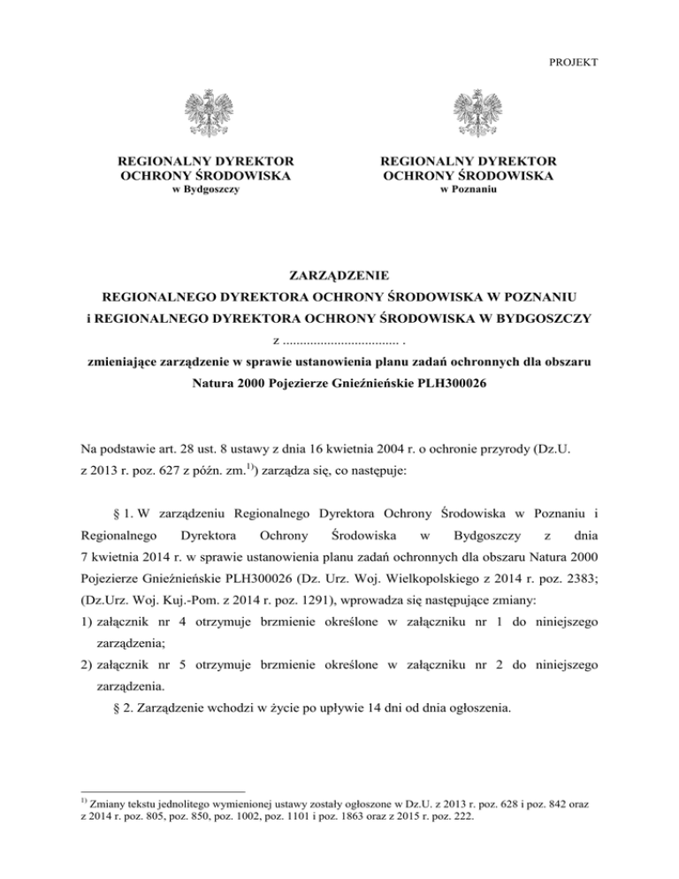 PROJEKT REGIONALNY DYREKTOR OCHRONY ŚRODOWISKA REGIONALNY DYREKTOR OCHRONY ŚRODOWISKA w Bydgoszczy w Poznaniu ZARZĄDZENIE REGIONALNEGO DYREKTORA OCHRONY ŚRODOWISKA W POZNANIU i REGIONALNEGO DYREKTORA OCHRONY ŚRODOWISKA W BYDGOSZCZY z .................................. . zmieniające zarządzenie w sprawie ustanowienia planu zadań ochronnych dla obszaru Natura 2000 Pojezierze Gnieźnieńskie PLH300026 Na podstawie art. 28 ust. 8 ustawy z dnia 16 kwietnia 2004 r. o ochronie przyrody (Dz.U. z 2013 r. poz. 627 z późn. zm.1)) zarządza się, co następuje: § 1. W zarządzeniu Regionalnego Dyrektora Ochrony Środowiska w Poznaniu i Regionalnego Dyrektora Ochrony Środowiska w Bydgoszczy z dnia 7 kwietnia 2014 r. w sprawie ustanowienia planu zadań ochronnych dla obszaru Natura 2000 Pojezierze Gnieźnieńskie PLH300026 (Dz. Urz. Woj. Wielkopolskiego z 2014 r. poz. 2383; (Dz.Urz. Woj. Kuj.-Pom. z 2014 r. poz. 1291), wprowadza się następujące zmiany: 1) załącznik nr 4 otrzymuje brzmienie określone w załączniku nr 1 do niniejszego zarządzenia; 2) załącznik nr 5 otrzymuje brzmienie określone w załączniku nr 2 do niniejszego zarządzenia. § 2. Zarządzenie wchodzi w życie po upływie 14 dni od dnia ogłoszenia. 1) Zmiany tekstu jednolitego wymienionej ustawy zostały ogłoszone w Dz.U. z 2013 r. poz. 628 i poz. 842 oraz z 2014 r. poz. 805, poz. 850, poz. 1002, poz. 1101 i poz. 1863 oraz z 2015 r. poz. 222. Załączniki do zarządzenia Regionalnego Dyrektora Ochrony Środowiska w Poznaniu i Regionalnego Dyrektora Ochrony Środowiska w Bydgoszczy z .......................................... Załącznik Nr 1 Cele działań ochronnych Lp. 1. 2. 3. 4. 5. 6. 7. 8. 9. 10. 11. Przedmiot ochrony 3140 Twardowodne oligo- i mezotroficzne zbiorniki z podwodnymi łąkami ramienic (Chara ssp.) 3150 Starorzecza i naturalne, eutroficzne zbiorniki wodne ze zbiorowiskami z Nymphaeion, Potamion 6210 Murawy kserotermiczne (Festuco-Brometea i ciepłolubne murawy z Asplenio septentrionalis-Festucion pallentis) 6410 Zmiennowilgotne łąki trzęślicowe (Molinion) 6440 Łąki selernicowe (Cnidion dubii) 6510 Niżowe i górskie świeże łąki użytkowane ekstensywnie (Arrhenatherion elatioris) 7140 Torfowiska przejściowe i trzęsawiska (przeważnie z roślinnością ScheuchzerioCaricetea) 7150 Obniżenia na podłożu torfowym z roślinnością ze związku Rhynchosporion 7210 Torfowiska nakredowe (Cladietum marisci) 9170 Grąd środkowoeuropejski i subkontynentalny (GalioCarpinetum, Tilio-Carpinetum) 9190 Kwaśne dąbrowy (Quercion robori-petraeae) Cele działań ochronnych Utrzymanie obecnego stanu ochrony poprzez: − Ograniczenie niszczenia fragmentacji roślinności strefy brzegowej. − Ograniczenie dopływu biogenów do wód. − Utrzymanie warunków dla występowania łąk ramienicowych. Poprawa niezadowalającego stanu ochrony poprzez: − Ograniczenie niszczenia i fragmentacji roślinności strefy brzegowej. − Odtworzenie warunków dla występowania roślinności zanurzonej i o liściach pływających. − Ograniczenie dopływu biogenów do wód. Poprawa złego stanu ochrony poprzez przeciwdziałanie sukcesji. Poprawa złego stanu ochrony poprzez polepszenie struktury i funkcji w wyniku odpowiedniego użytkowania rolnego. Poprawa złego stanu ochrony poprzez polepszenie struktury i funkcji w wyniku odpowiedniego użytkowania rolnego Poprawa złego stanu ochrony poprzez polepszenie struktury i funkcji w wyniku odpowiedniego użytkowania rolnego Utrzymanie obecnego stanu ochrony. Utrzymanie obecnego stanu ochrony. Utrzymanie obecnego stanu ochrony. Poprawa niezadowalającego stanu ochrony poprzez: − Zmniejszenie udziału gatunków inwazyjnych. − Przebudowę drzewostanu w kierunku składu zgodnego z typem siedliska przyrodniczego i utrzymywanie zróżnicowanej struktury warstwowej lasu. − Umożliwienie swobodnego przebiegu procesów naturalnych. Poprawa złego stanu ochrony poprzez: − Przebudowę drzewostanu w kierunku składu zgodnego z typem siedliska przyrodniczego. − Umożliwienie swobodnego przebiegu procesów naturalnych. 12. 13. 14. 15. 16. 17. 18. 91E0 Łęgi wierzbowe, topolowe, olszowe i jesionowe (Salicetum albo-fragilis, Populetum albae, Alnenion glutinoso-incanae) i olsy źródliskowe Poprawa niezadowalającego stanu ochrony poprzez: − Przebudowę drzewostanu w kierunku składu zgodnego z typem siedliska przyrodniczego. − Utrzymywanie zróżnicowanej struktury warstwowej lasu. − Polepszenie i stabilizację warunków wilgotnościowych siedliska. − Zwiększenie ilości martwego drewna. − Umożliwienie swobodnego przebiegu procesów naturalnych. 91F0 Łęgowe lasy dębowoPoprawa złego stanu ochrony poprzez: wiązowo-jesionowe (Ficario− Przebudowę drzewostanu w kierunku składu zgodnego z Ulmetum) typem siedliska przyrodniczego. − Polepszenie i stabilizację warunków wilgotnościowych siedliska. − Zwiększenie ilości martwego drewna. − Umożliwienie swobodnego przebiegu procesów naturalnych. 91I0 Ciepłolubne dąbrowy Poprawa niezadowalającego stanu ochrony poprzez: (Quercetalia pubescenti− Zmianę warunków świetlnych w runie i podszycie petraeae) siedliska. − Przebudowę drzewostanu w kierunku składu zgodnego z typem siedliska przyrodniczego i korektę zwarcia drzewostanu. − Umożliwienie swobodnego przebiegu procesów naturalnych. 1614 Selery błotne Apium repens Poprawa złego stanu ochrony poprzez: − Przeciwdziałanie niszczeniu siedlisk pracami ziemnymi wykonywanymi w linii brzegowej jezior. − Przeciwdziałanie sukcesji wtórnej na siedliskach gatunku. − Zasilenie lokalnych populacji naturalnych osobnikami pobranymi do namnożenia w hodowli ex situ. 1335 Wydra Lutra lutra Utrzymanie właściwego stanu ochrony. 1145 Piskorz Misgurnus fossilis Uzupełnienie stanu wiedzy o liczebności i zagęszczeniu populacji piskorza oraz hydromorfologii ich siedlisk oraz określenie działań ochronnych. 1516 Aldrowanda Rozpoznanie rozmieszczeni