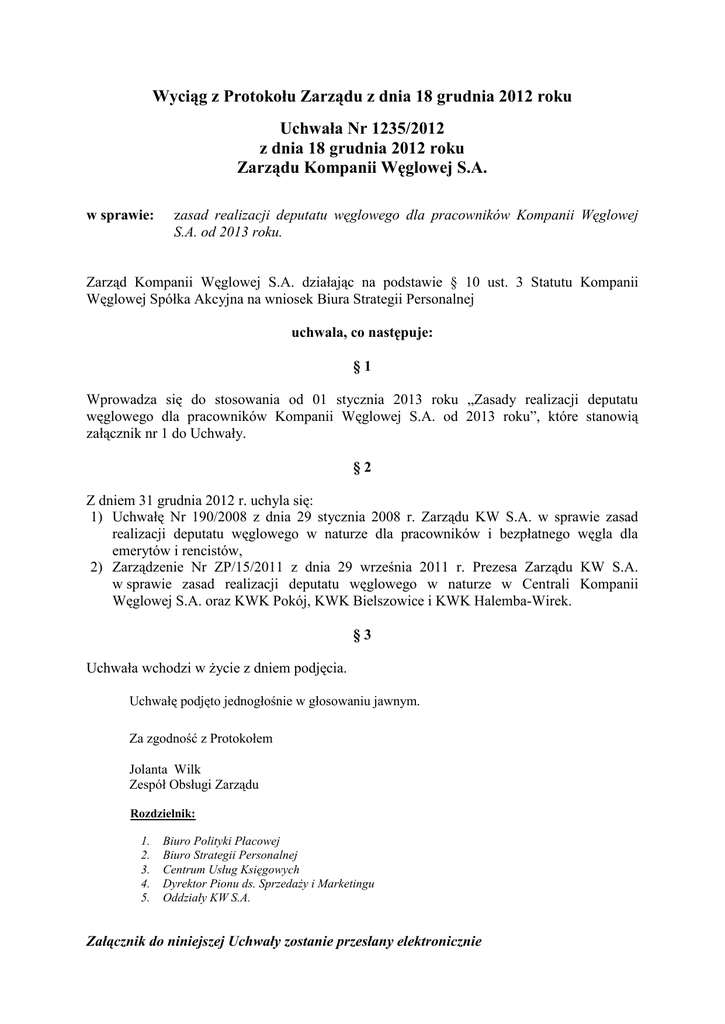 Wyciąg z Protokołu Zarządu z dnia 18 grudnia 2012 roku Uchwała Nr 1235/2012 z dnia 18 grudnia 2012 roku Zarządu Kompanii Węglowej S.A. w sprawie: zasad realizacji deputatu węglowego dla pracowników Kompanii Węglowej S.A. od 2013 roku. Zarząd Kompanii Węglowej S.A. działając na podstawie § 10 ust. 3 Statutu Kompanii Węglowej Spółka Akcyjna na wniosek Biura Strategii Personalnej uchwala, co następuje: §1 Wprowadza się do stosowania od 01 stycznia 2013 roku „Zasady realizacji deputatu węglowego dla pracowników Kompanii Węglowej S.A. od 2013 roku”, które stanowią załącznik nr 1 do Uchwały. §2 Z dniem 31 grudnia 2012 r. uchyla się: 1) Uchwałę Nr 190/2008 z dnia 29 stycznia 2008 r. Zarządu KW S.A. w sprawie zasad realizacji deputatu węglowego w naturze dla pracowników i bezpłatnego węgla dla emerytów i rencistów, 2) Zarządzenie Nr ZP/15/2011 z dnia 29 września 2011 r. Prezesa Zarządu KW S.A. w sprawie zasad realizacji deputatu węglowego w naturze w Centrali Kompanii Węglowej S.A. oraz KWK Pokój, KWK Bielszowice i KWK Halemba-Wirek. §3 Uchwała wchodzi w życie z dniem podjęcia. Uchwałę podjęto jednogłośnie w głosowaniu jawnym. Za zgodność z Protokołem Jolanta Wilk Zespół Obsługi Zarządu Rozdzielnik: 1. 2. 3. 4. 5. Biuro Polityki Płacowej Biuro Strategii Personalnej Centrum Usług Księgowych Dyrektor Pionu ds. Sprzedaży i Marketingu Oddziały KW S.A. Załącznik do niniejszej Uchwały zostanie przesłany elektronicznie Załącznik Nr 1 do Uchwały Nr 1235/2013 z dnia 18.12.2012 Zarządu Kompanii Węglowej S.A. ZASADY REALIZACJI DEPUTATÓW WĘGLOWYCH DLA PRACOWNIKÓW KOMPANII WĘGLOWEJ S.A. OD 2013 ROKU I. Deklaracja Węglowa Deklarację węglową składa każdy pracownik. Określa w niej sposób realizacji deputatu węglowego zgodnie z możliwymi wariantami tj.: 1. Wypłata deputatu węglowego w postaci ekwiwalentu Wybierając tę formę realizacji deputatu węglowego pracownik zobowiązany jest do określenia sposobu wypłaty: − miesięcznie do wynagrodzenia, − w jednej racie wypłacanej do 30 listopada każdego roku, − w dwóch ratach wypłacanych do 30 czerwca i do 30 listopada każdego roku. 2. Deputat węglowy realizowany w postaci natury Wybierając tę formę realizacji deputatu węglowego pracownik określa: Sortyment węgla Określenie sortymentu odbywa się przez wskazanie w deklaracji tzw. grupy sortymentowej czyli orzech, kostka, gruby, groszek, ekogroszek, miał, ekomiał, flotokoncentrat, muł. Miejsce realizacji deputatu węglowego Realizacja deputatu odbywa się wyłącznie we wskazanej przez pracownika kopalni (w przypadku kopalni jednoruchowej) oraz ruch kopalni (w przypadku kopalni dwuruchowej), we wskazanym w deklaracji sortymencie właściwym dla wybranego punktu sprzedaży węgla, Termin realizacji Realizacja deputatu odbywa się we wskazanym przez pracownika miesiącu bądź miesiącach, zgodnie z zadeklarowaną ilością ton. 3. Deputat węglowy realizowany częściowo w naturze i częściowo w ekwiwalencie Wybierając tę formę realizacji deputatu węglowego pracownik wskazuje w deklaracji węglowej: − wymiar deputatu węglowego realizowanego w naturze oraz grupę sortymentową, miejsce i termin jego realizacji − wymiar deputatu węglowego, który ma zostać wypłacony w formie ekwiwalentu a także sposób jego wypłaty tj. miesięcznie do wynagrodzenia, w jednej lub w dwóch ratach. 4. Indywidualna rekompensata Sposób realizacji indywidualnej rekompensaty określają w deklaracji pracownicy tylko tych Oddziałów KW S.A., w których ona przysługuje (nie przysługuje w Kopalniach „Bielszowice”, „Halemba-Wirek” i „Pokój”). Indywidualna rekompensata może być realizowana w następujący sposób: 1 Wypłata indywidulnej rekompensaty w postaci ekwiwalentu Wybierając tę formę realizacji indywidualnej rekompensaty pracownik zobowiązany jest do określenia sposobu wypłaty: − miesięcznie do wynagrodzenia, − w jednej racie wypłacanej do 30 listopada każdego roku, − w dwóch ratach wypłacanych do 30 czerwca i do 30 listopada każdego roku. Realizacja indywidualnej rekompensaty w postaci natury Wybierając tę formę realizacji indywidualnej rekompensaty należy spełnić następujące warunki: − całość przysługującego deputatu węglowego musi zostać zadeklarowana do realizacji w postaci węgla w naturze, w określonej grupie sortymentowej, − cała kwota przysługującej rekompensaty musi zostać przeznaczona na węgiel tego samego sortymentu, co wybrany do realizacji deputat bazowy, − w przypadku uzyskania zgody na realizację deputatu węglowego w dwóch sortymentach węglowych, indywidualna rekompensata realizowana będzie w jednym sortymencie z dwóch realizowanych w deputacie, − realizacja indywidualnej rekompensaty w formie węgla w naturze może nastąpić wyłącznie po zrealizowaniu pełnego rocznego wymiaru deputatu węglowego w formie natury, − rekompensata w naturze realizowana jest po otrzymaniu asygnaty wartościowej, która nie musi być łączona z asygnatami tonażowymi właściwymi dla deputatu węglowego, czyli może być realizowana niezależnie od tych asygnat. Asygnata wartościowa jest realizowana dopiero po dokonaniu realizacji asygnat tonażowych lub łącznie z nimi – w przypadku realizacji deputatu jednorazowo. W sytuacji, gdy realizacja deputatu rozłożona jest na części, asygnata wartościowa może zostać zrealizowana łącznie z ostatnią asygnatą tonażową. II. Zmiany i korekty deklaracji węglowej Zmiana deklaracji węglowej 1. Na kolejny rok kalendarzowy zmiana sposobu realizacji deputatu węglowego (ekwiwalent / natura, kopalnia realizująca, sortyment, tonaż, miesiąc realizacji) lub indywidualnej rekompensaty (gotówka / natura) nastąpi po złożeniu przez pracownika nowej deklaracji węglowej w terminie do 30 listopada roku poprzedzającego rok realizacji. 2. Zmiana deklaracji węglowej przez pracownika w trakci