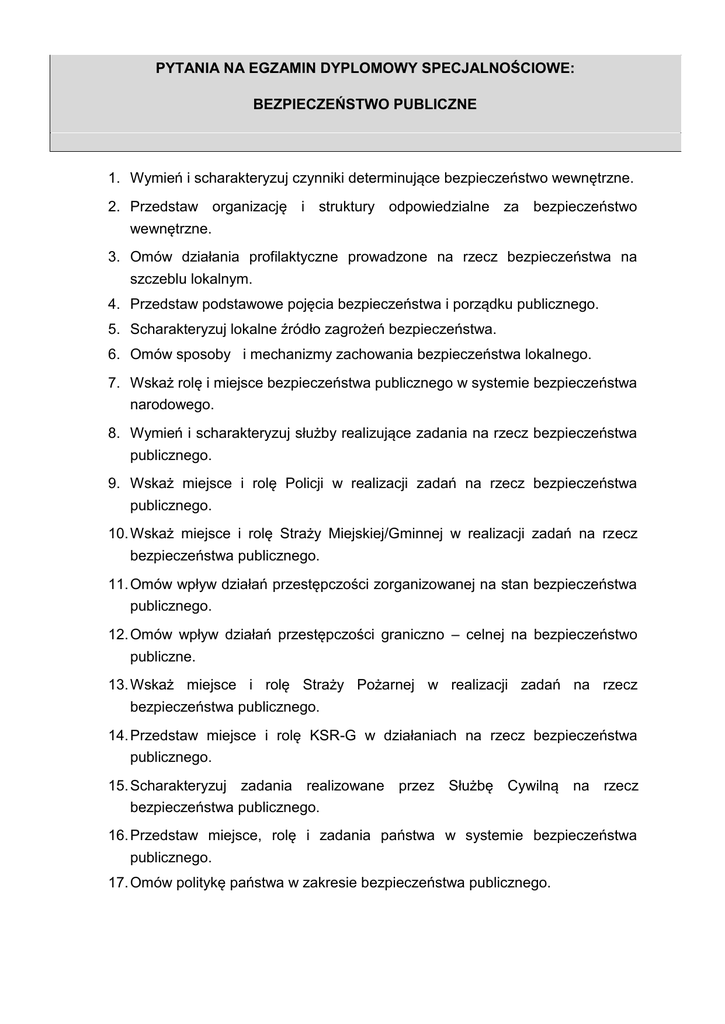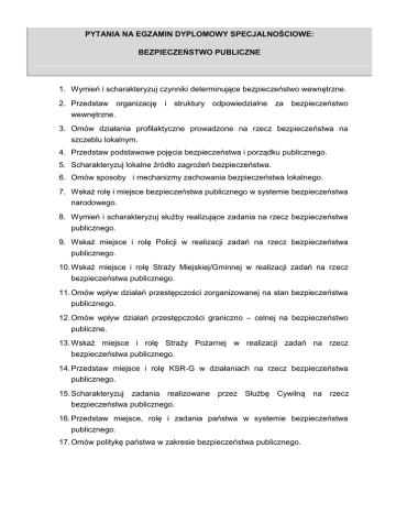 PYTANIA NA EGZAMIN DYPLOMOWY SPECJALNOŚCIOWE: BEZPIECZEŃSTWO PUBLICZNE 1. Wymień i scharakteryzuj czynniki determinujące bezpieczeństwo wewnętrzne. 2. Przedstaw organizację i struktury odpowiedzialne za bezpieczeństwo wewnętrzne. 3. Omów działania profilaktyczne prowadzone na rzecz bezpieczeństwa na szczeblu lokalnym. 4. Przedstaw podstawowe pojęcia bezpieczeństwa i porządku publicznego. 5. Scharakteryzuj lokalne źródło zagrożeń bezpieczeństwa. 6. Omów sposoby i mechanizmy zachowania bezpieczeństwa lokalnego. 7. Wskaż rolę i miejsce bezpieczeństwa publicznego w systemie bezpieczeństwa narodowego. 8. Wymień i scharakteryzuj służby realizujące zadania na rzecz bezpieczeństwa publicznego. 9. Wskaż miejsce i rolę Policji w realizacji zadań na rzecz bezpieczeństwa publicznego. 10. Wskaż miejsce i rolę Straży Miejskiej/Gminnej w realizacji zadań na rzecz bezpieczeństwa publicznego. 11. Omów wpływ działań przestępczości zorganizowanej na stan bezpieczeństwa publicznego. 12. Omów wpływ działań przestępczości graniczno – celnej na bezpieczeństwo publiczne. 13. Wskaż miejsce i rolę Straży Pożarnej w realizacji zadań na rzecz bezpieczeństwa publicznego. 14. Przedstaw miejsce i rolę KSR-G w działaniach na rzecz bezpieczeństwa publicznego. 15. Scharakteryzuj zadania realizowane przez Służbę Cywilną na rzecz bezpieczeństwa publicznego. 16. Przedstaw miejsce, rolę i zadania państwa w systemie bezpieczeństwa publicznego. 17. Omów politykę państwa w zakresie bezpieczeństwa publicznego. 18. Wskaż miejsce, rolę i zadania obywateli w systemie bezpieczeństwa publicznego. 19. Omów wpływ zasady „zanieczyszczający płaci” na bezpieczeństwo publiczne. 20. Wskaż zagrożenia, które są wynikiem działań człowieka. Które z nich wpływają na stan bezpieczeństwa publicznego?