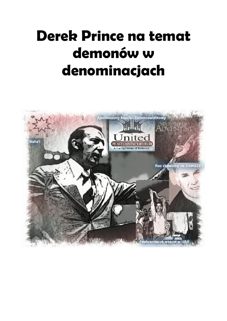 Derek Prince na temat demonów w denominacjach W jednym z wykładów na temat uwolnienia od demonów, Derek Prince uczestniczył w panelu pytań i odpowiedzi. W pewnym momencie opowiada o pewnej kobiecie, Chrześcijance, która w rezultacie uwolnienia mającego miejsce w hotelu Hilton, została uwolniona od 72 demonów. Derek Prince dzieli się z uczestnikami odnośnie niektórych z nich. „Spędziliśmy, ja i moja zona, 5 godzin modląc się o uwolnienie tej kobiety a kobieta siedząca za nami...liczyła i naliczyła imiona 72 demonów, które podały swoje imię i wyszły z niej. Jestem przekonany, ze jest wielu ludzi, którzy maja więcej niż 72 duchy. W Biblii mamy człowieka, który posiadał w sobie Legion demonów, co daje nam 6000 demonów w nim. Gdy minęło ok 1/3 czasu uwolnienia z ta kobieta, każdy demon przemówi. Ja nie kazałem im tego robić. W rzeczywistości to one zaczęły zagadywać, za czym nawet się połapałem co się dzieje. Jeden z nich powiedział: Jestem duchem zwodniczym. Wiec powiedziałem: wychodź! A on odparł: jestem zwodzicielem od wiary. A ja na to: to tym bardziej wyłaz! A on dalej : jestem szefem! A ja: no to dawaj na zewnątrz! A następnie odparł: mam wiele korzeni. A ja : No to wychodź, z wszystkimi korzeniami!W imieniu Jezusa! A wtedy, ta kobieta zaczęła wymieniać pewne doktryny i w pewien sposób się zachowywać. I po paru minutach, zdałem sobie sprawę, ze to były korzenie duchów zwodniczych. I złapałem za tabliczkę, z nazwa Konrad Hilton na gorze, i zapisałem je. I właściwie zanotowałem 37 rożnych demonów zwodzenia. Każde z nich opuściło ta dziewczynę. Wszystkie znalazły się pod kategoria : duchów zwodniczych. Ludzie zapytali mnie o nie. Nie mam listy przy sobie i nie pamiętam ich wszystkich. Czasem myślę,ze przez ich wymienienie mogę obrazić niektórych ludzi, ale myślę , tego popołudnia powiem wam niektóre z tych imion/ nazw. Pierwszy który wyszedł nosił nazwę: Raz zbawiony, na zawsze zbawiony/ Eternal security Około 2 czy 3 go to był: Zielonoświątkowcy Jednościowi / Jesus only … Jeden z demonów który wyszedł z niej był, i nie chce zgorszyć nikogo, a był to: Adwentyści Dnia Siódmego Który jak wiecie można prześledzić wstecz do kobiety, która miała 'objawienie' … jednak to było fałszywe, demoniczne objawienie... Był jeszcze inny demon. Jej cale ciało zaczęło się podnosić i zaczęła syczeć. A ja spytałem: kim jesteś? Odparł: czczenie węży. Zapytałem: A skąd pochodzisz? Odparł: głownie z Arkansas, w Teksasie. Oni myślą, ze nie robimy krzywdy, a nie wiedza ze jesteśmy zabójczy. Bo wiecie, w tym obszarze występują tzw snake handlers1, czyli poskramiacze węży, w odłamie Zielonoświątkowców z Ameryki... Co mnie to nauczyło ? Jeśli nie pilnujemy siebie i nie rozsadzamy, jesteśmy w wielkim niebezpieczeństwie bycia ogłupionym przez religijne show. Wg mojej opinii, najbardziej niebezpiecznymi demonami są te religijne. Sa 2 razy bardziej niebezpieczne, niż reszta razem wzięta. Od tego czasu wielokrotnie rozpoznawałem działającego religijnego ducha podczas rożnego rodzaju spotkań. O, i jeszcze inny, to było : fałszywe proroctwo. Powiedziałem: skąd się wzieles? O z pewnego zboru, zboru Zielonoświątkowego i byłem w angielce. Inny, to było ciekawe, nazwał się Baha'i.2 Wiec znowu pytam: skąd 1 http://holiness-snake-handlers.webs.com/ 2 „bahaizm łączy w sobie, między innymi, elementy judaizmu, chrześcijaństwa, islamu i babizmu. Według wierzeń pochodzisz? Od instruktorki pielęgniarstwa w szpitalu, w pewnym mieście w Kanadzie... To wszystko daje nam ostrzeżenie. Przynajmniej to dało mnie. Powiem wam, te 5 godzin przyniosło więcej dobra niż 5 lat w szkole biblijnej. Nauczyłem się więcej i od tego czasu próbuje być czujnym aby nie dać się ogłupić. I chce powiedzieć każdemu tu obecnemu człowiekowi, i mam nadzieje ze mnie źle nie zrozumiecie. Jest cieniutka linia oddzielająca prawdziwa rzecz od tej zlej. A my musimy być czujni. ” Te i inne kazania można zamówić bądź ściągnąć na stronie Lake Hamilton Bible Camp:3 Polecam każdemu! bahaickich historia religii stopniowo rozwijała się poprzez ciąg boskich posłańców, z których każdy założył religię dostosowaną do danych czasów oraz zdolności rozumienia ludzi w tym okresie. Wśród posłańców byli Kryszna, Abraham, Budda, Jezus, Mahomet i inni, a ostatnio Bahá'u'lláh. ”WIKIPEDIA 3 http://lhbconline.com/