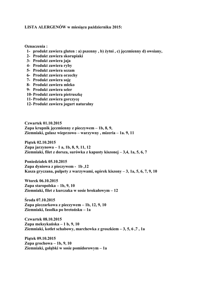 LISTA ALERGENÓW w miesiącu październiku 2015: Oznaczenia : 1- produkt zawiera gluten : a) pszenny , b) żytni , c) jęczmienny d) owsiany, 2- Produkt zawiera skorupiaki 3- Produkt zawiera jaja 4- Produkt zawiera ryby 5- Produkt zawiera sezam 6- Produkt zawiera orzechy 7- Produkt zawiera soję 8- Produkt zawiera mleko 9- Produkt zawiera seler 10- Produkt zawiera pietruszkę 11- Produkt zawiera gorczycę 12- Produkt zawiera jogurt naturalny Czwartek 01.10.2015 Zupa krupnik jęczmienny z pieczywem – 1b, 8, 9, Ziemniaki, gulasz wieprzowo – warzywny , mizeria – 1a. 9, 11 Piątek 02.10.2015 Zupa jarzynowa – 1 a, 1b, 8, 9, 11, 12 Ziemniaki, filet z dorsza, surówka z kapusty kiszonej – 3,4, 1a, 5, 6, 7 Poniedziałek 05.10.2015 Zupa dyniowa z pieczywem - 1b ,12 Kasza gryczana, pulpety z warzywami, ogórek kiszony – 3, 1a, 5, 6, 7, 9, 10 Wtorek 06.10.2015 Zupa staropolska – 1b, 9, 10 Ziemniaki, filet z kurczaka w sosie brokułowym – 12 Środa 07.10.2015 Zupa pieczarkowa z pieczywem – 1b, 12, 9, 10 Ziemniaki, fasolka po bretońsku – 1a Czwartek 08.10.2015 Zupa meksykańska – 1 b, 9, 10 Ziemniaki, kotlet schabowy, marchewka z groszkiem – 3, 5, 6 ,7 , 1a Piątek 09.10.2015 Zupa grochowa – 1b, 9, 10 Ziemniaki, gołąbki w sosie pomidorowym – 1a Poniedziałek 12.10.2015 Zupa kalafiorowa – 1b, 12, 9 ,10 Ryż, kurczak azjatycki z warzywami - 9, 10 Wtorek 13.10.2015 Zupa pomidorowa z makaronem – 1 a ,9 ,10 Ziemniaki, kotlet mielony, surówka z buraczków - 3, 5, 6, 7 , 1a Środa 14.10.2015 Zupa brokułowa z pieczywem – 1b , 12 Ziemniaki, udko pieczone , fasola szparagowa – brak Czwartek 15.10.2015 Zupa wiejska z pieczywem – 1 b , 9, 10 Schab pieczony , ziemniaki, surówka wiosenna – brak Piątek 16.10.2015 Zupa żurek z jajkiem i pieczywem – 3, 1b Makaron z serem i okrasą – 1a, 8 Poniedziałek 19.10.2015 Zupa ogórkowa z pieczywem – 1b, 9, 10, 12 Spaghetti – 1a Wtorek 20.10.2015 Zupa krupnik ryżowy z pieczywem – 9, 10, 1b Ziemniaki, klops w sosie koperkowym, surówka jesienna – 1a, 3, 5, 6, 7 Środa 21.10.2015 Zupa barszcz ukraiński z pieczywem – 1b, 9, 10 Ziemniaki, schab po sztygarsku, kapusta zasmażana – 1a Czwartek 22.10.2015 Zupa gulaszowa z pieczywem – 9, 10, 1b Ziemniaki, kotlet pożarski, surówka colesław – 3, 5, 6, 7 Piątek 23.10.2015 Zupa groszkowa z pieczywem – 9, 10, 1b, 12 Ziemniaki, figurki rybne , surówka z marchewki – 12 Poniedziałek 26.10.2015 Zupa szczawiowa z pieczywem – 12, 1b , 9 ,10 Kasza jęczmienna, gulasz , surówka szwedzka – 1a Wtorek 27.10.2015 Zupa z soczewicy z pieczywem – 1b Ziemniaki, bigos – brak Środa 28.10.2015 Rosół z makaronem – 1a Ziemniaki, potrawka z kurczaka, kapusta pekińska – 12, 1a, 9, 10, Czwartek 29.10.2015 Kapuśniak mazurski z pieczywem – 1b , 9 ,10 Ziemniaki, karczek pieczony, surówka z buraczków – brak Piątek 30.10.2015 Zupa bawarska – 12, 9, 10 Ziemniaki, pulpety rybne, surówka z kapusty kiszonej – 3, 1a, 5, 6, 7