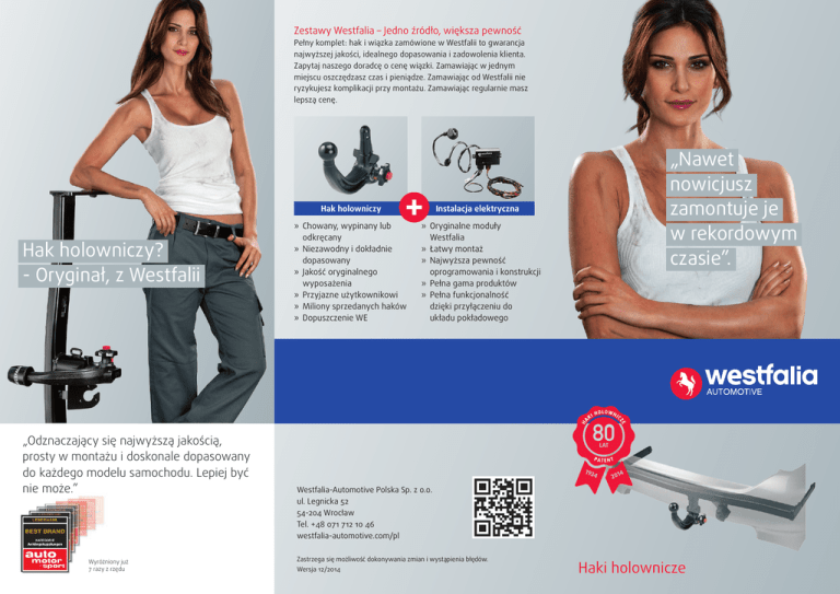 Zestawy Westfalia – Jedno źródło, większa pewność Pełny komplet: hak i wiązka zamówione w Westfalii to gwarancja najwyższej jakości, idealnego dopasowania i zadowolenia klienta. Zapytaj naszego doradcę o cenę wiązki. Zamawiając w jednym miejscu oszczędzasz czas i pieniądze. Zamawiając od Westfalii nie ryzykujesz komplikacji przy montażu. Zamawiając regularnie masz lepszą cenę. Hak holowniczy Hak holowniczy? - Oryginał, z Westfalii „Odznaczający się najwyższą jakością, prosty w montażu i doskonale dopasowany do każdego modelu samochodu. Lepiej być nie może.” Wyróżniony już 7 razy z rzędu »» Chowany, wypinany lub odkręcany »» Niezawodny i dokładnie dopasowany »» Jakość oryginalnego wyposażenia »» Przyjazne użytkownikowi »» Miliony sprzedanych haków »» Dopuszczenie WE Instalacja elektryczna »» Oryginalne moduły Westfalia »» Łatwy montaż »» Najwyższa pewność oprogramowania i konstrukcji »» Pełna gama produktów »» Pełna funkcjonalność dzięki przyłączeniu do układu pokładowego „Nawet nowicjusz zamontuje je w rekordowym czasie”. Westfalia-Automotive Polska Sp. z o.o. ul. Legnicka 52 54-204 Wrocław Tel. +48 071 712 10 46 westfalia-automotive.com/pl Zastrzega sie˛ możliwos�c� dokonywania zmian i wysta˛pienia błe˛dów. Wersja 12/2014 Haki holownicze Haki holownicze Westfalia-Automotive Chowany Wypinany automatycznie Belki holownicze Odkręcany na śruby Oryginał - a co innego? Znakomita marka Westfalia została ukształtowana przez najwyższej jakości haki holownicze, które opracowane zostały w ścisłej współpracy z przemysłem motoryzacyjnym specjalnie dla odpowiednich modeli samochodów. Wynikiem tego jest idealne dopasowanie i szybki montaż produktu. Stan projektowania oraz procesów produkcyjnych zapewnia najwyższą jakość i perfekcyjne dopasowanie haków holowniczych. Składają się na to takie elementy jak projektowanie 3D w systemie CAD, korzystanie z robotów spawalniczych, wycinanie laserowe i indywidualne dopasowanie za pomocą centrum procesowego CNC. W celu zapewnienia najwyższej jakości co do zabezpieczenia antykorozyjnego stosowane jest zanurzeniowe malowanie metodą katodową. Oczywiście wszystkie modele są testowane zgodnie z normami przemysłu motoryzacyjnego i posiadają wymagane homologacje EC. W chwili obecnej Westfalia, mając w ofercie ponad 1700 modeli jest w stanie dostarczyć rozwiązanie dla niemal wszystkich europejskich modeli samochodów – wszystko w 24 godziny na rynku niezależnym. Innowacja HAKI HOLOWNICZE CHOWANE Niewidoczny a przy tym zawsze gotowy do użycia: Haki chowane są najnowszym osiągnięciem rozwoju Westfalii i zapewniają wygodne i łatwe użytkowanie. System chowany jest zawsze gotowy do natychmiastowego użycia i całkowicie niewidoczny kiedy nie jest używany. W razie potrzeby hak jest wychylany zza zderzaka w kilka sekund – ręcznie lub elektrycznie. Kiedy nie jest potrzebny pozostaje niewidoczny za zderzakiem. Klasyka HAKI HOLOWNICZE ODKRĘCANE NA ŚRUBY Hak stały jest tańszym rozwiązaniem i najbardziej właściwym do codziennego używania. Jest to funkcjonalne i łatwe w montażu rozwiązanie. Bestseller HAKI HOLOWNICZE WYPINANE AUTOMATYCZNIE Wraz ze wzrostem zainteresowania estetycznym wyglądem samochodów, system wypinany cieszy się ogromną popularnością. Kiedy drążek kulowy jest zdjęty, na pojeździe nie ma śladu haka. Dodatkowo zabezpieczyliśmy go zamkiem przed kradzieżą kuli. Waga ciężka BELKI HOLOWNICZE Dostępne do każdej ciężarówki do 7,5 ton i dla aut dostawczych do 3,5 tony.