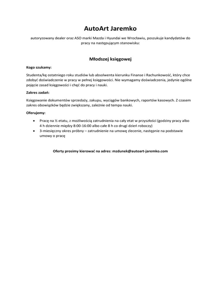 AutoArt Jaremko autoryzowany dealer oraz ASO marki Mazda i Hyundai we Wrocławiu, poszukuje kandydatów do pracy na następującym stanowisku: Młodszej księgowej Kogo szukamy: Studenta/kę ostatniego roku studiów lub absolwenta kierunku Finanse i Rachunkowość, który chce zdobyć doświadczenie w pracy w pełnej księgowości. Nie wymagamy doświadczenia, jedynie ogólne pojęcie zasad księgowości i chęć do pracy i nauki. Zakres zadań: Księgowanie dokumentów sprzedaży, zakupu, wyciągów bankowych, raportów kasowych. Z czasem zakres obowiązków będzie zwiększany, zależnie od tempa nauki. Oferujemy: Pracę na ½ etatu, z możliwością zatrudnienia na cały etat w przyszłości (godziny pracy albo 4 h dziennie między 8:00-16:00 albo całe 8 h co drugi dzień roboczy) 3-miesięczny okres próbny – zatrudnienie na umowę zlecenie, następnie na podstawie umowy o pracę Oferty prosimy kierować na adres: [email protected]