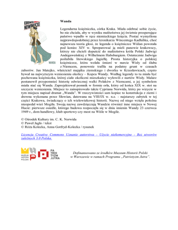 Wanda Legendarna księżniczka, córka Kraka. Miała odebrać sobie życie, bo nie chciała, aby w wyniku małżeństwa jej świetnie prosperujące państwo wpadło w ręce niemieckiego księcia. Postać wymyślona najprawdopodobniej przez kronikarza Wincentego Kadłubka, choć najnowsza teoria głosi, że legenda o księżniczce Wiślan powstała pod koniec XIV w. Spreparować ją mieli panowie krakowscy, którzy nie chcieli dopuścić do małżeństwa króla Polski Jadwigi Andegaweńskiej z Wilhelmem Habsburgiem. Ostatecznie Jadwiga poślubiła litewskiego Jagiełłę. Prosta historyjka o polskiej księżniczce, która wolała śmierć w nurcie Wisły od ślubu z Niemcem, ponownie trafiła na podatny grunt w czasach zaborów. Jan Matejko, właściciel majątku ziemskiego i dworku w Krzesławicach, często bywał na najwyższym wzniesieniu okolicy – Kopcu Wandy. Według legendy to tu miała być pochowana księżniczka, której ciało okoliczni mieszkańcy wyłowili z nurtów Wisły. Malarz postanowił przypomnieć historię odwiecznej walki Polaków z Niemcami, a jej symbolem miała stać się Wanda. Zaprojektował pomnik w formie orła, który od końca XIX w. stoi na szczycie wzniesienia. Miejsce to zainspirowało także Cypriana Norwida, który po wizycie w tym miejscu napisał dramat „Wanda”. W rzeczywistości sam kopiec to konstrukcja z ziemi i drewna wykonana przez Słowian, datowana na VIII/IX w. n.e. - najstarszy zabytek w tej części Krakowa, świadczący o ich wielowiekowej historii. Nazwę od niego wzięła położna nieopodal wieś Mogiła. Swoją nazwę zawdzięczają Wandzie również inne miejsca w Nowej Hucie: pierwsze osiedle, którego budowa rozpoczęła się w dniu imienin Wandy 23 czerwca 1949 r., dom handlowy, klub sportowy czy most na Wiśle w Mogile. © Ośrodek Kultury im. C. K. Norwida © Paweł Jagło / tekst © Róża Kolecka, Anna Gotfryd-Kolecka / rysunek Licencja Creative Commons Uznanie autorstwa - Użycie niekomercyjne - Bez utworów zależnych 3.0 Polska. Dofinansowano ze środków Muzeum Historii Polski w Warszawie w ramach Programu „Patriotyzm Jutra”.