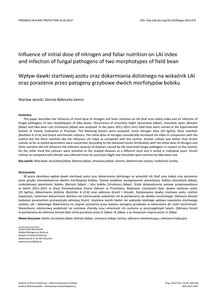 PROGRESS IN PLANT PROTECTION 54 (4) 2014 DOI: http://dx.doi.org/10.14199/ppp-2014-073 Influence of initial dose of nitrogen and foliar nutrition on LAI index and infection of fungal pathogens of two morphotypes of field bean Wpływ dawki startowej azotu oraz dokarmiania dolistnego na wskaźnik LAI oraz porażenie przez patogeny grzybowe dwóch morfotypów bobiku Wacław Jarecki, Dorota Bobrecka-Jamro Summary This paper describes the influence of initial dose of nitrogen and foliar nutrition on LAI (leaf area index) index and on infection of fungal pathogens of two morphotypes of faba beans. Occurrence of ascochyta blight (Ascochyta fabae), chocolate spots (Botrytis fabae) and faba bean rust (Uromyces fabae) was analysed. In the years 2011–2013 strict field tests were carried at the Experimental Station of Variety Evaluation in Przecław. The following factors were analysed: initial nitrogen dose (25 kg/ha), foliar nutrition (Basfoliar 6-12-6) and Granit and Amulet cultivars. The initial dose of nitrogen considerably increased LAI index in comparison with the control but the foliar nutrition did not influence LAI index as compared with the control. Amulet cultivar was better than Granit cultivar as far as tested parameters were concerned. According to the obtained results fertilization with the initial dose of nitrogen and foliar nutrition did not influence the infection severity of diseases caused by the examined fungal pathogens in respect to the control. On the other hand the cultivars were sensitive to the studied diseases at a different level and it varied in individual years. Granit cultivar as compared with Amulet was infected more by ascochyta blight and chocolate spots and less by faba bean rust. Key words: field bean; Ascochyta fabae; Botrytis fabae; Uromyces fabae; tannins; determinate variety; traditional variety Streszczenie W pracy określono wpływ dawki startowej azotu oraz dokarmiania dolistnego na wskaźnik LAI (leaf area index) oraz porażenie przez grzyby chorobotwórcze dwóch morfotypów bobiku. Ocenie poddano występowanie askochytozy bobiku (Ascochyta fabae), czekoladowej plamistości bobiku (Botrytis fabae) i rdzy bobiku (Uromyces fabae). Ścisłe doświadczenie polowe przeprowadzono w latach 2011–2013 w Stacji Doświadczalnej Oceny Odmian w Przecławiu. Badanymi czynnikami były: dawka startowa azotu (25 kg/ha), dokarmianie dolistne (Basfoliar 6-12-6) oraz odmiany Granit i Amulet. Zastosowana dawka startowa azotu istotnie zwiększyła, natomiast dokarmianie dolistne nie zróżnicowało wskaźnika LAI w porównaniu do obiektu kontrolnego. Odmiana Amulet badanym parametrem przewyższyła odmianę Granit. Uzyskane wyniki badań nie wykazały istotnego wpływu nawożenia startowego azotem, jak i dolistnego dokarmiania na stopień porażenia przez badane patogeny grzybowe w odniesieniu do roślin kontrolnych. Stwierdzono odmianową podatność na oceniane choroby oraz zmienność ich nasilenia w poszczególnych latach. Odmiana Granit w porównaniu do odmiany Amulet była silniej porażona przez A. fabae i B. fabae, a w mniejszym stopniu przez U. fabae. Słowa kluczowe: bobik; Ascochyta fabae; Botrytis fabae; Uromyces fabae; taniny; odmiana samokończąca; odmiana tradycyjna Uniwersytet Rzeszowski Wydział Biologiczno-Rolniczy Katedra Produkcji Roślinnej Zelwerowicza 4, 35-601 Rzeszów [email protected] Institute of Plant Protection – National Research Institute Instytut Ochrony Roślin – Państwowy Instytut Badawczy Prog. Plant Prot. 54 (4): 430-436 ISSN 1427-4337 Progress in Plant Protection 54 (4) 2014 Wstęp / Introduction Stopień i nasilenie porażenia roślin bobowatych przez patogeny zależy od wielu czynników, m.in.: warunków pogodowych, zabiegów agrotechnicznych (Kurowski i wsp. 2006), odmiany, zainfekowania gleby i otoczenia plantacji oraz zdrowotności materiału siewnego. HoroszkiewiczJanka i wsp. (2013) podają, że wysokość strat w plonach bobowatych spowodowanych występowaniem chorób szacuje się średnio na 15%, ale mogą wynieść nawet 80%. Do ważniejszych chorób bobiku należą askochytoza bobiku i czekoladowa plamistość bobiku, natomiast rdza bobiku jest groźniejsza dla odmian później dojrzewających. Zwalczanie chorób w czasie wegetacji polega zwykle na zastosowaniu środków chemicznych, przy czym liczba zarejestrowanych fungicydów dla bobiku w ostatnich latach znacząco spadła. W efekcie tego możliwości chemicznego zwalczania niektórych chorób zostały ograniczone (Horoszkiewicz-Janka i wsp. 2013). Fernández-Aparicio i wsp. (2011) za korzystną w tej sytuacji uważają szerszą uprawę mieszanek strączkowo-zbożowych. Potwierdzają to wyniki ich doświadczeń w różnych warunkach siedliskowych. Z badań Kuliga i wsp. (2006) wynika, że dwukrotne stosowanie fungicydów powoduje przeciętny przyrost plonu nasion bobiku o 5,6% w odniesieniu do kontroli, przy czym efektywność stosowanych zabiegów ochrony roślin była większa u odmiany tradycyjnej. Księżak i Kuś (2005) stosując ochronę przed chorobami i szkodnikami w konwencjonalnej uprawie bobiku uzyskali wyraźnie wyższy plon nasion i wzrost komponentów plonu. Kulig i wsp. (2009) wskazali na mniejszą skuteczność ekologicznych środków ochrony roślin w porównaniu do syntetycznych. Kolasińska i Wiewióra (2002) oraz Dłużniewska i wsp. (2007) stwierdzili podobną podatność na choroby nisko- i wysokotaninowych form bobiku. Kolasińska i Wiewióra (2002) potwierdziły jednak niższą zdrowotność i odporność na warunki środowiska nasion odmiany niskotaninowej. Dłużniewska i wsp. (2010) za bardzo ważne w tym aspekcie wskazują badania nad przyczynami występowania i nasilenia chorób powodowanych przez grzyby oraz odpornością na czynniki stresowe u bobiku. Roślina ta w uprawie na nasiona posiada wysoką zdolność plonotwórczą, przy czym zmienną w latach (Kulig i Zając 2007; Stępnik i Le-piarczyk 2009; Jerzak i wsp. 2012). Ze względu
