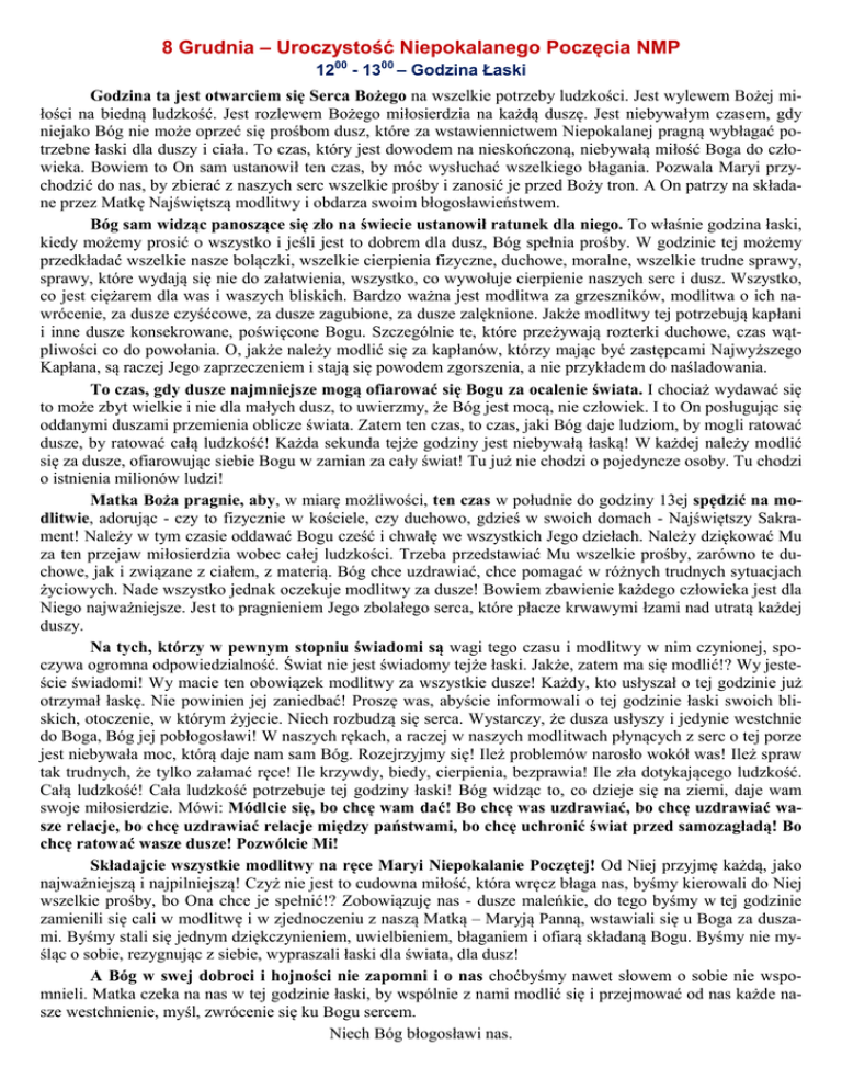 8 Grudnia – Uroczystość Niepokalanego Poczęcia NMP 1200 - 1300 – Godzina Łaski Godzina ta jest otwarciem się Serca Bożego na wszelkie potrzeby ludzkości. Jest wylewem Bożej miłości na biedną ludzkość. Jest rozlewem Bożego miłosierdzia na każdą duszę. Jest niebywałym czasem, gdy niejako Bóg nie może oprzeć się prośbom dusz, które za wstawiennictwem Niepokalanej pragną wybłagać potrzebne łaski dla duszy i ciała. To czas, który jest dowodem na nieskończoną, niebywałą miłość Boga do człowieka. Bowiem to On sam ustanowił ten czas, by móc wysłuchać wszelkiego błagania. Pozwala Maryi przychodzić do nas, by zbierać z naszych serc wszelkie prośby i zanosić je przed Boży tron. A On patrzy na składane przez Matkę Najświętszą modlitwy i obdarza swoim błogosławieństwem. Bóg sam widząc panoszące się zło na świecie ustanowił ratunek dla niego. To właśnie godzina łaski, kiedy możemy prosić o wszystko i jeśli jest to dobrem dla dusz, Bóg spełnia prośby. W godzinie tej możemy przedkładać wszelkie nasze bolączki, wszelkie cierpienia fizyczne, duchowe, moralne, wszelkie trudne sprawy, sprawy, które wydają się nie do załatwienia, wszystko, co wywołuje cierpienie naszych serc i dusz. Wszystko, co jest ciężarem dla was i waszych bliskich. Bardzo ważna jest modlitwa za grzeszników, modlitwa o ich nawrócenie, za dusze czyśćcowe, za dusze zagubione, za dusze zalęknione. Jakże modlitwy tej potrzebują kapłani i inne dusze konsekrowane, poświęcone Bogu. Szczególnie te, które przeżywają rozterki duchowe, czas wątpliwości co do powołania. O, jakże należy modlić się za kapłanów, którzy mając być zastępcami Najwyższego Kapłana, są raczej Jego zaprzeczeniem i stają się powodem zgorszenia, a nie przykładem do naśladowania. To czas, gdy dusze najmniejsze mogą ofiarować się Bogu za ocalenie świata. I chociaż wydawać się to może zbyt wielkie i nie dla małych dusz, to uwierzmy, że Bóg jest mocą, nie człowiek. I to On posługując się oddanymi duszami przemienia oblicze świata. Zatem ten czas, to czas, jaki Bóg daje ludziom, by mogli ratować dusze, by ratować całą ludzkość! Każda sekunda tejże godziny jest niebywałą łaską! W każdej należy modlić się za dusze, ofiarowując siebie Bogu w zamian za cały świat! Tu już nie chodzi o pojedyncze osoby. Tu chodzi o istnienia milionów ludzi! Matka Boża pragnie, aby, w miarę możliwości, ten czas w południe do godziny 13ej spędzić na modlitwie, adorując - czy to fizycznie w kościele, czy duchowo, gdzieś w swoich domach - Najświętszy Sakrament! Należy w tym czasie oddawać Bogu cześć i chwałę we wszystkich Jego dziełach. Należy dziękować Mu za ten przejaw miłosierdzia wobec całej ludzkości. Trzeba przedstawiać Mu wszelkie prośby, zarówno te duchowe, jak i związane z ciałem, z materią. Bóg chce uzdrawiać, chce pomagać w różnych trudnych sytuacjach życiowych. Nade wszystko jednak oczekuje modlitwy za dusze! Bowiem zbawienie każdego człowieka jest dla Niego najważniejsze. Jest to pragnieniem Jego zbolałego serca, które płacze krwawymi łzami nad utratą każdej duszy. Na tych, którzy w pewnym stopniu świadomi są wagi tego czasu i modlitwy w nim czynionej, spoczywa ogromna odpowiedzialność. Świat nie jest świadomy tejże łaski. Jakże, zatem ma się modlić!? Wy jesteście świadomi! Wy macie ten obowiązek modlitwy za wszystkie dusze! Każdy, kto usłyszał o tej godzinie już otrzymał łaskę. Nie powinien jej zaniedbać! Proszę was, abyście informowali o tej godzinie łaski swoich bliskich, otoczenie, w którym żyjecie. Niech rozbudzą się serca. Wystarczy, że dusza usłyszy i jedynie westchnie do Boga, Bóg jej pobłogosławi! W naszych rękach, a raczej w naszych modlitwach płynących z serc o tej porze jest niebywała moc, którą daje nam sam Bóg. Rozejrzyjmy się! Ileż problemów narosło wokół was! Ileż spraw tak trudnych, że tylko załamać ręce! Ile krzywdy, biedy, cierpienia, bezprawia! Ile zła dotykającego ludzkość. Całą ludzkość! Cała ludzkość potrzebuje tej godziny łaski! Bóg widząc to, co dzieje się na ziemi, daje wam swoje miłosierdzie. Mówi: Módlcie się, bo chcę wam dać! Bo chcę was uzdrawiać, bo chcę uzdrawiać wasze relacje, bo chcę uzdrawiać relacje między państwami, bo chcę uchronić świat przed samozagładą! Bo chcę ratować wasze dusze! Pozwólcie Mi! Składajcie wszystkie modlitwy na ręce Maryi Niepokalanie Poczętej! Od Niej przyjmę każdą, jako najważniejszą i najpilniejszą! Czyż nie jest to cudowna miłość, która wręcz błaga nas, byśmy kierowali do Niej wszelkie prośby, bo Ona chce je spełnić!? Zobowiązuję nas - dusze maleńkie, do tego byśmy w tej godzinie zamienili się cali w modlitwę i w zjednoczeniu z naszą Matką – Maryją Panną, wstawiali się u Boga za duszami. Byśmy stali się jednym dziękczynieniem, uwielbieniem, błaganiem i ofiarą składaną Bogu. Byśmy nie myśląc o sobie, rezygnując z siebie, wypraszali łaski dla świata, dla dusz! A Bóg w swej dobroci i hojności nie zapomni i o nas choćbyśmy nawet słowem o sobie nie wspomnieli. Matka czeka na nas w tej godzinie łaski, by wspólnie z nami modlić się i przejmować od nas każde nasze westchnienie, myśl, zwrócenie się ku Bogu sercem. Niech Bóg błogosławi nas.