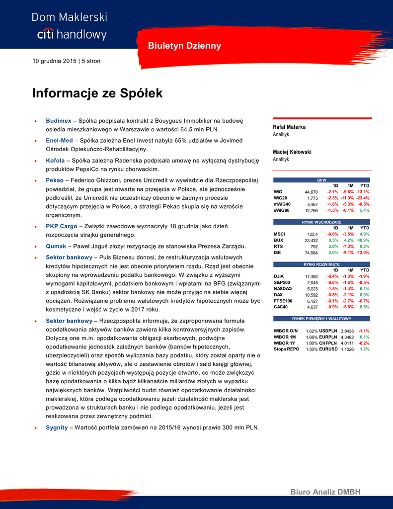 Biuletyn Dzienny 10 grudnia 2015 | 5 stron Informacje ze Spółek Budimex – Spółka podpisała kontrakt z Bouygues Immobilier na budowę osiedla mieszkaniowego w Warszawie o wartości 64,5 mln PLN. Kofola – Spółka zależna Radenska podpisała umowę na wyłączną dystrybucję produktów PepsiCo na rynku chorwackim. Pekao – Federico Ghizzoni, prezes Unicredit w wywiadzie dla Rzeczpospolitej powiedział, że grupa jest otwarta na przejęcia w Polsce, ale jednocześnie podkreślił, że Unicredit nie uczestniczy obecnie w żadnym procesie dotyczącym przejęcia w Polsce, a strategii Pekao skupia się na wzroście organicznym. PKP Cargo – Związki zawodowe wyznaczyły 18 grudnia jako dzień rozpoczęcia strajku generalnego. Qumak – Paweł Jaguś złożył rezygnację ze stanowiska Prezesa Zarządu. Sektor bankowy – Puls Biznesu donosi, że restrukturyzacja walutowych kredytów hipotecznych nie jest obecnie priorytetem rządu. Rząd jest obecnie skupiony na wprowadzeniu podatku bankowego. W związku z wyższymi wymogami kapitałowymi, podatkiem bankowym i wpłatami na BFG (związanymi z upadłością SK Banku) sektor bankowy nie może przyjąć na siebie więcej obciążeń. Rozwiązanie problemu walutowych kredytów hipotecznych może być kosmetyczne i wejść w życie w 2017 roku. Analityk Enel-Med – Spółka zależna Enel Invest nabyła 65% udziałów w Jovimed Ośrodek Opiekuńczo-Rehabilitacyjny. Rafał Materka Sektor bankowy – Rzeczpospolita informuje, że zaproponowana formuła opodatkowania aktywów banków zawiera kilka kontrowersyjnych zapisów. Dotyczą one m.in. opodatkowania obligacji skarbowych, podwójne opodatkowanie jednostek zależnych banków (banków hipotecznych, Maciej Kałowski Analityk GPW WIG WIG20 mWIG40 sWIG80 44,670 1,773 3,467 12,766 1D -2.1% -2.3% -1.8% -1.5% 1M YTD -9.6% -13.1% -11.9% -23.4% -5.3% -0.5% -6.1% 5.4% RYNKI WSCHODZĄCE MSCI BUX RTS ISE 122.4 23,432 792 74,584 1D 1M YTD -0.6% -3.5% 4.9% 0.5% 4.2% 40.9% 2.0% -7.3% 0.2% 2.0% -9.1% -13.0% RYNKI ROZWINIĘTE DJIA S&P500 NASDAQ DAX FTSE100 CAC40 17,492 2,048 5,023 10,592 6,127 4,637 1D -0.4% -0.8% -1.5% -0.8% -0.1% -0.9% 1M -1.3% -1.5% -1.4% -2.1% -2.7% -5.6% YTD -1.9% -0.5% 6.1% 8.0% -6.7% 8.5% RYNEK PIENIĘŻNY I WALUTOWY WIBOR O/N WIBOR 1M WIBOR 1Y Stopa REPO 1.62% 1.66% 1.80% 1.50% USDPLN EURPLN CHFPLN EURUSD 3.9438 4.3482 4.0111 1.1026 -1.1% 0.1% -0.2% 1.2% ubezpieczycieli) oraz sposób wyliczania bazy podatku, który został oparty nie o wartość bilansową aktywów, ale o zestawienie obrotów i sald księgi głównej, gdzie w niektórych pozycjach występują pozycje otwarte, co może zwiększyć bazę opodatkowania o kilka bądź kilkanaście miliardów złotych w wypadku największych banków. Wątpliwości budzi również opodatkowanie działalności maklerskiej, która podlega opodatkowaniu jeżeli działalność maklerska jest prowadzona w strukturach banku i nie podlega opodatkowaniu, jeżeli jest realizowana przez zewnętrzny podmiot. Sygnity – Wartość portfela zamówień na 2015/16 wynosi prawie 300 mln PLN. Biuro Analiz DMBH Biuletyn dzienny 10 grudnia 2015 Transakcje Ropczyce – Józef Siwiec (Prezes Zarządu) nabył 1.260 akcji po 20,26 PLN za udział. Kalendarium Spółek Aiton Caldwell – NWZA w sprawie zmian w radzie nadzorczej. Apator – Pierwszy dzień obrotu bez prawa do dywidendy (0,3 PLN na akcję). Emperia – NWZA w sprawie umorzenia 900.219 akcji nabytych przez spółkę i obniżenia kapitału zakładowego o kwotę 900.219 zł., celem dostosowania określenia kapitału zakładowego do jego wysokości po dokonaniu umorzenia akcji, upoważnienia RN do ustalenia jednolitego tekstu statutu oraz użycia kapitału zapasowego na rozliczenie kosztów nabycia akcji własnych w celu umorzenia. Getin Noble Bank – NWZA w sprawie zmiany statutu, upoważnienia zarządu do podwyższenia kapitału zakładowego spółki w ramach kapitału docelowego wraz z możliwością wyłączenia p rawa poboru za zgodą rady nadzorczej, obniżenia kapitału zakładowego oraz utworzenia kapitału rezerwowego . Kernel Holding – ZWZA. Komputronik – Ostatni dzień obrotu z prawem do dywidendy (0,5 PLN na akcję). Korporacja KGL – Debiut; pierwszy dzień obrotu 1.750.000 praw do akcji serii C. MagnifiCo – NWZA w sprawie wyrażenia zgody na zbycie przedsiębiorstwa spółki. Megaron – Ostatni dzień obrotu z prawem do dywidendy (0,54 PLN na akcję). SMS Kredyt – NWZA w sprawie umorzenia akcji własnych, obniżenia kapitału zakładowego w związku z umorzeniem akcji własnych, zmiany statutu, udzielenia zarządowi upoważnienia do nabywania akcji własnych . Tell – Pierwszy dzień obrotu bez prawa do dywidendy (0,6 PLN na akcję). Wielton – Wypłata dywidendy (0,14 PLN na akcję). Zetkama – NWZA w sprawie ustalenia liczebności rady nadzorczej, zmian w składzie rady nadzorczej, w tym podjęcie uchwały w sprawie powołania niezależnego członka rady nadzorczej. Wezwania ACE – Grupo Industrial Saltillo ogłosił wezwanie do sprzedaży 21.230.515 akcji (100% głosów na WZA), oferowana cena 13,5 PLN za udział. Intencją wzywającego jest nabycie co najmniej 95% akcji spółki. Wzywający nie wyklucza przymusowego wykupu akcjonariuszy oraz wycofania akcji ACE z obrotu na GPW. Zapisy potrwają od 17 listopada do 16 grudnia. Quantum Software – Quantum Qguar głosił wezwanie do sprzedaży 235.000 akcji (15,87% udziałów), oferowana cena 6,15 PLN za udział. Zapisy potrwają od 29 grudnia do 15 stycznia 2016. Biuletyn dzienny 10 grudnia 2015 Wskaźniki Spółek (1) C/Z Spółka C/WK EV/EBITDA Kurs 2014 2015 2016 2014 2015 2016 2014 2015 2016 34.4 4.3 5.6 6.1 0.5 0.4 0.4 2.4 3.0 2.9 BUDIMEX 196.00 27.3 21.6 19.1 9.6 8.5 7.8 13.6 11.6 9.4 ELEKTROBUDOWA 130.05 22.4 12.6 12.0 1.8 1.6 1.5 12.1 7.6 6.6 TRAKCJA PRKiI 12.01 7.7 11.7 15.6 0.9 0.9 0.8 6.3 6.7 7.4 ELECTRICA 11.92 11.5 11.9 12.6 0.8 0.7 0.7 4.5 3.4 3.9 ENEA 10.77 5.2 5.0 6.2 0.4 0.4 0.4 3.1 4.7 5.3 ENERGA 11