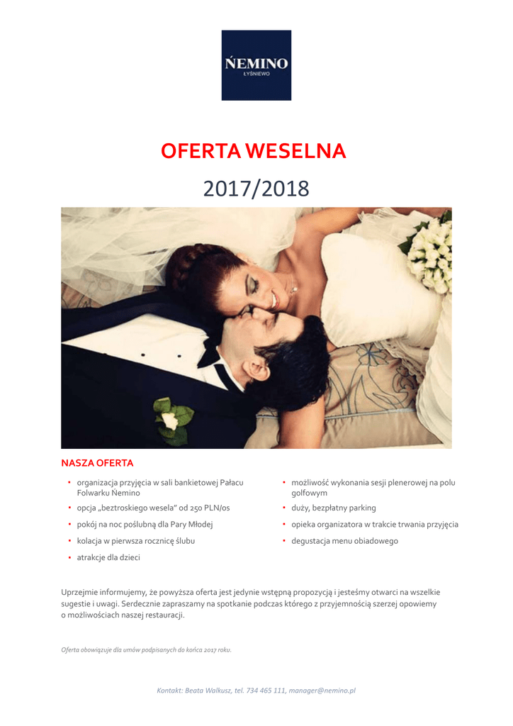 OFERTA WESELNA 2017/2018 NASZA OFERTA ▪ organizacja przyjęcia w sali bankietowej Pałacu ▪ możliwość wykonania sesji plenerowej na polu ▪ opcja „beztroskiego wesela” od 250 PLN/os ▪ duży, bezpłatny parking ▪ pokój na noc poślubną dla Pary Młodej ▪ opieka organizatora w trakcie trwania przyjęcia ▪ kolacja w pierwsza rocznicę ślubu ▪ degustacja menu obiadowego Folwarku Ńemino golfowym ▪ atrakcje dla dzieci Uprzejmie informujemy, że powyższa oferta jest jedynie wstępną propozycją i jesteśmy otwarci na wszelkie sugestie i uwagi. Serdecznie zapraszamy na spotkanie podczas którego z przyjemnością szerzej opowiemy o możliwościach naszej restauracji. Oferta obowiązuje dla umów podpisanych do końca 2017 roku. Kontakt: Beata Walkusz, tel. 734 465 111, [email protected] Zestaw I - 209 zł/osoba OBIAD: Przystawka Pasztet z pistacjami w towarzystwie kolorowych sałat z żurawiną, pieczywem i masełkiem smakowym Zupa Tradycyjny rosół babuni z karotką i makaronem domowym II danie (na półmiskach, po 75%) Roladki drobiowe z bazylią i serem mozarella Kotlet de volaille; Tradycyjny kotlet schabowy Karczek wieprzowy szpikowany czosnkiem Dodatki: Ziemniaki z koperkiem Ziemniaki opiekane z okrasą Warzywa blanszowane Bukiet surówek Buraczki z renetą na ciepło Deser Szarlotka z cynamonem na ciepło z bitą śmietaną Gałka loda waniliowego ZAKĄSKI ZIMNE W STÓŁ: Karczek wieprzowy Schab z bekonem- rolada Terrina drobiowa z mozarellą Galantyna drobiowa z morelą Tymbaliki drobiowe Paleta wędlin wiejskich Marynaty Zimne sosy Filet z pstrąga w krystalicznej zalewie Ruloniki z łososia wędzonego z musem chrzanowym; Filet z matiasa w oliwie Sałatka wielowarzywna z fetą Sałatka z blanszowanym brokułem, dressingiem jogurtowym z ziarnami Gyros NAPOJE: Soki owocowe 1l/os Bez ograniczeń: Kawa Herbata Woda DANIA PO PÓŁNOCY: Barszcze czerwony z pasztecikiem Na ciepło -do wybory jedna pozycja: Karkówka oberżysty Udziec drobiowy z pieczarkami Pieczeń wieprzowa w sosie z runa leśnego Opcja „BEZTROSKIE WESELE” od 250 PLN/os (oferta z ciastem, owocami, napojami gazowanymi oraz tortem) Kontakt: Beata Walkusz, tel. 734 465 111, [email protected] Zestaw II – 229zł/osoba OBIAD: Przystawka Łosoś marynowany z pieprzem konserwowym na kruchej sałacie Zupa Aromatyczny rosół z kury z lanymi kluseczkami II danie (na półmiskach, po 75%) Roladki drobiowe z bazylią i serem mozarella Kotlet de volaille; Rarytas kaczy ze złotą renetą na modrej kapuście Zraz wołowy z korniszonem i bekonem Dodatki: Ziemniaki z koperkiem Ziemniaki opiekane Warzywa blanszowane Bukiet surówek Buraczki na ciepło Kasza gryczana z okrasą Deser Lody waniliowe na bitej śmietanie z gorącym sosem wiśniowym Paleta wędlin wiejskich Marynaty Zimne sosy Pstrąg w krystalicznej zalewie Tymbalik z łososia Filet z matiasa ze złotą renetą Filet z makreli na sosie chrzanowym Sałatka wielowarzywna z fetą Sałatka ziemniaczana z kaparami i chrupiącym bekonem NAPOJE: Soki owocowe 1l/osoba Bez ograniczeń: Kawa Herbata Woda DANIA PO PÓŁNOCY: Bogracz Barszcz czerwony z pasztecikiem Mięso na ciepło -do wybory jedna pozycja: ZAKĄSKI ZIMNE W STÓŁ: Schab z bekonem- rolada Karkówka z borowikiem Terrina z brokułem Karkówka oberżysty Udziec drobiowy z pieczarkami Szaszłyk drobiowy Kontakt: Beata Walkusz, tel. 734 465 111, [email protected] ALKOHOL: Na spotkaniu zapytaj o ceny specjalne na alkohol oraz opcja baru weselnego Kontakt: Beata Walkusz, tel. 734 465 111, [email protected]