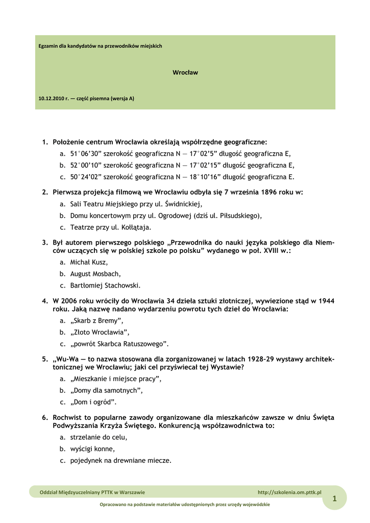 Egzamin dla kandydatów na przewodników miejskich Wrocław 10.12.2010 r. — część pisemna (wersja A) 1. Położenie centrum Wrocławia określają współrzędne geograficzne: a. 51°06’30” szerokość geograficzna N — 17°02’5” długość geograficzna E, b. 52°00’10” szerokość geograficzna N — 17°02’15” długość geograficzna E, c. 50°24’02” szerokość geograficzna N — 18°10’16” długość geograficzna E. 2. Pierwsza projekcja filmową we Wrocławiu odbyła się 7 września 1896 roku w: a. Sali Teatru Miejskiego przy ul. Świdnickiej, b. Domu koncertowym przy ul. Ogrodowej (dziś ul. Piłsudskiego), c. Teatrze przy ul. Kołłątaja. 3. Był autorem pierwszego polskiego „Przewodnika do nauki języka polskiego dla Niemców uczących się w polskiej szkole po polsku” wydanego w poł. XVIII w.: a. Michał Kusz, b. August Mosbach, c. Bartłomiej Stachowski. 4. W 2006 roku wróciły do Wrocławia 34 dzieła sztuki złotniczej, wywiezione stąd w 1944 roku. Jaką nazwę nadano wydarzeniu powrotu tych dzieł do Wrocławia: a. „Skarb z Bremy”, b. „Złoto Wrocławia”, c. „powrót Skarbca Ratuszowego”. 5. „Wu-Wa — to nazwa stosowana dla zorganizowanej w latach 1928–29 wystawy architektonicznej we Wrocławiu; jaki cel przyświecał tej Wystawie? a. „Mieszkanie i miejsce pracy”, b. „Domy dla samotnych”, c. „Dom i ogród”. 6. Rochwist to popularne zawody organizowane dla mieszkańców zawsze w dniu Święta Podwyższania Krzyża Świętego. Konkurencją współzawodnictwa to: a. strzelanie do celu, b. wyścigi konne, c. pojedynek na drewniane miecze. Oddział Międzyuczelniany PTTK w Warszawie http://szkolenia.om.pttk.pl Opracowano na podstawie materiałów udostępnionych przez urzędy wojewódzkie 1 10.12.2010 Egzamin dla kandydatów na przewodników miejskich — Wrocław 7. Patronem Rady Miejskiej Wrocławia jest: a. Św. Dorota, b. Św. Jan Chrzciciel, c. Św. Jan Ewangelista. 8. Twórcą postaci Komisarza Policji Eberharda Mocka jest: a. Marek Krajewski, b. Andrzej Waligórski, c. Zygmunt Wolny. 9. Meridiana — jedyny tego typu zabytek w Polsce służy do wyznaczania: a. szerokości geograficznej, b. czasu słonecznego tzw. miejscowego, c. wysokości nad poziomem morza. 10. Posągowi Pallas Ateny, który patronuje wejściu do Uniwersytetu Wrocławskiego towarzyszy atrybut: a. tarcza herbowa, b. sowa, c. hełm z pióropuszem. 11. Pomnik Żołnierzy Armii Krajowej znajduje się: a. na Opprowie, b. na cmentarzu na Skowroniej Górze, c. na cmentarzu Św. Rodziny. 12. . Gdzie znajduje się nagrobek Nikolausa Rehdigera (1582 r.): a. w Muzeum Miejskim Wrocławia, b. w kościele św. Marii Magdaleny, c. w kościele św. Elżbiety. 13. Kto jest autorem pomnika pomordowanych profesorów lwowskich przy Politechnice: a. Alojzy Gryt, b. Borys Michałowski, c. Leon Podsiadły. 14. Kto jest dyrektorem wrocławskiego ZOO? a. Antoni Gucwiński, b. Radosław Ratajszczak, c. Hanna Gucwińska. 2 http://szkolenia.om.pttk.pl Oddział Międzyuczelniany PTTK w Warszawie Opracowano na podstawie materiałów udostępnionych przez urzędy wojewódzkie Egzamin dla kandydatów na przewodników miejskich — Wrocław 10.12.2010 15. W którym roku powstało Towarzystwo Miłośników Wrocławia? a. w 1989, b. w 1946, c. w 1956. 16. Teatr Lalek mieści się: a. w dawnym Browarze Mieszczańskim, b. w gmachu dawnej Resursy Kupieckiej, c. w dawnej palarni kawy. 17. W zakładach „Elwro” produkowano: a. odbiorniki radiowe, b. maszyny cyfrowe, c. silniki wysokoprężne. 18. Urna z sercem księżnej Karoliny ostatniej Piastówny znajduje się: a. w katedrze, b. w kościele p.w. Bożego Ciała, c. w kościele Urszulanek. 19. Kto jest autorem pomnika szermierza przed Uniwersytetem? a. Thomas Myrtek, b. Hugo Lederer, c. Chrystian Daniel Rauch. 20. Kornel Morawiecki w latach 80 XX w. był przywódcą: a. Ruchu Wolnych Demokratów, b. Pomarańczowej Alternatywy, c. Solidarności Walczącej. 21. Rafał Maszkowski — skrzypek i dyrygent Wrocławskiego Towarzystwa Orkiestrowego pochowany jest: a. na cmentarzu Grabiszyńskim, b. na cmentarzu św. Rodziny, c. na cmentarzu Osobowickim. 22. W latach 1884-1888 w Uniwersytecie Wrocławskim studiował: a. Adam Asnyk, b. Karl von Hollei, c. Jan Kasprowicz. Oddział Międzyuczelniany PTTK w Warszawie http://szkolenia.om.pttk.pl.pl Opracowano na podstawie materiałów udostępnionych przez urzędy wojewódzkie 3 10.12.2010 Egzamin dla kandydatów na przewodników miejskich — Wrocław 23. Ernst May (1886-1970) był: a. malarzem, b. aktorem c. architektem. 24. Jerzy Grotowski był twórcą i dyrektorem: a. Teatru Pantomimy, b. Teatru Zielona Latarnia, c. Teatru Laboratorium. 25. Jaki obiekt kupiła w 1886 r. rodzina Kornów na swoją siedzibę rodową? a. pałac w Brochowie, b. pałac w Leśnicy, c. pałac w Pawłowicach. 26. Kiedy nastąpiło oficjalne otwarcie pierwszego odcinka Kolei Górnośląskiej Wrocław — Oława? a. 22.05.1842 r., b. 17.10.1863 r., c. 15.01.1871 r. 27. We Wrocławiu znajduje się najnowocześniejsza i największa na świecie fabryka autobusów tej firmy, jak brzmi jej nazwa? a. Volvo Bus Corporation (Volvo Polska Sp.zo.o.), b. Scania AB, c. Solaris Bus&Coach. 28. Gdzie we Wrocławiu znajduje się honorowy konsulat Brazylii? a. w budynku głównym Volvo Polska Sp. z o.o., b. na wrocławskim Rynku, c. przy ul. Hermanowskicj. 29. Gdzie zmarł Bolesław Wysoki? a. w katedrze wrocławskiej, b. w zamku leśnickim, c. w klasztorze joanitów. 30. Jaki Puchar został zdobyty przez piłkarską pierwszą drużynę Śląska Wrocław w sezonie piłkarskim 2008/2009? a. Puchar Ekstraklasy, b. Puchar Królowej Zofii, c. Puchar Pogranicza. 4 http://szkolenia.om.pttk.pl Oddział Międzyuczelniany PTTK w Warszawie Opracowano na podstawie materiałów udostępnionych przez urzędy wojewódzkie