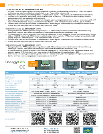 KONTROLERY SOLARNE ŁADOWANIA PWM, LC, Ah(in/out) CECHY SPECJALNE (EL-WP30D 30A 12/24V, 48V) 1. Kontroler PWM najnowszej generacji z 14-oma przełączanymi ekranami przedstawiającymi parametry i ikony informujące o statusie pracy, usterkach, aktualnych ustawieniach (w tym 7 parametrów ustawianych) 2. Inteligentnie podświetlany wyświetlacz graficzny LCD pozwala na czytelne odczyty także przy niedostatecznym oświetleniu. 3. 7 przełączanych ekranów w pętli głównej: napięcie akumulatora, temperatura, prąd ładowania, prąd obciążenia, energia zakumulowana [Ah], energia oddana [Ah], kod usterki. 4. 7 przełączanych ekranów parametrów ustawianych: napięcie systemu, napięcie spoczynkowe, napięcie absorpcyjne, LVD, LVR, tryby kontroli obciążenia LC (zwykły, załączanie zmierzch 1 praca 1~24h, praca od zmierzchu do świtu), typ akumulatora 6. Ochrona przed zwarciem, przeciążeniem, przeładowaniem i rozładowaniem, odwrotnym podłączeniem panelu i akumulatora 2 7. Solidne terminale wejściowe do podłączenia przewodów do max 16mm CECHY SPECJALNE (EL-CM3024Z 20A 12/24V) 1. Szeregowy kontroler PWM z wyświetlaczem graficznym LCD, 10 ekranów parametrów (w tym część ustawianych), ikony informujące o statusie pracy, usterkach i aktualnych ustawieniach i to wszytko za umiarkowaną cenę 2. Przełączane ekrany: napięcie akumulatora, temperatura, prąd ładowania, prąd obciążenia, energia zakumulowana [Ah], energia oddana [Ah], LVD (ustawiane), LVR (ustawiane), odcięcie przy wysokim napięciu- HVD (ustawiane), tryby pracy obciążenia LC (zwykły, załączanie zmierzch i praca 1~23h, praca od zmierzchu do świtu) 3. Ochrona przed zwarciem, przeciążeniem, przeładowaniem i rozładowaniem, odwrotnym podłączeniem panelu i akumulatora 2 4. Solidne terminale wejściowe do podłączenia przewodów do max 6mm CECHY SPECJALNE (EL-CM3024Z 30A 12/24V) 1. Szeregowy kontroler PWM z wyświetlaczem graficznym LCD, 10 ekranów parametrów (w tym część ustawianych), ikony informujące o statusie pracy, usterkach i aktualnych ustawieniach i to wszytko za umiarkowaną cenę 2. Przełączane ekrany: napięcie akumulatora, temperatura, prąd ładowania, LVD (ustawiane), LVR (ustawiane), odcięcie przy wysokim napięciu- HVD (ustawiane), tryby pracy obciążenia do 24h z włącznikiem zmierzchowym (LC) 3. Ochrona przed zwarciem, przeciążeniem, przeładowaniem i rozładowaniem, odwrotnym podłączeniem panelu i akumulatora 2 4. Solidne terminale wejściowe do podłączenia przewodów do max 6mm TOP product Typ Nr katalogowy Tryb ładowania Wskazywanie EL-WP30D-12/24 EL-WP30D-48 525202 ZAM PWM podświetlany LCD (14 przełączanych ekranów) EL-CM3024Z-20A EL-CM3024Z-30A 525203 525012 PWM LCD (przełączane ekrany) LCD (przełączane ekrany) Napięcie systemowe (auto) 12/24V 48V Max napięcie wejściowe PV <50V <100V 1320 Wp (24V) 8000 Wp 800 Wp (24V) 1000Wp (24V) 30A 50A 20A 30A Max moc paneli PV Prąd znamionowy Straty biegu jałowego Odcięcie wysokiego napięcia (HVD) Tryby ładowania akumulatora Wybór rodzaju akumulatora Ładowanie absorpcyjne 12/24V <50V ≤13mA ≤30mA 16V; x2(24V), x4(48V) powrót - spadek o 1V(12V) 15,5V; x2(24V) ustawiane akumulacyjne, absorpcyjne, spoczynkowe akumulacyjne, absorpcyjne, spoczynkowe kwasowy (szczelny, zalewowy), żelowy, definiowany 14,4V (12~15V); x2(24V), x4(48V) n.d. 14,4V, x2 (24V) Ładowanie spoczynkowe 13,8V (12~15V); x2(24V), x4(48V) 13,7V, x2 (24V) Napięcie odcięcia akumulat. (LVD) 10,7V (10~14V); x2(24V), x4(48V) 10,7V(10~15V), x2 (24V) Napięcie ponownego zał. (LVR) 12,6V (10~14V); x2(24V), x4(48V) Włącznik zmierzchowy (LC) Kompensacja temperaturowa Temperatura otoczenia Wymiary (szer x gł x wys) / masa Link do produktu tryby 1,2,3, czas pracy 1~24h 12,6V(10~15V), x2 (24V) 1~23h, zmierzch-świt 1~23h, zmierzch-świt -4mV/celę/ºC -4mV/celę/ºC -20ºC ~ +55ºC 200x63,5x63,5 / 665g 186x37x49,5mm / 370g -20ºC ~ +50ºC 188x47,5x90mm / 355g