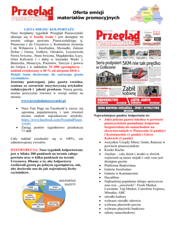 Oferta emisji materiałów promocyjnych LISTA MIEJSC KOLPORTAŻU Nasz bezpłatny tygodnik Przegląd Piaseczyński ukazuje się w każdą środę i jest dostępny na terenie całego powiatu Piaseczyńskiego tj. Piaseczno ( do Ursynowa ), Konstancin Jeziorna ( do Wilanowa ), Józefosław, Mysiadło, Zalesie Dolne i Górne, Gołków, Głosków, Lesznowola Nowa Iwiczna , Stara Iwiczna, Magdalenka, Łazy, Góra Kalwaria ( i dalej w kierunku Warki ), Baniocha, Słomczyn, Prażmów, Tarczyn ( prawie do Grójca ) w nakładzie 35 000 egzemplarzy – nakład zwiększony o 40 % od sierpnia 2016 r. Dzięki temu docieramy do szerszego grona czytelników. Jesteśmy postrzegani, jako gazeta rzetelna, ceniona za zawartość merytoryczną artykułów redakcyjnych i jakość przekazu. Naszą gazetę, można przeczytać również w wersji online na stronie: www.przegladpiaseczynski.pl Nasz Fun Page na Facebook’u cieszy się ogromną popularnością i tam również można znaleźć najciekawsze artykuły: https://www.facebook.com/PrzegladPiasec zynski Zasięg postów tygodniowo przekracza 77 000 Cały nakład rozchodzi odnotowujemy zwrotów. się w 100%, nie DYSTRYBUCJA: Nasz tygodnik kolportowany jest w blisko 200 punktach na terenie całego powiatu oraz w kilku punktach na terenie Ursynowa. Dbamy o to, aby kolporterzy rozdawali gazetę po jednym egzemplarzu, tak, aby docierała ona do jak największej liczby czytelników. Najważniejsze punkty kolportażu to: Jako jedyna gazeta lokalna w powiecie piaseczyńskim posiadamy kolportaż bezpośrednio do samochodów na skrzyżowaniach w Piasecznie (4 punkty) i Konstancinie (1 punkt) i Górze Kalwarii (1 punkt) wszystkie Urzędy Miast, Gmin, Ratusze w powiecie piaseczyńskim Kioski Ruchu Auchan – cały dzień ( środa) w dwóch wejściach są nasze stojaki i cały czas jest dostępna gazeta Platforma Budowlana Galeria Józefosław Galeria w Konstancinie Decathlon Najbardziej popularne sklepy spożywcze oraz tzw. „sieciówki”: Fresh Market, Lewiatan, Top Market, Carrefour Express, Minutka, ABC ośrodki kultury wybrane ośrodki zdrowia wybrane placówki poczty wybrane placówki bankowe salony samochodowe
