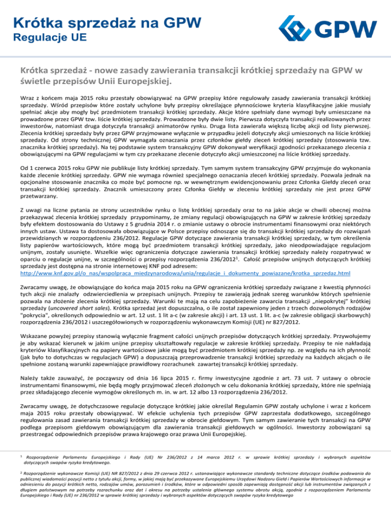 Krótka sprzedaż na GPW Regulacje UE Krótka sprzedaż - nowe zasady zawierania transakcji krótkiej sprzedaży na GPW w świetle przepisów Unii Europejskiej. Wraz z końcem maja 2015 roku przestały obowiązywać na GPW przepisy które regulowały zasady zawierania transakcji krótkiej sprzedaży. Wśród przepisów które zostały uchylone były przepisy określające płynnościowe kryteria klasyfikacyjne jakie musiały spełniać akcje aby mogły być przedmiotem transakcji krótkiej sprzedaży. Akcje które spełniały dane wymogi były umieszczane na prowadzone przez GPW tzw. liście krótkiej sprzedaży. Prowadzone były dwie listy. Pierwsza dotyczyła transakcji realizowanych przez inwestorów, natomiast druga dotyczyła transakcji animatorów rynku. Druga lista zawierała większą liczbę akcji od listy pierwszej. Zlecenia krótkiej sprzedaży były przez GPW przyjmowane wyłącznie w przypadku jeżeli dotyczyły akcji umieszonych na liście krótkiej sprzedaży. Od strony technicznej GPW wymagała oznaczania przez członków giełdy zleceń krótkiej sprzedaży (stosowania tzw. znacznika krótkiej sprzedaży). Na tej podstawie system transakcyjny GPW dokonywał weryfikacji zgodności przekazanego zlecenia z obowiązującymi na GPW regulacjami w tym czy przekazane zlecenie dotyczyło akcji umieszczonej na liście krótkiej sprzedaży. Od 1 czerwca 2015 roku GPW nie publikuje listy krótkiej sprzedaży. Tym samym system transakcyjny GPW przyjmuje do wykonania każde zlecenie krótkiej sprzedaży. GPW nie wymaga również specjalnego oznaczania zleceń krótkiej sprzedaży. Pozwala jednak na opcjonalne stosowanie znacznika co może być pomocne np. w wewnętrznym ewidencjonowaniu przez Członka Giełdy zleceń oraz transakcji krótkiej sprzedaży. Znacznik umieszczony przez Członka Giełdy w zleceniu krótkiej sprzedaży nie jest przez GPW przetwarzany. Z uwagi na liczne pytania ze strony uczestników rynku o listę krótkiej sprzedaży oraz to na jakie akcje w chwili obecnej można przekazywać zlecenia krótkiej sprzedaży przypominamy, że zmiany regulacji obowiązujących na GPW w zakresie krótkiej sprzedaży były efektem dostosowania do Ustawy z 5 grudnia 2014 r. o zmianie ustawy o obrocie instrumentami finansowymi oraz niektórych innych ustaw. Ustawa ta dostosowała obowiązujące w Polsce przepisy odnoszące się do transakcji krótkiej sprzedaży do rozwiązań przewidzianych w rozporządzeniu 236/2012. Regulacje GPW dotyczące zawierania transakcji krótkiej sprzedaży, w tym określenia listy papierów wartościowych, które mogą być przedmiotem transakcji krótkiej sprzedaży, jako nieodpowiadające regulacjom unijnym, zostały usunięte. Wszelkie więc ograniczenia dotyczące zawierania transakcji krótkiej sprzedaży należy rozpatrywać w oparciu o regulacje unijne, w szczególności o przepisy rozporządzenia 236/20121. Całość przepisów unijnych dotyczących krótkiej sprzedaży jest dostępna na stronie internetowej KNF pod adresem: http://www.knf.gov.pl/o_nas/wspolpraca_miedzynarodowa/unia/regulacje_i_dokumenty_powiazane/krotka_sprzedaz.html Zwracamy uwagę, że obowiązujące do końca maja 2015 roku na GPW ograniczenia krótkiej sprzedaży związane z kwestią płynności tych akcji nie znalazły odzwierciedlenia w przepisach unijnych. Przepisy te zawierają jednak szereg warunków których spełnienie pozwala na złożenie zlecenia krótkiej sprzedaży. Warunki te mają na celu zapobieżenie zawarcia transakcji „niepokrytej” krótkiej sprzedaży (uncovered short sales). Krótka sprzedaż jest dopuszczalna, o ile został zapewniony jeden z trzech dozwolonych rodzajów "pokrycia", określonych odpowiednio w art. 12 ust. 1 lit a-c (w zakresie akcji) i art. 13 ust. 1 lit. a-c (w zakresie obligacji skarbowych) rozporządzenia 236/2012 i uszczegółowionych w rozporządzeniu wykonawczym Komisji (UE) nr 827/2012. Wskazane powyżej przepisy stanowią wyłącznie fragment całości unijnych przepisów dotyczących krótkiej sprzedaży. Przywołujemy je aby wskazać kierunek w jakim unijne przepisy ukształtowały regulacje w zakresie krótkiej sprzedaży. Przepisy te nie nakładają kryteriów klasyfikacyjnych na papiery wartościowe jakie mogą być przedmiotem krótkiej sprzedaży np. ze względu na ich płynność (jak było to dotychczas w regulacjach GPW) a dopuszczają przeprowadzenie transakcji krótkiej sprzedaży na każdych akcjach o ile spełnione zostaną warunki zapewniające prawidłowy rozrachunek zawartej transakcji krótkiej sprzedaży. Należy także zauważyć, że począwszy od dnia 16 lipca 2015 r. firmy inwestycyjne zgodnie z art. 73 ust. 7 ustawy o obrocie instrumentami finansowymi, nie będą mogły przyjmować zleceń złożonych w celu dokonania krótkiej sprzedaży, które nie spełniają przez składającego zlecenie wymogów określonych m. in. w art. 12 albo 13 rozporządzenia 236/2012. Zwracamy uwagę, że dotychczasowe regulacje dotyczące krótkiej jakie określał Regulamin GPW zostały uchylone i wraz z końcem maja 2015 roku przestały obowiązywać. W efekcie uchylenia tych przepisów GPW zaprzestała dodatkowego, szczególnego regulowania zasad zawierania transakcji krótkiej sprzedaży w obrocie giełdowym. Tym samym zawieranie tych transakcji na GPW podlega przepisom giełdowym obowiązującym dla zawierania transakcji giełdowych w ogólności. Inwestorzy zobowiązani są przestrzegać odpowiednich przepisów prawa krajowego oraz prawa Unii Europejskiej. 1 2 Rozporządzenie Parlamentu Europejskiego i Rady (UE) Nr 236/2012 z 14 marca 2012 r. w sprawie krótkiej sprzedaży i wybranych aspektów dotyczących swapów ryzyka kredytowego. Rozporządzenie wykonawcze Komisji (UE) NR 827/2012 z dnia 29 czerwca 2012 r. ustanawiające wykonawcze standardy techniczne dotyczące środków podawania do publicznej wiadomości pozycji netto z tytułu akcji, formy, w jakiej mają być przekazywane Europejskiemu Urzędowi Nadzoru 