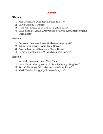 Lektury Klasa 4 1. 2. 3. 4. Jan Brzechwa „Akademia Pana Kleksa” Carlo Collodi „Pinokio” Rene Goscinny, Jean Jacques „Mikołajek” Clive Staples Lewis „Opowieści z Narnii. Lew, czarownica i stara szafa” Klasa 5 1. 2. 3. 4. Frances Hodgson Burnett „Tajemniczy ogród” Astrid Lindgren „Bracia Lwie Serce” Ferenc Molnar „Chłopcy z Placu Broni” Henryk Sienkiewicz „W pustyni i w puszczy” Klasa 6 1. 2. 3. 4. Irena Jurgielewiczowa „Ten Obcy” Lucy Maud Montgomery „Ania z Zielonego Wzgórza” Kornel Makuszyński „Szatan z siódmej klasy” Mark Twain „Przygody Tomka Sawyera”