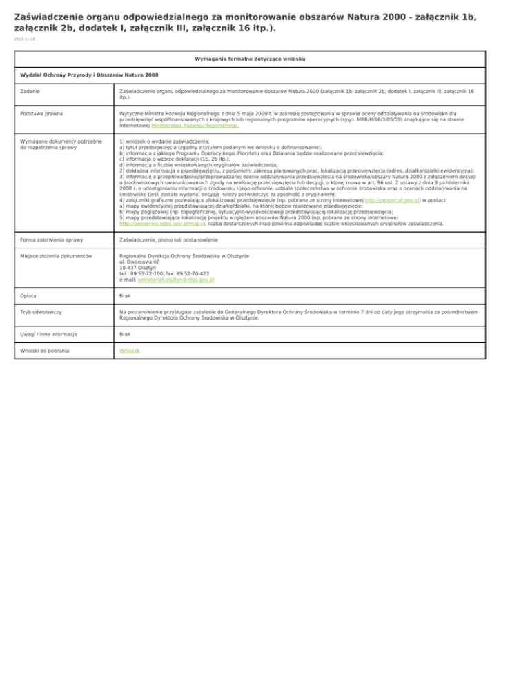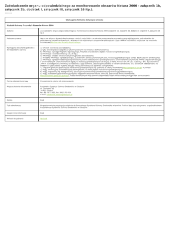 Zaświadczenie organu odpowiedzialnego za monitorowanie obszarów Natura 2000 - załącznik 1b, załącznik 2b, dodatek I, załącznik III, załącznik 16 itp.). 2013-11-18 Wymagania formalne dotyczące wniosku Wydział Ochrony Przyrody i Obszarów Natura 2000 Zadanie Zaświadczenie organu odpowiedzialnego za monitorowanie obszarów Natura 2000 (załącznik 1b, załącznik 2b, dodatek I, załącznik III, załącznik 16 itp.). Podstawa prawna Wytyczne Ministra Rozwoju Regionalnego z dnia 5 maja 2009 r. w zakresie postępowania w sprawie oceny oddziaływania na środowisko dla przedsięwzięć współfinansowanych z krajowych lub regionalnych programów operacyjnych (sygn. MRR/H/16/3/05/09) znajdujące się na stronie internetowej Ministerstwa Rozwoju Regionalnego. Wymagane dokumenty potrzebne do rozpatrzenia sprawy 1) wniosek o wydanie zaświadczenia; a) tytuł przedsięwzięcia (zgodny z tytułem podanym we wniosku o dofinansowanie); b) informacja z jakiego Programu Operacyjnego, Piorytetu oraz Działania będzie realizowane przedsięwzięcia; c) informacja o wzorze deklaracji (1b, 2b itp.); d) informacja o liczbie wnioskowanych oryginałów zaświadczenia; 2) dokładna informacja o przedsięwzięciu, z podaniem: zakresu planowanych prac, lokalizacją przedsięwzięcia (adres, działka/działki ewidencyjna); 3) informację o przeprowadzonej/przeprowadzanej ocenie oddziaływania przedsięwzięcia na środowisko/obszary Natura 2000 z załączeniem decyzji o środowiskowych uwarunkowaniach zgody na realizację przedsięwzięcia lub decyzji, o której mowa w art. 96 ust. 2 ustawy z dnia 3 października 2008 r. o udostępnianiu informacji o środowisku i jego ochronie, udziale społeczeństwa w ochronie środowiska oraz o ocenach oddziaływania na środowisko (jeśli została wydana; decyzję należy poświadczyć za zgodność z oryginałem); 4) załączniki graficzne pozwalające zlokalizować przedsięwzięcie (np. pobrane ze strony internetowej http://geoportal.gov.pl) w postaci: a) mapy ewidencyjnej przedstawiającej działkę/działki, na której będzie realizowane przedsięwzięcie; b) mapy poglądowej (np. topograficznej, sytuacyjno-wysokościowej) przedstawiającej lokalizację przedsięwzięcia; 5) mapy przedstawiające lokalizację projektu względem obszarów Natura 2000 (np. pobrane ze strony internetowej http://geoserwis.gdos.gov.pl/mapy), liczba dostarczonych map powinna odpowiadać liczbie wnioskowanych oryginałów zaświadczenia. Forma załatwienia sprawy Zaświadczenie, pismo lub postanowienie Miejsce złożenia dokumentów Regionalna Dyrekcja Ochrony Środowiska w Olsztynie ul. Dworcowa 60 10-437 Olsztyn tel.: 89 53-72-100, fax: 89 52-70-423 e-mail: [email protected] Opłata Brak Tryb odwoławczy Na postanowienie przysługuje zażalenie do Generalnego Dyrektora Ochrony Środowiska w terminie 7 dni od daty jego otrzymania za pośrednictwem Regionalnego Dyrektora Ochrony Środowiska w Olsztynie. Uwagi / inne informacje Brak Wnioski do pobrania Wniosek