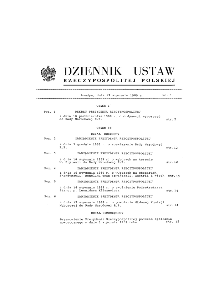 DZIENNIK USTAW RZECZYPOSPOLITEJ L o n d y n , dnia 17 s t y c z n i a POLSKIEJ 1989 r . No. 1 CZĘŚĆ I Poz. 1 DEKRET PREZYDENTA RZECZYPOSPOLITEJ z d n i a 10 p a ź d z i e r n i k a 1988 r . o o r d y n a c j i d o Rady N a r o d o w e j R . P . wyborczej str. 2 CZĘŚC II DZIAŁ Poz. 2 URZĘDOWY ZARZĄDZENIE PREZYDENTA RZECZYPOSPOLITEJ z d n i a 3 g r u d n i a 1988 r . o r o z w i ą z a n i u R a d y Narodowej R.P. Poz. 3 str.12 ZARZĄDZENIE PREZYDENTA RZECZYPOSPOLITEJ r . o w yR b. oP r. a c h na Wz. d nB ir ay t a16 n i is t dy oc z nR ia ad y 1989 Narodowej Poz. 4 ZARZADZENIE PREZYDENTA terenie str.12 RZECZYPOSPOLITEJ z d n i a 16 s t y c z n i a 1989 r . o w y b o r a c h na o b s z a r a c h S k a n d y n a w i i , B e n e l u x u oraz S z w a j c a r i i , A u s t r i i i W ł o c h PO?. 5 ZARZĄDZENIE PREZYDENTA RZECZYPOSPOLITEJ z d n i a 16 s t y c z n i a 1989 r . o z w o l n i e n i u Stanu, p . Leonidasa Kliszewicza Poz. 6 ZARZĄDZENIE PREZYDENTA str.13 Podsekretarza str.14 RZECZYPOSPOLITEJ z d n i a 17 s t y c z n i a 1989 r . o p o w o ł a n i u G ł ó w n e j W y b o r c z e j d o R a d y Narodowej R . P . Komisji s t r . 14 DZIAŁ NIEURZĘDOWY Przemówienie Prezydenta Rzeczypospolitej podczas n u w o r o c z n e g o w d n i u 1 stycznia 1989 r o k u spotkania str. 15 - 2 ~ CZĘSC I 1 DEKRET PREZYDENTA RZECZYPOSPOLITEJ z d n i a 10 p a ź d z i e r n i k a 1 9 8 8 r o k u o o r d y n a c j i wyborczej do Rady N a r o d o w e j Na p o d s t a w i e a r t . 79 u s t . /2/ U s t a w y K o n s t y t u c y j n e j następuje: R.P, stanowię, co A r t . 1. 1/ W s k ł a d R a d y N a r o d o w e j R . P . w c h o d z i 30 c z ł o n k ó w z w y b o r ó w , d o k o n a n y c h p r z e z o g ó ł o b y w a t e l i p o l s k i c h w W i e l k i e j B r y t a n i i w głosowaniu p o w s z e c h n y m , r ó w n y m , tajnym i b e z p o ś r e d n i m , w / g a k t u scalenia z 1972 r . 2/ W s k ł a d R a d y N a r o d o w e j R . P . w c h o d z i r ó w n i e ż 11 c z ł o n k ó w z wybór d o k o n a n y c h na o b s z a r a c h S k a n d y n a w i i / S z w e c j a , N o r w e g i a i D a n i a / , H o l a n d i i , B e l g i i i Luksemburga oraz S z w a j c a r i i , Austrii i Włoch przez ogół o b y w a t e l i polskich z a m i e s z k u j ą c y c h dany kraj i należących do p o l s k i c h niepodległościowych o r g a n i z a c j i politycznych, s p o ł e c z n y c h , k u l t u r a l n y c h i r e l i g i j n y c h d z i a ł a j ą c y c h w tym k r a j u . 3/ O r d y n a c j a w y b o r c z a d o O d d z i a ł ó w R a d y N a r o d o w e j R . P . w R e p u b l i c e F e d e r a l n e j N i e m i e c , S t a n ó w Z j e d n o c z o n y c h A . P . i w K a n a d z i e oraz p r z e p i s y o u d z i a l e w p r a c a c h Rady N a r o d o w e j R . P . p r z e d s t a w i c i e l i polskiej emigracji politycznej, osiadłej w nie wymienionych w n i n i e j s z y m a r t y k u l e k r a j a c h w o l n e g o ś w i a t a , są l u b b ę d ą o b j ę t e osobnymi d e k r e t a m i Prezydenta R z e c z y p o s p o l i t e j . A r t . 2. 1/ Na o b s z a r z e W i e l k i e j B r y t a n i i p r a w o w y b i e r a n i a c z ł o n k ó w Rady Narodowej R . P . służy wszystkim obywatelom p o l s k i m , którzy przed d n i e m z a r z ą d z e n i a w y b o r ó w u k o ń c z y l i l a t 18 i z a m i e s z k u j ą w d a n y okręgu wyborczym. 2/ O b y w a t e l a m i p o l s k i m i są też o s o b y p o c h o d z e n i a p o l s k i e g o , k t ó r e po 1 w r z e ś n i a 1939 r . p r z y j ę ł y o b y w a t e l s t w o o b c e lub je n a b y ł y z m o c y u r o d z e n i a na o b c z y ź n i e . 3/ W k r a j a c h w y m i e n i o n y c h w a r t . 1 / u s t . 2/ p r a w o w y b i e r a n i a członków R a d y N a r o d o w e j R . P . służy w s z y s t k i m o s o b o m , o d p o w i a d a j ą c y m p r z e p i W i u s t . 1. n i n i e j s z e g o artykułu, które p r z e d dniem zarządzenia w y b o r ó w u z y s k a ł y c z ł o n k o s t w o co n a j m n i e j j e d n e j z p o l s k i c h niep o d l e g ł o ś c i o w y c h organizacji p o l i t y c z n y c h , s p o ł e c z n y c h , kulturaln y c h l u b r e l i g i j n y c h d z i a ł a j ą c y c h w k r a j u z a m i e s z k a n i a tych o s ó b . - 3 ~ Polską organizacją niepodległościową w zrozumieniu niniejszej ordynacji wyborczej jest każde ugrupowanie, stronnictwo, partia, s t o w a r z y s z e n i e , związek, k o ł o , k l u b , w s p ó l n o t a lub towarzystwo, które skupiając w sobie o b y w a t e l i p o l s k i c h , p r o w a d z i swą działalność ' statutową w ścisłej ł ą c z n o ś c i z d ą ż e n i a m i narodu polskiego do odzyskania niezależnego b y t u p a ń s t w o w e g o o p a r t e g o o w o l n o ś ć , demokrację i sprawiedliwość s p o ł e c z n ą , a także które w swej działalności odrzuca jakąkolwiek współpracę z narzuconą Krajowi władzą. Art. 3. 1/ P r a w o w y b i e r a l n o ś c i n a c z ł o n k ó w R a d y N a r o d o w e j R . P . z o b s z a r u Wielkiej Brytanii mają w s z y s t k i e osoby odpowiadające przepisom a r t . 2. / u s t . 1./ z o b s z a r u z a ś k r a j ó w w y m i e n i o n y c h w a r t . 1 . /ust.2/ o s o b y , które przed d n i e m zarządzenia wyborów ukończyły lat 21 o r a z z a m i e s z k u j ą w k r a j u , w k t ó r y m w y b o r y są p r z e p r o w a d z a n e 2/ Z g ł o s z e n i a k a n d y d a t ó w n a c z ł o n k ó w R a d y N a r o d o w e j R . P . w i n n y b y ć z ł o ż o n e n a p i ś m i e p o d p i s a n y m p r z e z c o n a j m n i e j 15 o s ó b z a m i e s z k a łych w d a n y m o k r ę g u w y b o r c z y m w W i e l k i e j B r y t a n i i i o d p o w i a d a j ą cych przepisom a r t . 2. / u s t . 1 . / . 3/ W k r a j a c h w y m i e n i o n y c h w a r t . 1 . / u s t . 2./ z g ł o s z e n i a k a n d y d a t ó w na c z ł o n 