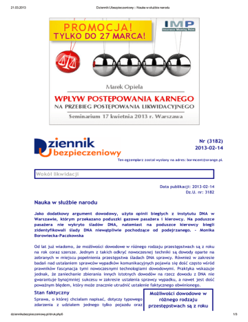 21.03.2013 Dziennik Ubezpieczeniowy :: Nauka w służbie narodu Nr (3182) 2013-02-14 Ten egzemplarz został wysłany na adres: [email protected]. Wokół likwidacji Data publikacji: 2013-02-14 Dz.U. nr: 3182 Nauka w służbie narodu Jako dodatkowy argument dowodowy, użyto opinii biegłych z instytutu DNA w Warszawie, którym przekazano poduszki gazowe pasażera i kierowcy. Na poduszce pasażera nie wykryto śladów DNA, natomiast na poduszce kierowcy biegli zidentyfikowali ślady DNA niewątpliwie pochodzące od podejrzanego. - Monika Borowiecka-Paczkowska Od lat już wiadomo, że możliwości dowodowe w różnego rodzaju przestępstwach są z roku na rok coraz szersze. Jednym z takich odkryć nowoczesnej techniki są dowody oparte na zebranych w miejscu popełnienia przestępstwa śladach DNA sprawcy. Również w zakresie badań nad ustalaniem sprawców wypadków komunikacyjnych pojawia się dość często wśród prawników fascynacja tymi nowoczesnymi technologiami dowodowymi. Praktyka wskazuje jednak, że zaniechanie zbierania innych istotnych dowodów na rzecz dowodu z DNA nie gwarantuje bynajmniej sukcesu w zakresie ustalenia sprawcy wypadku, a nawet jest dość poważnym błędem, który może znacznie utrudnić ustalenie faktycznego obwinionego. Stan faktyczny Sprawa, o której chciałam napisać, dotyczy typowego zdarzenia z udziałem jednego tylko pojazdu oraz dziennikubezpieczeniowy.pl/druk.php5 Możliwości dowodowe w różnego rodzaju przestępstwach są z roku 1/3 21.03.2013 Dziennik Ubezpieczeniowy :: Nauka w służbie narodu patrolu policyjnego, który chciał pojazd ten zatrzymać na rok coraz szersze. do kontroli. Nie muszę chyba podkreślać, że kierujący pojazdem zatrzymywanym nie zamierzał zatrzymać się z prostego powodu - prowadził ten pojazd w stanie upojenia alkoholowego. W wyniku nieudolnie podjętej ucieczki doszło do utraty przez kierującego panowania nad pojazdem. Ostatecznie pojazd ten w sposób niekontrolowany przemieścił się na pobocze, uderzając w przydrożne drzewo. Po uderzeniu w drzewo uruchomiły się poduszki gazowe przed kierowcą i pasażerem siedzącym na przednim siedzeniu. Gdy policjanci z patrolu dojechali do uciekiniera zastali następujący stan faktyczny wewnątrz pojazdu znajdowało się dwóch mężczyzn - jeden był na przednim siedzeniu pasażera, a drugi na tylnej kanapie, z tyłu za pasażerem. Znajdujący się z tyłu mężczyzna trzymał w rękach jasną czapkę. Był to wielce istotny szczegół, ponieważ czapka ta zwróciła uwagę policjantów, gdy próbowali zatrzymać pojazd do kontroli. Kto kierował, kto był pasażerem Podejrzany twierdził, że z Tak więc siedzenie kierowcy było puste. Powstało poduszką miał kontakt zatem pytanie, który z dwóch mężczyzn powinien być podczas wysiadania z wskazany jako kierujący pojazdem, a który z nich pojazdu. powinien zostać uznany za pasażera. Policjanci na podstawie tego co widzieli nie mieli wątpliwości - kierującym był mężczyzna siedzący na tylnej kanapie. Mężczyzna ten, po rozbiciu samochodu, prawdopodobnie w celu ukrycia tego, że był kierującym pojazdem, przemieścił się na tylne siedzenie, na miejsce pasażera. Było to tym bardziej oczywiste, że drugi uczestnik zdarzenia oświadczył tuż po wypadku, że siedział na miejscu pasażera z przodu i nie wie, w jaki sposób kierujący znalazł się na kanapie z tyłu pojazdu. Domniemany sprawca twierdził jednak, że nie pamięta ani przebiegu wypadku, ani tego w jaki sposób przemieścił się na tylne siedzenie. Potem jednak wszystko się skomplikowało. Pasażer zmienił zeznania twierdząc, że to on był kierującym a wskazywany podejrzany znajdował się na przednim siedzeniu pasażera i dopiero w wyniku uderzenia w drzewo przemieścił się na tylne siedzenie. Z tą wersją zgodził się też ówczesny podejrzany, nadal twierdząc, że nie pamięta przebiegu wypadku. Po bliższym zbadaniu sprawy okazało się, że nagła zmiana zeznań związana była z tym, że wskazywany podejrzany był już wcześniej karany z art. 178a par. 1 k.k. i obecne oskarżenie wiązać się będzie z bezwzględną karą pozbawienia wolności. Było zatem o co walczyć. Ślady DNA Prokurator nie miał wątpliwości, że sprawcą jest osoba z tylnego siedzenia pasażera. W późniejszym czasie, jako dodatkowy argument dowodowy, użyto opinii biegłych z instytutu DNA w Warszawie, którym przekazano poduszki gazowe pasażera i kierowcy. Na poduszce pasażera nie wykryto śladów DNA, natomiast na poduszce kierowcy biegli zidentyfikowali ślady DNA niewątpliwie pochodzące od podejrzanego. W tych okolicznościach nikt (oprócz obrońcy) nie miał wątpliwości że ślady te mogły zostać naniesione wyłącznie po uderzeniu pojazdu o drzewo. Podejrzany zaś twierdził, że z poduszką miał kontakt nie jako kierujący pojazdem, ale podczas wysiadania z pojazdu. Teza ta nie znalazła uzasadnienia, ponieważ funkcjonariusze Policji stanowczo twierdzili, że po ich przybyciu podejrzany opuścił pojazd tylnymi drzwiami, a kontakt z poduszką mógł mieć tylko pasażer podczas opuszczania pojazdu. Pomimo tych zawirowań prokurator nie miał wątpliwości, że sprawcą zdarzenia jest osoba, która znajdowała się na tylnym siedzeniu pasażera. Twarde dowody takie jak: zeznania funkcjonariuszy Policji, analiza spójności zeznań pasażera czy też opinia o niemożności niekontrolowanego przemieszczenia się kierującego na miejsce pasażera z tyłu jednoznacznie potwierdzały sprawstwo wskazywanego oskarżonego. Ciekawym w tej sprawie jest natomiast, jak w dalszym postępowaniu wykorzystany został dowód biologiczny w postaci śladu DNA. dziennikubezpieczeniowy.pl/druk.php5 2/3 21.03.2013 Dziennik Ubezpieczeniowy :: Nauka w służbie narodu W dalszym toku postępowania obrońca podnosił bowiem, że dowód ten bynajmniej nie wskazuje jednoznacznie na sprawstwo oskarżonego, bo nie zostało jednoznacznie ustalone, 