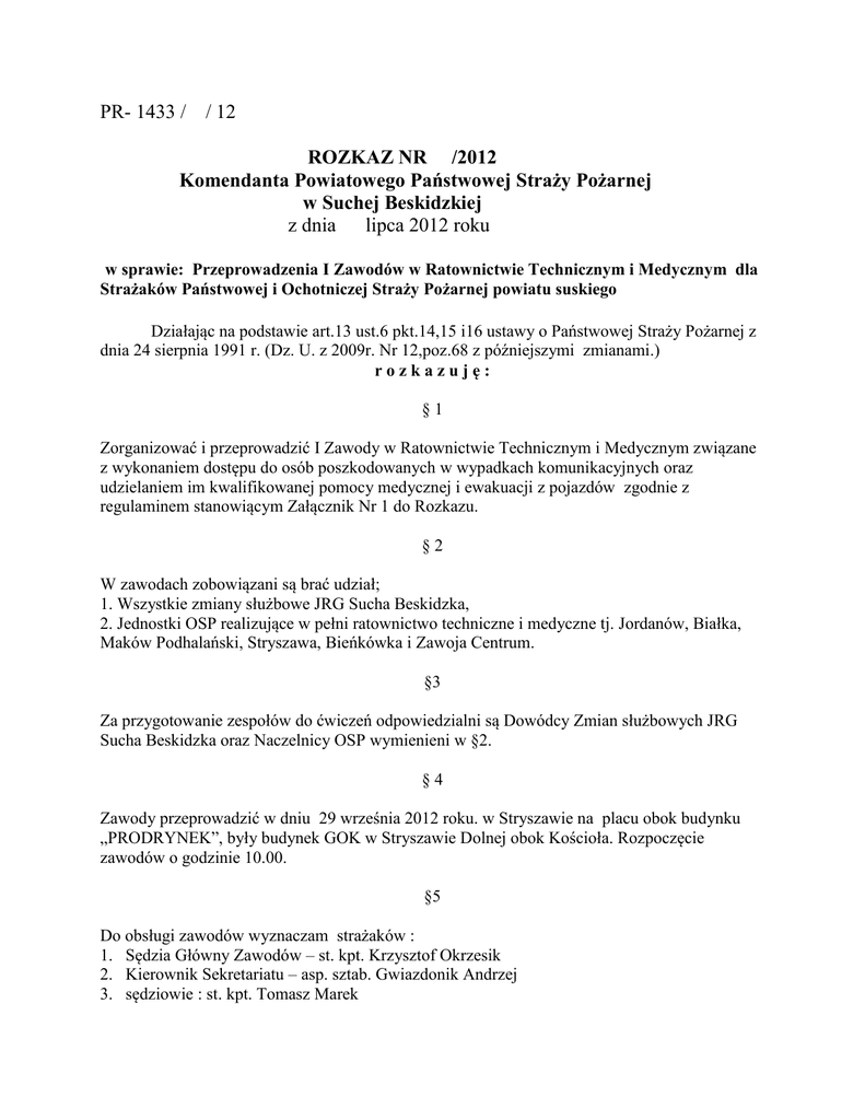 PR- 1433 / / 12 ROZKAZ NR /2012 Komendanta Powiatowego Państwowej Straży Pożarnej w Suchej Beskidzkiej z dnia lipca 2012 roku w sprawie: Przeprowadzenia I Zawodów w Ratownictwie Technicznym i Medycznym dla Strażaków Państwowej i Ochotniczej Straży Pożarnej powiatu suskiego Działając na podstawie art.13 ust.6 pkt.14,15 i16 ustawy o Państwowej Straży Pożarnej z dnia 24 sierpnia 1991 r. (Dz. U. z 2009r. Nr 12,poz.68 z późniejszymi zmianami.) rozkazuję: §1 Zorganizować i przeprowadzić I Zawody w Ratownictwie Technicznym i Medycznym związane z wykonaniem dostępu do osób poszkodowanych w wypadkach komunikacyjnych oraz udzielaniem im kwalifikowanej pomocy medycznej i ewakuacji z pojazdów zgodnie z regulaminem stanowiącym Załącznik Nr 1 do Rozkazu. §2 W zawodach zobowiązani są brać udział; 1. Wszystkie zmiany służbowe JRG Sucha Beskidzka, 2. Jednostki OSP realizujące w pełni ratownictwo techniczne i medyczne tj. Jordanów, Białka, Maków Podhalański, Stryszawa, Bieńkówka i Zawoja Centrum. §3 Za przygotowanie zespołów do ćwiczeń odpowiedzialni są Dowódcy Zmian służbowych JRG Sucha Beskidzka oraz Naczelnicy OSP wymienieni w §2. §4 Zawody przeprowadzić w dniu 29 września 2012 roku. w Stryszawie na placu obok budynku „PRODRYNEK”, były budynek GOK w Stryszawie Dolnej obok Kościoła. Rozpoczęcie zawodów o godzinie 10.00. §5 Do obsługi zawodów wyznaczam strażaków : 1. Sędzia Główny Zawodów – st. kpt. Krzysztof Okrzesik 2. Kierownik Sekretariatu – asp. sztab. Gwiazdonik Andrzej 3. sędziowie : st. kpt. Tomasz Marek 4. kpt. Łukasz Białończyk 5. kpt. Artur Chowaniak 6. sekc. Michał Szwed §6 Za przygotowanie logistyczne i techniczne zawodów czynie odpowiedzialnymi; kpt. Marcina Gąskę –kierownika sekcji kwatermistrzowsko-technicznej oraz kpt. Mariusza Leśniakiewicza – Dowódcę JRG Sucha Beskidzka. §7 Za przygotowanie zaproszeń, nagród i dyplomów oraz współpracę z ZOP ZOSP RP w Suchej Beskidzkiej czynie odpowiedzialnym asp.szt. Andrzeja Gwiazdonika kierownika sekcji organizacyjno-kadrowej . §8 Za kontakt z właścicielem obiektu oraz przygotowanie komisji sędziowskiej odpowiedzialnym czynie st. kpt. Krzysztofa Okrzesika – Zastępcę Komendanta Powiatowego PSP . §9 Zawody należy przygotować i przeprowadzić zgodnie z zasadami taktyki ratowniczej oraz wszystkich przepisów związanych z bezpieczeństwem prowadzenia działań ratowniczogaśniczych . § 10 Nadzór nad wykonaniem rozkazu powierzam st. kpt. Krzysztofowi Okrzesikowi – Zastępcy Komendanta Powiatowego PSP w Suchej Beskidzkiej. § 11 Rozkaz wchodzi w życie z dniem podpisania. ……………………….. ZATWIERDZAM Sucha Beskidzka dnia lipca 2012r. Regulamin Zawodów w Ratownictwie Technicznym i Medycznym ( wykonanie dostępu do osób poszkodowanych w wypadkach komunikacyjnych oraz udzielanie im kwalifikowanej pomocy medycznej i ewakuacji z pojazdów ) 1. Zakres zawodów Zadaniem startującego zespołu jest szybkie i efektywne wykonanie dostępu do osoby pozostającej w uszkodzonym samochodzie przy wykorzystaniu dostępnych środków i sprzętu, znanych metod taktyki i zasad postępowania według posiadanej wiedzy z uwzględnieniem zasad bezpieczeństwa i ochrony zdrowia w trakcie działań i udzielania kwalifikowanej pierwszej pomocy z uwzględnieniem stwierdzonych obrażeń, ewakuacja odpowiednim sposobem poszkodowanego na miejsce przekazania poszkodowanego służbom medycznym. Rywalizacja ma charakter akcji NIEOGRANICZONEJ. To znaczy , że przy akcji nieograniczonej można wykorzystać cały sprzęt i jego techniczne możliwości, który znajduje się na podeście.(na przykład narzędzia obsługiwane ręczne, jednostki napędzane elektrycznie, pneumatyczne hydrauliczne itd.). Zawody organizowane są w dwóch kategoriach; Kategoria Zawodowcy- w kategorii tej biorą udział strażacy Państwowej Straży Pożarnej Kategoria Ochotnicy - w kategorii tej biorą udział strażacy Ochotniczej Straży Pożarnej zaproszeni do zawodów przez organizatora. Uwaga; Start przynajmniej jednego strażaka PSP w zespole OSP bez względu na zatrudnienie w KP PSP, zespół będzie przypisany do Kategorii Zawodowców. 2. Uwarunkowania techniczne. 2.1 Pozoracja -Uszkodzone pojazdy. 1. Samochody osobowe cztero kołowe stoją na kołach , mają przednie , tylne oraz boczne szyby, wszystkie siedzenia oraz kierownicę. W samochodach zamontowany jest akumulator, połączony jednym przewodem . 2. We wnętrzu samochodu umieszczony jest pozorant, pozorant posiada symulowane obrażenia. Symulowane obrażenia są takie , żeby odpowiadały standardowemu przygotowaniu w zakresie udzielania kwalifikowanej pierwszej pomocy, które realizuje KSRG.(pozorowane obrażenia, rany , będą takie same dla wszystkich drużyn , co sprawdzał będzie koordynator medyczny przed zawodami, przed rozpoczęciem konkurencji.) 3. Ułożenia samochodów dokona organizator mając do wyporu następujące pozycje ; - samochód na kołach - samochód na dachu - samochód na boku 4. Załoga nie jest informowana o sposobie ułożenia pojazdu do ćwiczeń. Ułożenie pojazdu uszkodzonego jest przypisane do numeru wylosowanego przez dowódcę zespołu. W trakcie przygotowania pozoracji załoga startująca nie ma możliwości obserwowania przygotowania pozoracji. 2.2.Ubiór i wyposażenie startujących. Każda drużyna będzie miała własne osobiste środki ochrony, ubranie bojowe oraz obuwie, rękawice , hełm strażacki ,(okulary , rękawice lateksowe,) Każda drużyna może mieć własny dowolny sprzęt dopuszczony do stosowania w jednostkach straży pożarnej. Sprzęt przerobiony lub nieatestowany nie będzie dopuszczony do zawodów. Jeżeli zgłoszona drużyna nie będzie mogła wykorzystać w trakcie zawodów własnego sprzętu hydraulicznego , na terenie zawodów będzie znajdował się dodatkowy zestaw. Typ przygotowanego zestawu dodatkowego uzależniony będzie od możliwości organizatora. 3.O