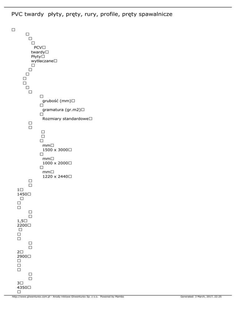 PVC twardy płyty, pręty, rury, profile, pręty spawalnicze PCV twardy Płyty wytłaczane grubość (mm) gramatura (gr.m2) Rozmiary standardowe mm 1500 x 3000 mm 1000 x 2000 mm 1220 x 2440 1 1450 1,5 2200 2 2900 3 4350 http://www.gliwenturex.com.pl - Anody niklowe Gliwenturex Sp. z o.o. Powered by Mambo Generated: 3 March, 2017, 22:25 4 5800 5 7250 6 8700 7 10150 8 11600 10 14500 12 17500 15 21750 20 29000 http://www.gliwenturex.com.pl - Anody niklowe Gliwenturex Sp. z o.o. Powered by Mambo Generated: 3 March, 2017, 22:25 25 36250 30 43500 35 50750 Standardy będące w ciągłej sprzedaży Kolory: szary RAL 7011; naturalny (kość słoniowa); czerwony; czarny Na życzenie klienta; różne kolory, rozmiary i pośrednie grubości Prze?roczyste płyty wytłaczane grubość (mm) gramatura (gr.m2) http://www.gliwenturex.com.pl - Anody niklowe Gliwenturex Sp. z o.o. Powered by Mambo Generated: 3 March, 2017, 22:25 Rozmaiary standardowe mm 1500x3000 mm 1000x2000 1 1400 1,5 2100 2 2800 3 4200 4 5600 5 7000 6 8400 8 11200 http://www.gliwenturex.com.pl - Anody niklowe Gliwenturex Sp. z o.o. Powered by Mambo Generated: 3 March, 2017, 22:25 10 14000 Standardy w ciągłej sprzedaży Na życzenie klienta Płyty prasowane grubość (mm) gramatura (gr.m2) Rozmiary standardowe (mm) 1000x2000 35 50750 40 58000 50 72500 http://www.gliwenturex.com.pl - Anody niklowe Gliwenturex Sp. z o.o. Powered by Mambo Generated: 3 March, 2017, 22:25 60 87000 70 101500 80 116000 100 145000 Standardy będące w ciągłej sprzedaży Na życzenie klienta Kolory: szary RAL 7011; naturalny (kość słoniowa) Prasowane wzmacniane płyty prze?roczyste Grubość (mm) Gramatura (gr.m2) Rozmiary standardowe http://www.gliwenturex.com.pl - Anody niklowe Gliwenturex Sp. z o.o. Powered by Mambo Generated: 3 March, 2017, 22:25 mm1150x2150 mm1300x2900 3 4800 4 6400 5 8000 standardowe produkty będące w stałej sprzedaży PCV twardy Pełne pręty okrągłe Ć mm gr/m http://www.gliwenturex.com.pl - Anody niklowe Gliwenturex Sp. z o.o. Powered by Mambo Generated: 3 March, 2017, 22:25 Ć mm gr/m 5 32 65 4900 6 45 70 5650 8 77 75 6500 10 120 80 7400 12 170 85 8350 15 270 90 9350 16 300 100 11500 18 380 110 13900 20 470 115 14850 22 560 http://www.gliwenturex.com.pl - Anody niklowe Gliwenturex Sp. z o.o. Powered by Mambo Generated: 3 March, 2017, 22:25 120 16500 25 730 130 19400 30 1050 140 22500 32 1190 150 25800 35 1420 160 29300 40 1860 180 38000 45 2340 200 47300 50 2900 225 59900 55 3500 250 72000 60 4200 300 106000 http://www.gliwenturex.com.pl - Anody niklowe Gliwenturex Sp. z o.o. Powered by Mambo Generated: 3 March, 2017, 22:25 Kolory: szary, naturalny, czerwony/czarny ( aż do Ć = 200 mm) Długość standardowa: Ć 5-250 mm: 2m Ć 300 mm: 0,5m Pręty okrągłe drążone Ćmm gr/m Ćmm gr/m 10 x 30 990 70 x 100 9280 15 x 35 1240 40 x 110 8150 15 x 40 1700 50 x 110 6800 http://www.gliwenturex.com.pl - Anody niklowe Gliwenturex Sp. z o.o. Powered by Mambo Generated: 3 March, 2017, 22:25 20 x 40 1500 60 x 110 12830 20 x 50 2010 75 x 110 11780 25 x 50 2560 40 x 120 10620 30 x 50 2350 50 x 120 8480 20 x 60 2070 60 x 120 15450 30 x 60 3860 50 x 120 14550 30 x 65 3370 60 x 120 13400 20 x 70 4100 75 x 120 11700 http://www.gliwenturex.com.pl - Anody niklowe Gliwenturex Sp. z o.o. Powered by Mambo Generated: 3 March, 2017, 22:25 30 x 70 5390 50 x 130 17500 35 x 70 4900 90 x 130 11640 50 x 75 4550 60 x 140 19580 30 x 80 4130 70 x 150 22050 40 x 80 6680 80 x 150 19980 50 x 80 5780 100 x 160 19850 25 x 90 5060 120 x 180 23050 30 x 90 8960 http://www.gliwenturex.com.pl - Anody niklowe Gliwenturex Sp. z o.o. Powered by Mambo Generated: 3 March, 2017, 22:25 140 x 180 17300 35 x 90 8700 100 x 200 36700 50 x 90 8350 150 x 200 22850 60 x 90 7050 140 x 225 39800 30 x 100 5920 150 x 225 35350 60 x 100 10900 150 x 250 50000 160 x 250 44500 Na życzenie klienta Kolory: szary, naturalny (kość słoniowa), czarny, czerwony http://www.gliwenturex.com.pl - Anody niklowe Gliwenturex Sp. z o.o. Powered by Mambo Generated: 3 March, 2017, 22:25 Standardowa długość: 2m Pręty prostokątne bxh (mm) gr/m bxh (mm) gr/m 20 x 7 210 50 x 5 350 20 x 10 300 50 x 10 700 20 x 15 420 50 x 15 1100 25 x 5 195 http://www.gliwenturex.com.pl - Anody niklowe Gliwenturex Sp. z o.o. Powered by Mambo Generated: 3 March, 2017, 22:25 50 x 20 1400 25 x 10 350 50 x 30 2150 25 x 15 530 50 x 40 2900 25 x 20 700 60 x 8 670 30 x 3 130 60 x 12 1000 30 x 10 420 60 x 20 1700 30 x 15 650 60 x 25 2100 30 x 20 850 60 x 50 4300 35 x 6 http://www.gliwenturex.com.pl - Anody niklowe Gliwenturex Sp. z o.o. Powered by Mambo Generated: 3 March, 2017, 22:25 300 62 x 32 3000 35 x 10 490 70 x 26 2700 35 x 15 760 80 x 6 720 39 x 27 1480 80 x 20 2250 40 x 10 560 80 x 30 3360 40 x 20 1150 80 x 50 5800 45 x 15 950 100 x 6 900 45 x 25 1600 114 x 55 9500 http://www.gliwenturex.com.pl - Anody niklowe Gliwenturex Sp. z o.o. Powered by Mambo Generated: 3 March, 2017, 22:25 http://www.gliwenturex.com.pl - Anody niklowe Gliwenturex Sp. z o.o. Powered by Mambo Generated: 3 March, 2017, 22:25
