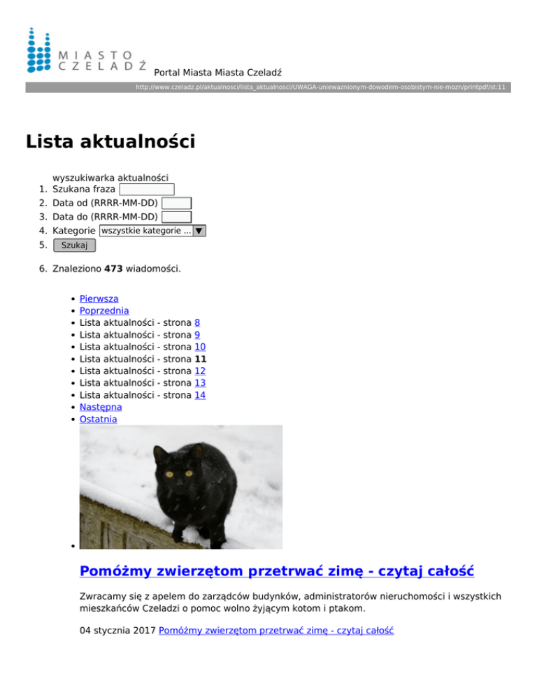 Portal Miasta Miasta Czeladź http://www.czeladz.pl/aktualnosci/lista_aktualnosci/UWAGA-uniewaznionym-dowodem-osobistym-nie-mozn/printpdf/st:11 Lista aktualności wyszukiwarka aktualności 1. Szukana fraza 2. Data od (RRRR-MM-DD) 3. Data do (RRRR-MM-DD) 4. Kategorie wszystkie kategorie ... ▼ 5. Szukaj 6. Znaleziono 473 wiadomości. Pierwsza Poprzednia Lista aktualności - strona 8 Lista aktualności - strona 9 Lista aktualności - strona 10 Lista aktualności - strona 11 Lista aktualności - strona 12 Lista aktualności - strona 13 Lista aktualności - strona 14 Następna Ostatnia Pomóżmy zwierzętom przetrwać zimę - czytaj całość Zwracamy się z apelem do zarządców budynków, administratorów nieruchomości i wszystkich mieszkańców Czeladzi o pomoc wolno żyjącym kotom i ptakom. 04 stycznia 2017 Pomóżmy zwierzętom przetrwać zimę - czytaj całość Orszak Trzech Króli - czytaj całość Galeria Sztuki Współczesnej "Elektrownia" serdecznie zaprasza w piątek, 6 stycznia na Orszak Trzech Króli oraz Przedstawienie Jasełkowe. 03 stycznia 2017 Orszak Trzech Króli - czytaj całość Powitaliśmy rok 2017 - czytaj całość Tegoroczny Sylwester na czeladzkim rynku należy zaliczyć to bardzo udanych. 03 stycznia 2017 Powitaliśmy rok 2017 - czytaj całość Mieszkańcy zdecydowali - czytaj całość Zakończyła się weryfikacja głosów mieszkańców. Trzecia edycja Budżetu Obywatelskiego zaskoczyła rekordową, w porównaniu do lat ubiegłych, frekwencją. 30 grudnia 2016 Mieszkańcy zdecydowali - czytaj całość Rocznica wybuchu w łaźni miejskiej - czytaj całość W czwartek, 29 grudnia o godzinie 12.00 odbędzie się uroczystość upamiętniająca 76. rocznicę wybuchu w łaźni miejskiej. 28 grudnia 2016 Rocznica wybuchu w łaźni miejskiej - czytaj całość Zbiórka przedmiotów na licytacje WOŚP - czytaj całość Ogłaszamy zbiórkę przedmiotów, które będziemy licytować podczas 25. Finału Wielkiej Orkiestry Świątecznej Pomocy. 28 grudnia 2016 Zbiórka przedmiotów na licytacje WOŚP - czytaj całość Sylwester 2016 - czytaj całość Sylwester 2016 na czeladzkim rynku będzie w tym roku wyjątkowo gorący. 28 grudnia 2016 Sylwester 2016 - czytaj całość 24.12.2016 - czytaj całość Pies, mieszaniec, jasnobrązowy, biały krawat, krótki włos, wiek 12/2014, znaleziony 24.12.2016 w Czeladzi, przy ul. Wojkowickiej 28 grudnia 2016 24.12.2016 - czytaj całość Konkurs na najpiękniejszą iluminację - czytaj całość Podobnie jak w ubiegłym roku, czekamy na zgłoszenia najpiękniej rozświetlonych posesji i balkonów. 23 grudnia 2016 Konkurs na najpiękniejszą iluminację - czytaj całość „W Czeladzi zagrałem pierwsze dźwięki” - czytaj całość Benefis Henryka Kuźniaka, z okazji 80. Urodzin wybitnego kompozytora muzyki filmowej, był jednym z najważniejszych wydarzeń kulturalnych w Czeladzi 2016 roku. 23 grudnia 2016 „W Czeladzi zagrałem pierwsze dźwięki” - czytaj całość Pierwsza Poprzednia Lista aktualności - strona 8 Lista aktualności - strona 9 Lista aktualności - strona 10 Lista aktualności - strona 11 Lista aktualności - strona 12 Lista aktualności - strona 13 Lista aktualności - strona 14 Następna Ostatnia