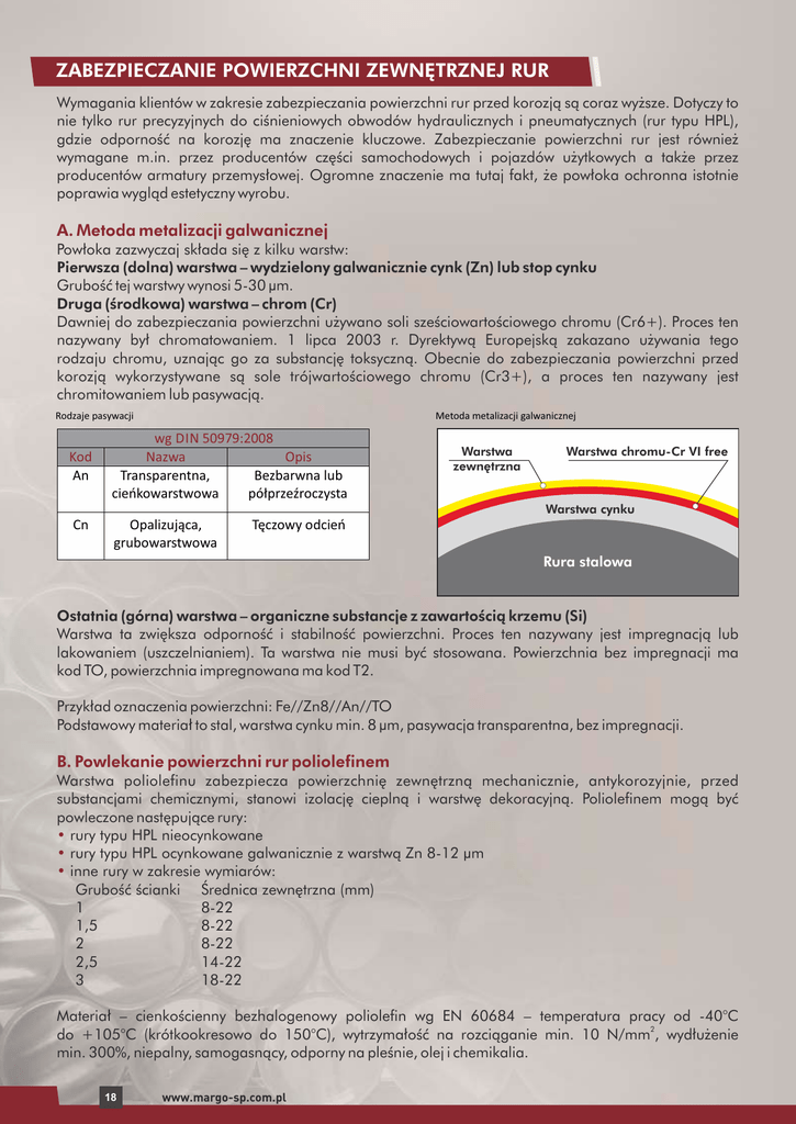 ZABEZPIECZANIE POWIERZCHNI ZEWNĘTRZNEJ RUR Wymagania klientów w zakresie zabezpieczania powierzchni rur przed korozją są coraz wyższe. Dotyczy to nie tylko rur precyzyjnych do ciśnieniowych obwodów hydraulicznych i pneumatycznych (rur typu HPL), gdzie odporność na korozję ma znaczenie kluczowe. Zabezpieczanie powierzchni rur jest również wymagane m.in. przez producentów części samochodowych i pojazdów użytkowych a także przez producentów armatury przemysłowej. Ogromne znaczenie ma tutaj fakt, że powłoka ochronna istotnie poprawia wygląd estetyczny wyrobu. A. Metoda metalizacji galwanicznej Powłoka zazwyczaj składa się z kilku warstw: Pierwsza (dolna) warstwa – wydzielony galwanicznie cynk (Zn) lub stop cynku Grubość tej warstwy wynosi 5-30 μm. Druga (środkowa) warstwa – chrom (Cr) Dawniej do zabezpieczania powierzchni używano soli sześciowartościowego chromu (Cr6+). Proces ten nazywany był chromatowaniem. 1 lipca 2003 r. Dyrektywą Europejską zakazano używania tego rodzaju chromu, uznając go za substancję toksyczną. Obecnie do zabezpieczania powierzchni przed korozją wykorzystywane są sole trójwartościowego chromu (Cr3+), a proces ten nazywany jest chromitowaniem lub pasywacją. Rodzaje pasywacji Kod An Metoda metalizacji galwanicznej wg DIN 50979:2008 Nazwa Opis Transparentna, Bezbarwna lub cieńkowarstwowa półprzeźroczysta Warstwa zewnętrzna Warstwa chromu-Cr VI free Warstwa cynku Cn Opalizująca, grubowarstwowa Tęczowy odcień Rura stalowa Ostatnia (górna) warstwa – organiczne substancje z zawartością krzemu (Si) Warstwa ta zwiększa odporność i stabilność powierzchni. Proces ten nazywany jest impregnacją lub lakowaniem (uszczelnianiem). Ta warstwa nie musi być stosowana. Powierzchnia bez impregnacji ma kod TO, powierzchnia impregnowana ma kod T2. Przykład oznaczenia powierzchni: Fe//Zn8//An//TO Podstawowy materiał to stal, warstwa cynku min. 8 μm, pasywacja transparentna, bez impregnacji. B. Powlekanie powierzchni rur poliolefinem Warstwa poliolefinu zabezpiecza powierzchnię zewnętrzną mechanicznie, antykorozyjnie, przed substancjami chemicznymi, stanowi izolację cieplną i warstwę dekoracyjną. Poliolefinem mogą być powleczone następujące rury: • rury typu HPL nieocynkowane • rury typu HPL ocynkowane galwanicznie z warstwą Zn 8-12 μm • inne rury w zakresie wymiarów: Grubość ścianki Średnica zewnętrzna (mm) 1 8-22 1,5 8-22 2 8-22 2,5 14-22 3 18-22 Materiał – cienkościenny bezhalogenowy poliolefin wg EN 60684 – temperatura pracy od -40°C do +105°C (krótkookresowo do 150°C), wytrzymałość na rozciąganie min. 10 N/mm2, wydłużenie min. 300%, niepalny, samogasnący, odporny na pleśnie, olej i chemikalia. 18 www.margo-sp.com.pl