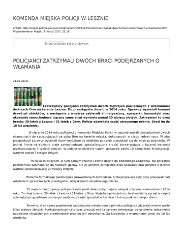 KOMENDA MIEJSKA POLICJI W LESZNIE Źródło: http://leszno.policja.gov.pl/w13/aktualnosci/69348,Policjanci-zatrzymali-dwoch-braci-podejrzanych-o-wlamania.html Wygenerowano: Piątek, 3 marca 2017, 22:16 Strona znajduje się w archiwum. POLICJANCI ZATRZYMALI DWÓCH BRACI PODEJRZANYCH O WŁAMANIA 21.05.2015r. Leszczyńscy policjanci zatrzymali dwóch mężczyzn powiązanych z włamaniami do trzech firm na terenie Leszna. Do przestępstw doszło w 2014 roku. Sprawcy wyważali łomami drzwi od obiektów, a następnie z wnętrza zabierali klimatyzatory, spawarki, kosmetyki oraz akcesoria samochodowe. Łączna suma strat wyniosła ponad 30 tysięcy złotych. Zatrzymani to dwaj bracia: 30-latek z Leszna i 31-latek z Góry. Policja odzyskała część utraconego mienia. Grozi im do 10 lat więzienia. W sierpniu 2014 roku policjanci z Komendy Miejskiej Policji w Lesznie zostali powiadomieni dwóch włamaniach do sąsiadujących ze sobą firm na terenie miasta, dokonanych w ciągu jednej nocy. W obu przypadkach sprawcy wyłamali drzwi wejściowe do obiektów po czym przedostali się do wnętrza budynków. W jednej firmie skradziono oleje samochodowe, specjalistyczne środki konserwujące o łącznej wartości przekraczającej 5 tysięcy złotych. W pobliskim obiekcie łupem sprawców padło 10 kompletów klimatyzacji, wartych ponad 3 tysiące złotych. Po kilku miesiącach, w tym samym rejonie Leszna doszło do podobnego zdarzenia. Na początku października włamano się do hurtowni gazów, a z jej wnętrza skradziono kilka spawarek oraz przyłbic o łącznej wartości przekraczającej 20 tysięcy złotych. Pomimo formalnego zakończenia prowadzonych dochodzeń, funkcjonariusze cały czas pracowali nad ustaleniem sprawców tych przestępstw i odzyskaniem skradzionego mienia. 15 maja br. leszczyńscy policjanci zatrzymali dwie osoby mające związek z trzema włamaniami z 2014 roku. To dwaj bracia: 30-latek z Leszna i 31-latek z Góry. Wyjaśnili policjantom, że skradziony sprzęt w części spieniężyli przypadkowo poznanym osobom, a część sprzedali w komisach lub w punktach skupu złomu. Pomimo, iż od czasu popełnienia przestępstw minęło ponad pół roku policjanci odzyskali mienie warte kilka tysięcy złotych. Funkcjonariusze cały czas pracują nad tą sprawą zmierzając do ustalenia tożsamości nabywców skradzionych przedmiotów oraz do ich odzyskania. Za kradzieże z włamaniami grozi do 10 lat więzienia. AKTUALNOSCI_2015/MAJ/WLAMANIA Ocena: 0/5 (0) Tweetnij