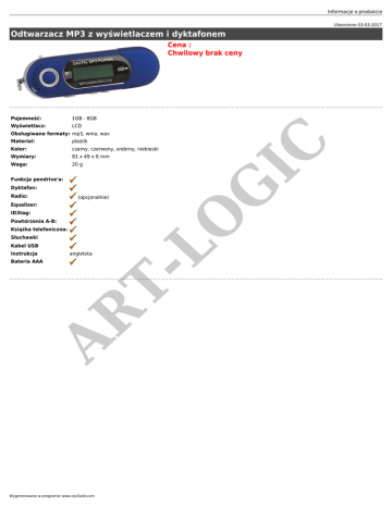 Informacje o produkcie Utworzono 03-03-2017 Odtwarzacz MP3 z wyświetlaczem i dyktafonem Cena : Chwilowy brak ceny Pojemność: 1GB - 8GB Wyświetlacz: LCD Material: plastik Kolor: czarny, czerwony, srebrny, niebieski Wymiary: 81 x 49 x 8 mm Waga: 20 g Funkcja pendrive'a: Dyktafon: Radio: (opcjonalnie) ID3tag: AR TLO Equalizer: G IC Obsługiwane formaty: mp3, wma, wav Powtórzenia A-B: Książka telefoniczna: Słuchawki Kabel USB Instrukcja angielska Bateria AAA Wygenerowano w programie www.oscGold.com