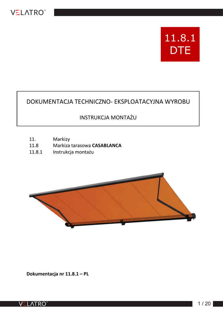 11.8.1 DTE DOKUMENTACJA TECHNICZNO- EKSPLOATACYJNA WYROBU INSTRUKCJA MONTAŻU 11. 11.8 11.8.1 Markizy Markiza tarasowa CASABLANCA Instrukcja montażu Dokumentacja nr 11.8.1 – PL 1 / 20 �������������������� DOKUMENTACJA TECHNICZNO – EKSPLOATACYJNA WYROBU Instrukcja montażu 11.8.1 DT-E NAZWA WYROBU MARKIZA TARASOWA CASABLANCA OZNACZENIE PRODUCENTA WYROBU: Nazwa producenta: • SELT Sp. z o.o. Siedziba producenta: • 45- 449 Opole, ul. Wschodnia 23A Strona internetowa • www.selt.com Adres zakładu : • Wydział Produkcji Markiz 45- 449 Opole, ul. Wschodnia 23A Dane teleadresowe: • Tel: +48 77 553 21 00 (sekretariat) Fax: +48 77 553 22 00 Adres poczty internetowej: • [email protected] OZNACZENIE BEZPIECZEŃSTWA WYROBU: • Wyrób spełnia wymagania bezpieczeństwa CE Niniejsza dokumentacja techniczno-eksploatacyjna: • jest ważna od dnia: 01 marzec 2016 r. • obowiązuje dla wersji wyrobów oznaczonych powyżej 2 / 20 �������������������� Spis treści 1 2 3 4 5 Wstęp ............................................................................................................................................................. 4 1.1 Wskazówki bezpieczeństwa wyrobu ..................................................................................................... 4 1.2 Objaśnienie symboli i znaków ............................................................................................................... 4 1.3 Definicje ................................................................................................................................................ 5 1.4 Przedmiot, przeznaczenie i zawartość dokumentacji ............................................................................. 5 Informacja techniczna wyrobu ...................................................................................................................... 6 2.1 Parametry techniczne ............................................................................................................................. 6 2.2 Budowa markizy Casablanca ................................................................................................................. 6 2.3 Rodzaje uchwytów ................................................................................................................................ 7 Montaż wyrobu .............................................................................................................................................. 8 3.1 Ogólne wymagania bezpiecznego montażu ........................................................................................... 8 3.2 Wymagania dotyczące bezpiecznego montażu wyrobu na wysokości .................................................. 8 3.3 Przygotowanie do montażu.................................................................................................................... 8 3.4 Ogólne wytyczne do montażu wyrobu .................................................................................................. 9 3.5 Narzędzia montażowe............................................................................................................................ 9 3.6 Montaż markizy Casablanca– uchwyt ścienny .................................................................................... 10 3.7 Montaż markizy Casablanca – uchwyt sufitowy ................................................................................. 14 3.8 Montaż markizy Casablanca – uchwyt dachowy ................................................................................. 15 3.9 Napęd elektryczny ............................................................................................................................... 16 3.9.1 Podłączenie do instalacji elektrycznej ........................................................................................ 16 3.9.2 Sterowanie .................................................................................................................................. 17 3.9.3 Uruchomienie i regulacja ............................................................................................................ 17 3.10 Napęd ręczny ................................................................................................................................... 18 Uwagi końcowe ........................................................................................................................................... 19 4.1 Kompletność oraz stan jakościowy dostawy ....................................................................................... 19 4.2 Ogólne warunki transportu i składowania wyrobu .............................................................................. 19 Oznakowanie i etykietowanie znakiem CE wyrobu .................................................................................... 20 5.1 Zgodność wyrobu z normą CE ............................................................................................................ 20 5.2 Informacje towarzyszące oznakowaniu CE ......................................................................................... 20 3 / 20 �������������������� 1 Wstęp 1.1 Wskazówki bezpieczeństwa wyrobu Wyrób został wykonany zgodnie z najnowszą wiedzą techniczną w dziedzinie konstruowania oraz technologii wytwarzania i spełnia wymogi bezpieczeństwa zgodnie z poniższymi normami. Lp. Przedmiot Europejska Podstawa Prawna Polska Podstawa Prawna 1 Zasłony zewnętrzne Wymagania eksploatacyjne łącznie z bezpieczeństwem Wyroby budowlane (CPR) EN- 13561:2004+A1:2008 PN-EN-13561:2004+A1:2010 Rozporządzenie 305/2011 Parlamentu Europejskiego i Rady Ustawa z dnia 16.04.2004 o wyrobach budowlanych (Dz. U. 2004 nr 92 poz. 881) z późniejszymi zmianami z dnia 25 czerwca 2015 r. Dz. U. 2015 poz.