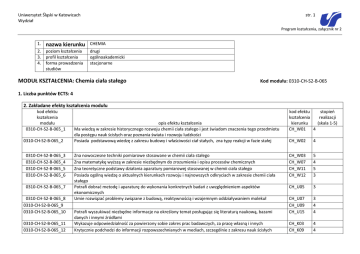 Uniwersytet Śląski w Katowicach Wydział str. 1 Program kształcenia, załącznik nr 2 1. nazwa kierunku CHEMIA 2. 3. 4. poziom kształcenia profil kształcenia forma prowadzenia studiów drugi ogólnoakademicki stacjonarne MODUŁ KSZTAŁCENIA: Chemia ciała stałego Kod modułu: 0310-CH-S2-B-065 1. Liczba punktów ECTS: 4 2. Zakładane efekty kształcenia modułu kod efektu kształcenia modułu 0310-CH-S2-B-065_1 0310-CH-S2-B-065_2 0310-CH-S2-B-065_3 0310-CH-S2-B-065_4 0310-CH-S2-B-065_5 0310-CH-S2-B-065_6 0310-CH-S2-B-065_7 0310-CH-S2-B-065_8 0310-CH-S2-B-065_9 0310-CH-S2-B-065_10 0310-CH-S2-B-065_11 0310-CH-S2-B-065_12 opis efektu kształcenia Ma wiedzą w zakresie historycznego rozwoju chemii ciała stałego i jest świadom znaczenia tego przedmiotu dla postępu nauk ścisłych oraz poznania świata i rozwoju ludzkości Posiada podstawową wiedzę z zakresu budowy i właściwości ciał stałych, zna typy reakcji w fazie stałej Zna nowoczesne techniki pomiarowe stosowane w chemii ciała stałego Zna matematykę wyższą w zakresie niezbędnym do zrozumienia i opisu procesów chemicznych Zna teoretyczne podstawy działania aparatury pomiarowej stosowanej w chemii ciała stałego Posiada ogólną wiedzę o aktualnych kierunkach rozwoju i najnowszych odkryciach w zakresie chemii ciała stałego Potrafi dobrać metodę i aparaturę do wykonania konkretnych badań z uwzględnieniem aspektów ekonomicznych Umie rozwiązać problemy związane z budową, reaktywnością i wzajemnym oddziaływaniem molekuł Potrafi wyszukiwać niezbędne informacje na określony temat posługując się literaturą naukową, bazami danych i innymi źródłami Wykazuje odpowiedzialność za powierzony sobie zakres prac badawczych, za pracę własną i innych Krytycznie podchodzi do informacji rozpowszechnianych w mediach, szczególnie z zakresu nauk ścisłych kod efektu stopień kształcenia realizacji kierunku (skala 1-5) CH_W01 4 CH_W02 4 CH_W03 CH_W07 CH_W11 CH_W12 5 4 5 3 CH_U05 3 CH_U07 CH_U09 CH_U15 3 4 4 CH_K03 CH_K09 4 4 Uniwersytet Śląski w Katowicach Wydział str. 2 Program kształcenia, załącznik nr 2 3. Opis modułu Opis Wymagania wstępne modułu Moduł Chemia ciała stałego (wykład i konwersatorium) ma za zadanie wykształcenie umiejętności swobodnego posługiwania się podstawowymi pojęciami z zakresu budowy i chemii ciała stałego. Przewiduje się realizację następujących treści programowych: 1. Budowa ciała stałego: opis struktury ciała stałego, teoria pola krystalicznego, struktura elektronową ciała stałego, model pasmowy ciała stałego, poziom Fermiego, powierzchnia ciała stałego. 2. Defekty w ciele stałym: punktowe, liniowe, powierzchniowe. Roztwory substytucyjne i międzywęzłowe; oddziaływania między defektami; związki o składzie niestechiometrycznym. 3. Procesy dyfuzyjne zachodzące w ciele stałym, fenomenologiczny opis dyfuzji, mechanizmy dyfuzji. 4. Reakcje zachodzące w fazie stałej, mechanizmy tych reakcji, reakcje topochemiczne, efekt Kirkendalla, termodynamiczny i strukturalny model wydzielania się faz, reakcje w układach jedno- i wielofazowych. Znajomość podstawowych pojęć i praw chemii, fizyki i matematyki wyższej 4. Sposoby weryfikacji efektów kształcenia modułu kod nazwa (typ) sposobu weryfikacji 0310-CH-S2-B- Egzamin pisemny 065_w_1 0310-CH-S2-B- Kolokwium 065_w_2 0310-CH-S2-B- Aktywność na zajęciach 065_w_3 opis szczegółowy efekt(-y) kształcenia modułu Egzamin pisemny weryfikujący wiedzę oraz umiejętności studenta obejmujący wszystkie treści programowe realizowane na wykładzie i zajęciach laboratoryjnych. Warunkiem przystąpienia do egzaminu jest zaliczenie laboratorium. Skala ocen 2-5. Sprawdzian pisemny weryfikujący wiedzę oraz umiejętności studenta obejmujący materiał realizowany na zajęciach laboratoryjnych. Dwa kolokwia w trakcie semestru + kolokwium poprawkowe. Skala ocen 2-5 Ocena umiejętności samodzielnego rozwiązania zadania lub problemu w trakcie zajęć w oparciu o wiedzę zdobytą na wykładzie lub w czasie samodzielnej pracy z podręcznikiem. Skala ocen 2-5. 0310-CH-S2-B-065_1 , 0310-CH-S2-B-065_2, 0310-CH-S2-B-065_4 , 0310-CH-S2-B-065_6 0310-CH-S2-B-065_2 , 0310-CH-S2-B-065_5 0310-CH-S2-B-065_7, 0310-CH-S2-B-065_9 0310-CH-S2-B-065_2 , 0310-CH-S2-B-065_3 0310-CH-S2-B-065_8, 0310-CH-S2-B-065_10, 0310-CH-S2-B-065_11, 0310-CH-S2-B-065_12 Uniwersytet Śląski w Katowicach Wydział str. 3 Program kształcenia, załącznik nr 2 5.a Formy prowadzenia zajęć (studia prowadzone w formie stacjonarnej) nazwa forma prowadzenia zajęć opis (z uwzględnieniem metod dydaktycznych) Wykład omawiający podstawowe zagadnienia z zakresu chemii ciała stałego z wykorzystaniem pomocy audiowizualnych liczba godzin 30 praca własna studenta opis liczba godzin 30 0310-CH-S2B-065_fs_1 Wykład 0310-CH-S2B-065_fs_2 Konwersatorium Rozwiązywanie zadań i problemów dotyczących zagadnień związanych z chemią ciała stałego 15 Samodzielna praca studenta mająca na celu przyswojenie zagadnień omawianych na wykładzie w oparciu o notatki własne oraz wskazaną literaturę podstawową i uzupełniającą. Przygotowanie teoretyczne do zajęć. 35 Samodzielne rozwiązywanie zadań i problemów ze wskazanej w sylabusie literatury. Przygotowanie do prezentacji, samodzielne przyswojenie wiedzy odnośnie zagadnień wskazanych na wykładzie. 0310-CH-S2B-065_fs_3 Konsultacje Konsultacje indywidualne lub grupowe mające na celu pomoc w rozwiązywaniu trudności wynikających z realizacji treści programowych modułu. suma godzin: 45 Analiza treści programowych 15 realizowanych na wykładzie i laboratorium celem znalezienia obszarów wiedzy sprawiających trudności. suma godzin: 80 sposób weryfikacji efektów kształcenia punkty ECTS 0310-CH-S2-B-065_w_1 2 0310-CH-S2-B-065_w_2 0310-CH-S2-B-065_w_3 2 suma punktów: 4