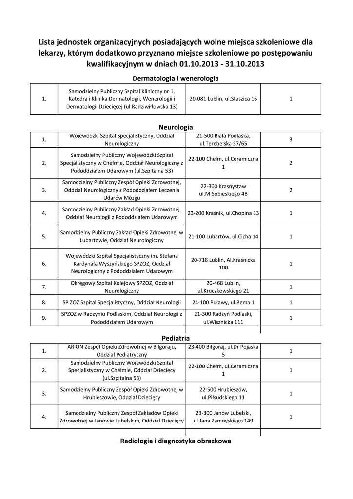 Lista jednostek organizacyjnych posiadających wolne miejsca szkoleniowe dla lekarzy, którym dodatkowo przyznano miejsce szkoleniowe po postępowaniu kwalifikacyjnym w dniach 01.10.2013 - 31.10.2013 Dermatologia i wenerologia 1. Samodzielny Publiczny Szpital Kliniczny nr 1, Katedra i Klinika Dermatologii, Wenerologii i Dermatologii Dziecięcej (ul.Radziwiłłowska 13) 20-081 Lublin, ul.Staszica 16 1 Neurologia 1. 2. Wojewódzki Szpital Specjalistyczny, Oddział Neurologiczny 21-500 Biała Podlaska, ul.Terebelska 57/65 Samodzielny Publiczny Wojewódzki Szpital 22-100 Chełm, ul.Ceramiczna Specjalistyczny w Chełmie, Oddział Neurologiczny z 1 Pododdziałem Udarowym (ul.Szpitalna 53) 3 2 3. Samodzielny Publiczny Zespół Opieki Zdrowotnej, Oddział Neurologiczny z Pododdziałem Leczenia Udarów Mózgu 22-300 Krasnystaw ul.M.Sobieskiego 4B 2 4. Samodzielny Publiczny Zakład Opieki Zdrowotnej, Oddział Neurologii z Pododdziałem Udarowym 23-200 Kraśnik, ul.Chopina 13 1 Samodzielny Publiczny Zakład Opieki Zdrowotnej w 21-100 Lubartów, ul.Cicha 14 Lubartowie, Oddział Neurologiczny 1 5. 6. Wojewódzki Szpital Specjalistyczny im. Stefana Kardynała Wyszyńskiego SPZOZ, Oddział Neurologiczny z Pododdziałem Udarowym 20-718 Lublin, Al.Kraśnicka 100 1 7. Okręgowy Szpital Kolejowy SPZOZ, Oddział Neurologiczny 20-468 Lublin, ul.Kruczkowskiego 21 1 8. SP ZOZ Szpital Specjalistyczny, Oddział Neurologii 24-100 Puławy, ul.Bema 1 1 9. SPZOZ w Radzyniu Podlaskim, Oddział Neurologii z Pododdziałem Udarowym 21-300 Radzyń Podlaski, ul.Wisznicka 111 1 ARION Zespół Opieki Zdrowotnej w Biłgoraju, Oddział Pediatryczny Samodzielny Publiczny Wojewódzki Szpital Specjalistyczny w Chełmie, Oddział Dziecięcy (ul.Szpitalna 53) 23-400 Biłgoraj, ul.Dr Pojaska 5 1 22-100 Chełm, ul.Ceramiczna 1 1 3. Samodzielny Publiczny Zespół Opieki Zdrowotnej w Hrubieszowie, Oddział Dziecięcy 22-500 Hrubieszów, ul.Piłsudskiego 11 1 4. Samodzielny Publiczny Zespół Zakładów Opieki Zdrowotnej w Janowie Lubelskim, Oddział Dziecięcy 23-300 Janów Lubelski, ul.Jana Zamoyskiego 149 1 Pediatria 1. 2. Radiologia i diagnostyka obrazkowa 1. Samodzielny Publiczny Wojewódzki Szpital Specjalistyczny w Chełmie, Zakład Radiologii (ul.Szpitalna 53) 22-100 Chełm, ul.Ceramiczna 1 3 2. Samodzielny Publiczny Zakład Opieki Zdrowotnej, Pracownia Radiologii i Diagnostyki Obrazowej 23-200 Kraśnik, ul.Chopina 13 1 Centrum Onkologii Ziemi Lubelskiej, Zakład Rentgenodiagnostyki Samodzielny Publiczny Szpital Wojewódzki im.Papieża Jana Pawła II, Zakład Radiologii 20-090 Lublin, ul.Jaczewskiego 7 22-400 Zamość, ul.Aleje Jana Pawła II 10 3. 4. 1 2 Stomatologia dziecięca 1. Stomatologiczne Centrum Kliniczne Uniwersytetu Medycznego w Lublinie, Poradnia Stomatologii Wieku Rozwojowego 20-081 Lublin, ul.Karmelicka 7 4 Zdrowie publiczne 1. Instytut Medycyny Wsi, Ośrodek Kształcenia w zakresie Zdrowia Publicznego 20-950 Lublin, ul.Jaczewskiego 2 1