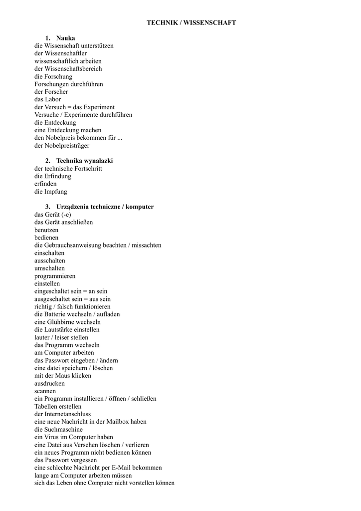TECHNIK / WISSENSCHAFT 1. Nauka die Wissenschaft unterstützen der Wissenschaftler wissenschaftlich arbeiten der Wissenschaftsbereich die Forschung Forschungen durchführen der Forscher das Labor der Versuch = das Experiment Versuche / Experimente durchführen die Entdeckung eine Entdeckung machen den Nobelpreis bekommen für ... der Nobelpreisträger 2. Technika wynalazki der technische Fortschritt die Erfindung erfinden die Impfung 3. Urządzenia techniczne / komputer das Gerät (-e) das Gerät anschließen benutzen bedienen die Gebrauchsanweisung beachten / missachten einschalten ausschalten umschalten programmieren einstellen eingeschaltet sein = an sein ausgeschaltet sein = aus sein richtig / falsch funktionieren die Batterie wechseln / aufladen eine Glühbirne wechseln die Lautstärke einstellen lauter / leiser stellen das Programm wechseln am Computer arbeiten das Passwort eingeben / ändern eine datei speichern / löschen mit der Maus klicken ausdrucken scannen ein Programm installieren / öffnen / schließen Tabellen erstellen der Internetanschluss eine neue Nachricht in der Mailbox haben die Suchmaschine ein Virus im Computer haben eine Datei aus Versehen löschen / verlieren ein neues Programm nicht bedienen können das Passwort vergessen eine schlechte Nachricht per E-Mail bekommen lange am Computer arbeiten müssen sich das Leben ohne Computer nicht vorstellen können einen gebrauchten Computer kaufen in einem guten Zustand moderne Kommunikationsmittel sich eine virtuelle Welt schaffen ROZMÓWKA W Twojej szkole oddano do użytku nową pracownię multimedialną. W rozmowie z kolegą omów następujące kwestie: 1. 2. 3. 4. sprzęt i wyposażenie pracowni wielkość i lokalizację możliwości wykorzystania pracowani wpływ nowej pracowni na atrakcyjność zajęć ein moderner Multimedia-Raum ausgestattet mit sich freuen über der Bildschirm der Fernseher der Multimedia-Projektor die Hi-Fi-Anlage von sehr guter Qualität ...... Personen auf einmal benutzen von ... bis ... geöffnet sein OPIS OBRAZKA MATERIAŁ STYMULUJĄCY Twoim zadaniem jest wybranie zdjęcia do gazetki szkolnej ilustrującego temat artykułu "Najlepsze wynalazki ludzkości". Uzasadnij swój wybór i powiedz, dlaczego odrzucasz pozostałe propozycje. Bild 1 Bild 2 Bild 3 PRZYKŁADOWE PYTANIA 1. Welche Rolle spielt der Computer in deinem Leben? Warum? 2. Welche Rolle spielt das Internet in deinem Leben? Warum? 3. Wie kommunizierst du heutzutage mit deinen Freunden und Bekannten? Warum? 4. Welche positiven und negativen Seiten haben, deiner Meinung nach, die modernen Kommunikationsmittel? Warum? 5. Ist es gefährlich, neue Bekanntschaften per Internet anzuknüpfen? Warum? 6. Warum kann man sich heutzutage die Welt ohne Internet und Computer kaum vorstellen? 7. Welche Vor- und Nachteile hat das Internet?