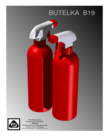 BUTELKA B19 Przedsiębiorstwo Produkcyjno Handlowe „POLIX” 20-469 Lublin ul. Budowlana 26A Tel/Fax: (0-81) 748-93-90 http:// www.polix.lublin.pl, e-mail: polix @ home.pl Typ B19-07 Pojemność 0,70 dm3 Materiał PE-HD Nakrętka Inne Spryskiwacz M28 x 410 Butelka Dr. Marcus Przedsiębiorstwo Produkcyjno Handlowe “POLIX” 20-469 Lublin ul. Budowlana 26A Tel/Fax: (0-81) 748-93-90 http:// www.polix.lublin.pl, e-mail: polix @ home.pl 17.02