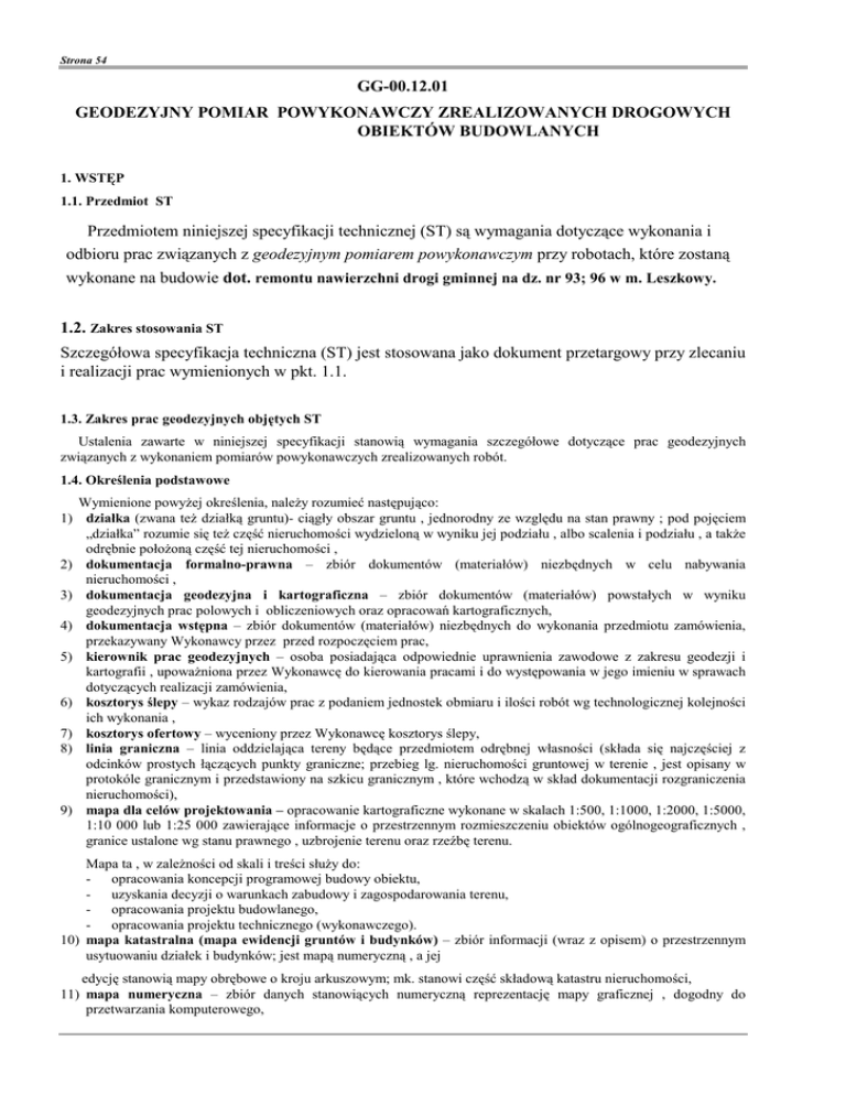 Strona 54 GG-00.12.01 GEODEZYJNY POMIAR POWYKONAWCZY ZREALIZOWANYCH DROGOWYCH OBIEKTÓW BUDOWLANYCH 1. WSTĘP 1.1. Przedmiot ST Przedmiotem niniejszej specyfikacji technicznej (ST) są wymagania dotyczące wykonania i odbioru prac związanych z geodezyjnym pomiarem powykonawczym przy robotach, które zostaną wykonane na budowie dot. remontu nawierzchni drogi gminnej na dz. nr 93; 96 w m. Leszkowy. 1.2. Zakres stosowania ST Szczegółowa specyfikacja techniczna (ST) jest stosowana jako dokument przetargowy przy zlecaniu i realizacji prac wymienionych w pkt. 1.1. 1.3. Zakres prac geodezyjnych objętych ST Ustalenia zawarte w niniejszej specyfikacji stanowią wymagania szczegółowe dotyczące prac geodezyjnych związanych z wykonaniem pomiarów powykonawczych zrealizowanych robót. 1.4. Określenia podstawowe Wymienione powyŜej określenia, naleŜy rozumieć następująco: 1) działka (zwana teŜ działką gruntu)- ciągły obszar gruntu , jednorodny ze względu na stan prawny ; pod pojęciem „działka” rozumie się teŜ część nieruchomości wydzieloną w wyniku jej podziału , albo scalenia i podziału , a takŜe odrębnie połoŜoną część tej nieruchomości , 2) dokumentacja formalno-prawna – zbiór dokumentów (materiałów) niezbędnych w celu nabywania nieruchomości , 3) dokumentacja geodezyjna i kartograficzna – zbiór dokumentów (materiałów) powstałych w wyniku geodezyjnych prac polowych i obliczeniowych oraz opracowań kartograficznych, 4) dokumentacja wstępna – zbiór dokumentów (materiałów) niezbędnych do wykonania przedmiotu zamówienia, przekazywany Wykonawcy przez przed rozpoczęciem prac, 5) kierownik prac geodezyjnych – osoba posiadająca odpowiednie uprawnienia zawodowe z zakresu geodezji i kartografii , upowaŜniona przez Wykonawcę do kierowania pracami i do występowania w jego imieniu w sprawach dotyczących realizacji zamówienia, 6) kosztorys ślepy – wykaz rodzajów prac z podaniem jednostek obmiaru i ilości robót wg technologicznej kolejności ich wykonania , 7) kosztorys ofertowy – wyceniony przez Wykonawcę kosztorys ślepy, 8) linia graniczna – linia oddzielająca tereny będące przedmiotem odrębnej własności (składa się najczęściej z odcinków prostych łączących punkty graniczne; przebieg lg. nieruchomości gruntowej w terenie , jest opisany w protokóle granicznym i przedstawiony na szkicu granicznym , które wchodzą w skład dokumentacji rozgraniczenia nieruchomości), 9) mapa dla celów projektowania – opracowanie kartograficzne wykonane w skalach 1:500, 1:1000, 1:2000, 1:5000, 1:10 000 lub 1:25 000 zawierające informacje o przestrzennym rozmieszczeniu obiektów ogólnogeograficznych , granice ustalone wg stanu prawnego , uzbrojenie terenu oraz rzeźbę terenu. Mapa ta , w zaleŜności od skali i treści słuŜy do: - opracowania koncepcji programowej budowy obiektu, - uzyskania decyzji o warunkach zabudowy i zagospodarowania terenu, - opracowania projektu budowlanego, - opracowania projektu technicznego (wykonawczego). 10) mapa katastralna (mapa ewidencji gruntów i budynków) – zbiór informacji (wraz z opisem) o przestrzennym usytuowaniu działek i budynków; jest mapą numeryczną , a jej edycję stanowią mapy obrębowe o kroju arkuszowym; mk. stanowi część składową katastru nieruchomości, 11) mapa numeryczna – zbiór danych stanowiących numeryczną reprezentację mapy graficznej , dogodny do przetwarzania komputerowego, Strona 55 12) mapa zasadnicza – wielkoskalowe opracowanie kartograficzne, zawierające aktualne informacje o przestrzennym rozmieszczeniu obiektów ogólnogeograficznych oraz elementów ewidencji gruntów i budynków , a takŜe sieci uzbrojenia terenu: nadziemnych , naziemnych i podziemnych, 13) osnowa geodezyjna pozioma – usystematyzowany zbiór punktów , których wzajemne połoŜenie na powierzchni odniesienia zostało określone przy zastosowaniu techniki geodezyjnej, 14) osnowa geodezyjna wysokościowa - usystematyzowany zbiór punktów , których wysokość w stosunku do przyjętej powierzchni odniesienia została określona przy zastosowaniu techniki geodezyjnej, 15) osnowa realizacyjna – osnowa geodezyjna (pozioma i wysokościowa), przeznaczona do geodezyjnego wytyczenia elementów projektów w terenie oraz geodezyjnej obsługi budowy i montaŜu urządzeń i konstrukcji. Osnowa ta powinna słuŜyć do pomiarów kontrolnych przemieszczeń i odkształceń , a takŜe w miarę moŜliwości do pomiarów powykonawczych, 16) ośrodek dokumentacji – centralny , wojewódzkie i powiatowe ośrodki dokumentacji geodezyjnej i kartograficznej , prowadzone przez odpowiednie organy SłuŜby Geodezyjnej i Kartograficznej tj.: a) Głównego Geodetę Kraju - w zakresie zasobu centralnego, b) marszałków województw – w zakresie zasobów wojewódzkich, c) Starostów - w zakresie zasobów powiatowych, 17) prace – wszelkie prace geodezyjne , kartograficzne i formalno-prawne związane z wykonaniem zadań objętych specyfikacjami wymienionymi w pkcie 1.3, 18) punkt graniczny – punkt określający przebieg granicy nieruchomości ; pg. znajdują się na załamaniach linii granicznej, 19) sieć uzbrojenia terenu – wszelkiego rodzaju naziemne , nadziemne i podziemne przewody i urządzenia: wodociągowe, kanalizacyjne , gazowe, cieplne , telekomunikacyjne , elektroenergetyczne i inne , a takŜe podziemne budowle , jak : tunele , przejścia , parkingi , zbiorniki , itp., 20) znak graniczny – znak z trwałego materiału umieszczony w punkcie granicznym , a takŜe trwały element zagospodarowania terenu znajdujący się w tym punkcie. Pozostałe określenia podstawowe zawarte są w przepisach prawa oraz odpowiednich Polskich Normach , a takŜe w instrukcjach i wytycznych technicznych obowiązujących w geodezji i kartografii . 1.5. Ogólne wymagania dotyczące prac geodezyjnych 1.5.1. Wymagania ogólne Pracami geodezyjnymi powinna kierować wyłącznie osoba posiadająca uprawni