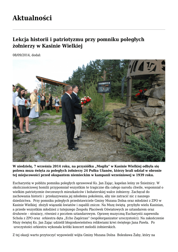 Aktualności Lekcja historii i patriotyzmu przy pomniku poległych żołnierzy w Kasinie Wielkiej 08/09/2014, dodał: W niedzielę, 7 września 2014 roku, na przysiółku „Mogiła” w Kasinie Wielkiej odbyła się polowa msza święta za poległych żołnierzy 24 Pułku Ułanów, którzy brali udział w obronie tej miejscowości przed okupantem niemieckim w kampanii wrześniowej w 1939 roku. Eucharystię w pobliżu pomnika poległych sprawował Ks. Jan Zając, kapelan leśny ze Śnieżnicy. W okolicznościowej homilii przypomniał wszystkim te tragiczne dla całego narodu chwile, wspomniał o wielkim patriotyzmie ówczesnych mieszkańców i bohaterskiej walce żołnierzy. Zachęcał do zachowania historii i przekazywania jej młodemu pokoleniu, aby nie zatracić nic z naszego dziedzictwa. Przy pomniku poległych przedstawiciele Gminy Mszana Dolna oraz młodzież z ZPO w Kasinie Wielkiej złożyli wiązanki kwiatów i zapalili znicze. Na Mszę świętą przybyło wielu Kasinian, a przede wszystkim młodzież z tutejszego Zespołu Placówek Oświatowych ze sztandarem oraz druhowie – strażacy, również z pocztem sztandarowym. Oprawę muzyczną Eucharystii zapewniła Schola z ZPO oraz orkiestra dęta „Echo Zagórzan” (współorganizator uroczystości). Na zakończenie Mszy świętej Ks. Jan Zając udzielił błogosławieństwa relikwiami krwi świętego Jana Pawła. Po uroczystości orkiestra wykonała krótki koncert melodii żołnierskich. Z tej okazji warto przytoczyć wypowiedź wójta Gminy Mszana Dolna Bolesława Żaby, który na początku uroczystości przedstawił krótką historię walk na Ziemi Zagórzańskiej: We wrześniu przypada 75 rocznica wybuchu II wojny światowej, która na terenie naszej wioski i Gminy Mszana Dolna miała bardzo tragiczny wymiar. To tu, od Słowacji, wkroczyli Niemcy na teren naszej Ojczyzny. Spotkali jednak bardzo duży opór, zarówno ze strony naszego wojska - 10 Brygady Kawalerii Pancernej dowodzonej przez płk. Stanisława Maczka, jak również ze strony ludności cywilnej, która nie chciała podporządkować się okupantowi. 10 Brygada Kawalerii Pancerno-Zmotoryzowanej wywodziła się z Rzeszowa; wchodziła w skład Armii “Kraków” jako szybki odwód reagowania. 1 września 1939 roku Brygada walczyła w okolicach Myślenic i Dobczyc, aby nie dopuścić do wyjścia wroga z wąwozów górskich. 2 września 24 Pułk Ułanów i szwadron przeciwpancerny stoczył zacięte walki z 2 niemiecką Dywizją Pancerną. Toczyły się one o wzgórze Wysoka koło Jordanowa. W nocy 2/3 września Brygada wycofała się na północ od doliny Skawy, zamykając przejścia do Krzeczowa, Naprawy i Mszany Dolnej. 3 września toczył się całodniowy bój pod Jordanowem, w rejonie Krzeczowa i Mszany Dolnej. Zmasowany i heroiczny atak z różnych stron pozwolił zlikwidować włamanie uczynione przez Niemców. W tym samym dniu Niemcy wkraczając do wsi Olszówka zamordowali 13 osób i wzięli 12 zakładników. Spalono przy tym 18 zabudowań. Był to odwet za opór stawiany przez wojsko polskie oraz za udzielanie pomocy w walkach przez ludność cywilną. 4 września 10 BKP otrzymała zadanie odwrotu nad Dunajec w kierunku Tarnowa. 24 Pułk Ułanów uderzył na oddziały niemieckiej 4 Dywizji Lekkiej zmuszając je do wycofania się. Odebrano Niemcom dwa pasma wzgórz pod Kasiną Wielką i Mszaną Dolną. Tego dnia w Kasinie Wielkiej zginęło 14 żołnierzy 24 Pułku Ułanów – siedmiu z nich wraz ze swoim dowódcą, porucznikiem Hemplem, spoczywa na naszym parafialnym cmentarzu. 5 września 10 Pułk Strzelców Konnych zaatakował duże siły niemieckie pod Pcimiem, oddziały 3 Dywizji Górskiej i 2 Dywizji Pancernej, lecz wobec dużej przewagi wroga musiał się wycofać. Wiele ważnych wydarzeń zdarzyło się podczas II Wojny Światowej na terenie Ziemi Zagórzańskiej, w tym w obszarze Kasiny Wielkiej. To tu przebiegała linia obrony w 1939 roku, gdzie armia niemiecka od Słowacji atakowała nasz kraj. To w Kasinie i okolicy bohaterskie i zaciekłe walki z najeźdźcą powodowały, że w regionie powstawały oddziały partyzanckie, które włączały się do różnych akcji przeciwko okupantowi. Słynne są oddziały „Adama”, „Luboń” i „Wilk”, które w różny sposób utrudniały życie okupantowi. Wśród miejscowej ludności panowała duża solidarność z partyzantami; udzielano im wszelakiej pomocy. Za taką pomoc sąsiednie miejscowości: Porąbka i Gruszowiec zostały spalone, a śmierć poniosło 36 zakładników. W dniu 14 listopada 1943r. w Kasinie Wielkiej z rąk hitlerowskich zginęło 11 zakładników. Była to zemsta hitlerowców za zastrzelenie w dniu 13 listopada przez partyzantów Michała Stefana Remera folksdojcza. Zakładnicy rozstrzelani zostali w zakolu rzeki Kasina; naprzeciwko dawnego dworu i w pobliżu obecnego Ośrodka Zdrowia. W dniu 23 grudnia 1943 roku gestapo rozstrzelało kolejnych 8 zakładników - młodych gimnazjalistów przywiezionych z więzienia z Nowego Sącza. Wśród nich była rodzina Kacik z Poręby Wielkiej, która zginęłą w odwecie za akcję partyzantów i zastrzelenie w dniu 13 listopada sołtysa wsi Kasina Wielka Jana Kowalczyka. Ciała pomordowanych, zarówno z pierwszej, jak też drugiej egzekucji, znajdują się na cmentarzu parafialnym w Mszanie Dolnej. Dzisiejsza Msza święta - w 75 rocznicę walk o Ziemię Zagórzańską i Kasinę Wielką - przypomina nam te tragiczne dla polskiego narodu i naszych mieszkańców chwile. Kasina Wielka była zresztą świadkiem wielu krwawych wydarzeń podczas powstań, I i II Wojny Światowej, czego dowodem są mogiły i pomniki żołnierzy, partyzantów i ludności cywilnej, którzy oddali życie za naszą wolność. Pamiętajmy o naszych bohaterach. Módlmy się za nich i oddajmy im cześć za przelaną krew w obronie naszych rodzin i naszej wiary. Dzięki nim bowiem wszyscy możemy żyć i pracować dla naszych rodzin, kształcić nasze dzieci, rozwija
