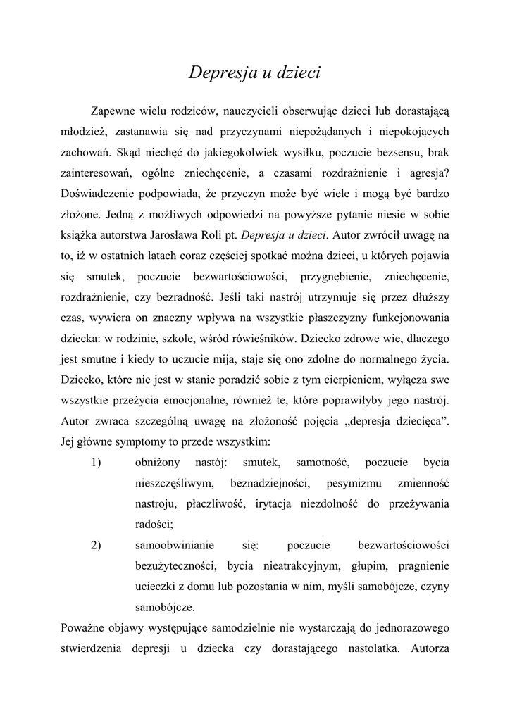 Depresja u dzieci Zapewne wielu rodziców, nauczycieli obserwując dzieci lub dorastającą młodzieŜ, zastanawia się nad przyczynami niepoŜądanych i niepokojących zachowań. Skąd niechęć do jakiegokolwiek wysiłku, poczucie bezsensu, brak zainteresowań, ogólne zniechęcenie, a czasami rozdraŜnienie i agresja? Doświadczenie podpowiada, Ŝe przyczyn moŜe być wiele i mogą być bardzo złoŜone. Jedną z moŜliwych odpowiedzi na powyŜsze pytanie niesie w sobie ksiąŜka autorstwa Jarosława Roli pt. Depresja u dzieci. Autor zwrócił uwagę na to, iŜ w ostatnich latach coraz częściej spotkać moŜna dzieci, u których pojawia się smutek, poczucie bezwartościowości, przygnębienie, zniechęcenie, rozdraŜnienie, czy bezradność. Jeśli taki nastrój utrzymuje się przez dłuŜszy czas, wywiera on znaczny wpływa na wszystkie płaszczyzny funkcjonowania dziecka: w rodzinie, szkole, wśród rówieśników. Dziecko zdrowe wie, dlaczego jest smutne i kiedy to uczucie mija, staje się ono zdolne do normalnego Ŝycia. Dziecko, które nie jest w stanie poradzić sobie z tym cierpieniem, wyłącza swe wszystkie przeŜycia emocjonalne, równieŜ te, które poprawiłyby jego nastrój. Autor zwraca szczególną uwagę na złoŜoność pojęcia „depresja dziecięca”. Jej główne symptomy to przede wszystkim: 1) obniŜony nastój: nieszczęśliwym, smutek, samotność, beznadziejności, poczucie pesymizmu bycia zmienność nastroju, płaczliwość, irytacja niezdolność do przeŜywania radości; 2) samoobwinianie się: poczucie bezwartościowości bezuŜyteczności, bycia nieatrakcyjnym, głupim, pragnienie ucieczki z domu lub pozostania w nim, myśli samobójcze, czyny samobójcze. PowaŜne objawy występujące samodzielnie nie wystarczają do jednorazowego stwierdzenia depresji u dziecka czy dorastającego nastolatka. Autorza Wienbergem (amerykańskim psychiatrą) przytacza cały szereg symptomów wskazujących na depresje: 1) zachowanie agresywne: trudności w radzeniu sobie, kłótliwość, nieuznawanie autorytetów, wrogość napady wściekłości; 2) zmiany w funkcjonowaniu szkolnym: „marzenia na jawie”, trudności w koncentracji, zaburzenia pamięci, utrata zainteresowania przedmiotami szkolnymi, utrata zainteresowania dotychczasową aktywnością pozaszkolną; 3) zaburzenia socjalizacji: brak kolegów, koleŜanek, unikanie z nimi kontaktów, utrata przyjaciół, utrata dotychczasowych zainteresowań; 4) zmiana postawy wobec szkoły: brak radości z aktywności szkolnych, wagary; 5) dolegliwości fizyczne: bóle głowy, bóle brzucha, bóle mięśniowe, inne dolegliwości fizyczne; 6) utrata energii: łatwo i szybko następuje zmęczenie, ytrata zainteresowań; 7) zmiany apetytu i/lub wagi ciała . Liczba objawów, za pomocą których próbuje scharakteryzować obraz klinicznych depresji, znacznie się wydłuŜa. Stąd wielość poglądów, teorii na temat obrazu klinicznego depresji dzieci i młodzieŜy oraz trudności w jej zdiagnozowaniu. Mimo występujących w nich róŜnic w spojrzeniu na depresję, wniosek jeden jest oczywisty: depresja u dzieci i młodzieŜy w zaleŜności od wieku, a czasami i płci człowieka. Bardzo często jest wynikiem powiązanych ze sobą okoliczności i czynników np.: niski poziom samooceny, brak umiejętności społecznych, brak wspierających związków emocjonalnych w rodzinie i poza nią. Największe nasilenie zachowań depresyjnych odnotowano w grupie młodych ludzi, dojrzewających do dorosłego Ŝycia. W ksiąŜce Jarosława Roli moŜna zdobyć duŜo informacji na temat obrazu klinicznego depresji u dzieci w róŜnym wieku, metod jej diagnozowania, objawów towarzyszących i jej przyczyn. DuŜo miejsca autor poświęcił równieŜ na omówienie zjawiska depresji u dzieci dotkniętych niepełnosprawnością intelektualną. KsiąŜka ma charakter poradnika, systematyzuje zgromadzoną dotychczas wiedzę na temat tej choroby. Jej zawartość jest bardzo wartościowa poznawczo. Przeciętnemu czytelnikowi mogą jednak przeszkadzać w jej odbiorze liczne terminy naukowe i specjalistyczne. Jolanta Kopaczewska – pedagog w ZSP w Krośnie Odrzańskim
