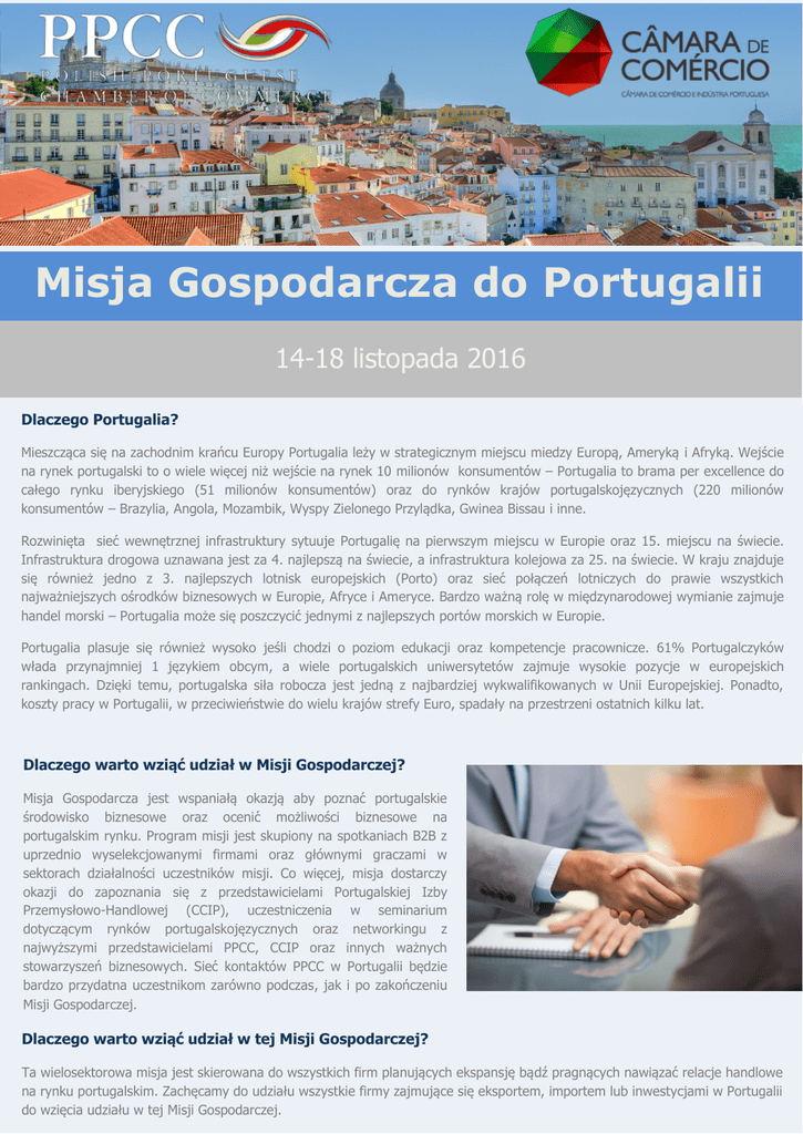 Misja Gospodarcza do Portugalii 14-18 listopada 2016 Dlaczego Portugalia? Mieszcząca się na zachodnim krańcu Europy Portugalia leży w strategicznym miejscu miedzy Europą, Ameryką i Afryką. Wejście na rynek portugalski to o wiele więcej niż wejście na rynek 10 milionów konsumentów – Portugalia to brama per excellence do całego rynku iberyjskiego (51 milionów konsumentów) oraz do rynków krajów portugalskojęzycznych (220 milionów konsumentów – Brazylia, Angola, Mozambik, Wyspy Zielonego Przylądka, Gwinea Bissau i inne. Rozwinięta sieć wewnętrznej infrastruktury sytuuje Portugalię na pierwszym miejscu w Europie oraz 15. miejscu na świecie. Infrastruktura drogowa uznawana jest za 4. najlepszą na świecie, a infrastruktura kolejowa za 25. na świecie. W kraju znajduje się również jedno z 3. najlepszych lotnisk europejskich (Porto) oraz sieć połączeń lotniczych do prawie wszystkich najważniejszych ośrodków biznesowych w Europie, Afryce i Ameryce. Bardzo ważną rolę w międzynarodowej wymianie zajmuje handel morski – Portugalia może się poszczycić jednymi z najlepszych portów morskich w Europie. Portugalia plasuje się również wysoko jeśli chodzi o poziom edukacji oraz kompetencje pracownicze. 61% Portugalczyków włada przynajmniej 1 językiem obcym, a wiele portugalskich uniwersytetów zajmuje wysokie pozycje w europejskich rankingach. Dzięki temu, portugalska siła robocza jest jedną z najbardziej wykwalifikowanych w Unii Europejskiej. Ponadto, koszty pracy w Portugalii, w przeciwieństwie do wielu krajów strefy Euro, spadały na przestrzeni ostatnich kilku lat. Dlaczego warto wziąć udział w Misji Gospodarczej? Misja Gospodarcza jest wspaniałą okazją aby poznać portugalskie środowisko biznesowe oraz ocenić możliwości biznesowe na portugalskim rynku. Program misji jest skupiony na spotkaniach B2B z uprzednio wyselekcjowanymi firmami oraz głównymi graczami w sektorach działalności uczestników misji. Co więcej, misja dostarczy okazji do zapoznania się z przedstawicielami Portugalskiej Izby Przemysłowo-Handlowej (CCIP), uczestniczenia w seminarium dotyczącym rynków portugalskojęzycznych oraz networkingu z najwyższymi przedstawicielami PPCC, CCIP oraz innych ważnych stowarzyszeń biznesowych. Sieć kontaktów PPCC w Portugalii będzie bardzo przydatna uczestnikom zarówno podczas, jak i po zakończeniu Misji Gospodarczej. Dlaczego warto wziąć udział w tej Misji Gospodarczej? Ta wielosektorowa misja jest skierowana do wszystkich firm planujących ekspansję bądź pragnących nawiązać relacje handlowe na rynku portugalskim. Zachęcamy do udziału wszystkie firmy zajmujące się eksportem, importem lub inwestycjami w Portugalii do wzięcia udziału w tej Misji Gospodarczej. Jakie są cele Misji Gospodarczej? Celem Misji Gospodarczej jest zapoznanie uczestników z możliwościami biznesowymi rynku portugalskiego oraz umożliwienie nawiązania kontaktów z ważnymi podmiotami sektora biznesowego: Informacje na temat środowiska biznesowego Portugalii; spotkania B2B z firmami i przedsiębiorcami portugalskimi, zgodnie z profilem każdego z uczestników; nawiązanie kontaktów z ważnymi partnerami lokalnymi; nawiązanie kontaktów z Portugalską Izbą Przemysłowo-Handlową oraz Ambasadą RP w Portugalii; nawiązanie kontaktów z lokalnymi instytucjami rządowymi, mogącymi wesprzeć inwestycje w Portugalii; poznanie największych graczy na rynku, konkurencji oraz profile konsumentów; Ocena możliwości oraz opłacalności nawiązania kontaktów handlowych z rynkiem portugalskim. Co zawiera oferta? Bezpośredni przelot w klasie ekonomicznej WarszawaLizbona-Warszawa; transfer lotnisko-hotel-lotnisko; pobyt w **** hotelu w Lizbonie; ubezpieczenie podróżne; umówienie indywidualnych spotkań B2B z potencjalnymi partnerami biznesowymi i klientami; umówienie spotkań z przedstawicielami instytucji publicznych; udział w seminarium na temat rynku portugalskiego; koktajl networkingowy z przedstawicielami portugalskiego środowiska biznesowego; lokalne wsparcie logistyczne w spotkaniach B2B; spersonalizowane wsparcie podczas Misji Gospodarczej oraz po jej zakończeniu; bezpośrednie wsparcie Sekretarza Generalnego PPCC podczas trwania misji. WSTĘPNY PROGRAM* 14 LISTOPADA 14h50 Wylot z Warszawy 18h10 Przylot do Lizbony i transfer do hotelu 20h00 Kolacja z Radcą Gospodarczym Ambasady RP w Portugalii oraz z zaproszonym gościem z lokalnego środowiska biznesowego 15 LISTOPADA 09h00-17h00 spotkania indywidualne uczestników misji zgodnie z profilem poszczególnych firm 17h00 Seminarium na temat Portugalii i rynków portugalskojęzycznych 19h00 czas wolny 16 LISTOPADA 09h00-18h00 spotkania indywidualne uczestników misji zgodnie z profilem poszczególnych firm 19h30 Kolacja z przedstawicielami PPCC oraz CCIP 17 LISTOPADA 09h00-18h00 spotkania indywidualne uczestników misji zgodnie z profilem poszczególnych firm 18h00 czas wolny 18 LISTOPADA 07h30 Transfer na lotnisko 09h10 Wylot z Lizbony 14h05 Przylot do Warszawy * program może ulec zmianom, wynikającym z próśb uczestników bądź kalendarza spotkań B2B KOSZT UCZESTNICTWA Członkowie PPCC 8,400 PLN + 23% VAT Pozostałe firmy 8,800 PLN + 23% VAT Aby zgłosić firmę do udziału w Misji Gospodarczej do Portugalii, prosimy o wypełnienie formularza dostępnego pod tym linkiem do 30 września 2016 oraz o wysłanie prezentacji firmy po angielsku w formacie PDF lub PPT (max. 5 MB) do Wojciecha Baczyńskiego, Sekretarza Generalnego PPCC: [email protected]. Polsko-Portugalska Izba Gospodarcza rezerwuje sobie prawo do odwołania Misji Gospodarczej, w przypadku niewystarczającej ilości uczestników. Aby dowiedzieć się więcej o Misji Gospodarczej, prosimy o kontakt z : Wojciech Baczyński, Sekretarz Generalny PPCC – [email protected], +48 696 760 925 Małgorzata Goreń, Operations Manager PPCC – [email protected], +48 504 00 95 96
