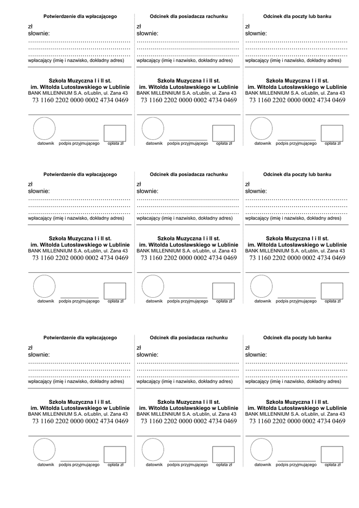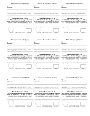 Potwierdzenie dla wpłacającego Odcinek dla posiadacza rachunku Odcinek dla poczty lub banku zł słownie: …………………………………………… …………………………………………… …………………………………………… zł słownie: …………………………………………… …………………………………………… …………………………………………… zł słownie: …………………………………………… …………………………………………… …………………………………………… wpłacający (imię i nazwisko, dokładny adres) wpłacający (imię i nazwisko, dokładny adres) wpłacający (imię i nazwisko, dokładny adres) Szkoła Muzyczna I i II st. im. Witolda Lutosławskiego w Lublinie Szkoła Muzyczna I i II st. im. Witolda Lutosławskiego w Lublinie Szkoła Muzyczna I i II st. im. Witolda Lutosławskiego w Lublinie BANK MILLENNIUM S.A. o/Lublin, ul. Zana 43 BANK MILLENNIUM S.A. o/Lublin, ul. Zana 43 BANK MILLENNIUM S.A. o/Lublin, ul. Zana 43 73 1160 2202 0000 0002 4734 0469 73 1160 2202 0000 0002 4734 0469 73 1160 2202 0000 0002 4734 0469 datownik podpis przyjmującego opłata zł datownik podpis przyjmującego opłata zł datownik podpis przyjmującego opłata zł Potwierdzenie dla wpłacającego Odcinek dla posiadacza rachunku Odcinek dla poczty lub banku zł słownie: …………………………………………… …………………………………………… …………………………………………… zł słownie: …………………………………………… …………………………………………… …………………………………………… zł słownie: …………………………………………… …………………………………………… …………………………………………… wpłacający (imię i nazwisko, dokładny adres) wpłacający (imię i nazwisko, dokładny adres) wpłacający (imię i nazwisko, dokładny adres) Szkoła Muzyczna I i II st. im. Witolda Lutosławskiego w Lublinie Szkoła Muzyczna I i II st. im. Witolda Lutosławskiego w Lublinie Szkoła Muzyczna I i II st. im. Witolda Lutosławskiego w Lublinie BANK MILLENNIUM S.A. o/Lublin, ul. Zana 43 BANK MILLENNIUM S.A. o/Lublin, ul. Zana 43 BANK MILLENNIUM S.A. o/Lublin, ul. Zana 43 73 1160 2202 0000 0002 4734 0469 73 1160 2202 0000 0002 4734 0469 73 1160 2202 0000 0002 4734 0469 datownik podpis przyjmującego opłata zł datownik podpis przyjmującego opłata zł datownik podpis przyjmującego opłata zł Potwierdzenie dla wpłacającego Odcinek dla posiadacza rachunku Odcinek dla poczty lub banku zł słownie: …………………………………………… …………………………………………… …………………………………………… zł słownie: …………………………………………… …………………………………………… …………………………………………… zł słownie: …………………………………………… …………………………………………… …………………………………………… wpłacający (imię i nazwisko, dokładny adres) wpłacający (imię i nazwisko, dokładny adres) wpłacający (imię i nazwisko, dokładny adres) Szkoła Muzyczna I i II st. im. Witolda Lutosławskiego w Lublinie Szkoła Muzyczna I i II st. im. Witolda Lutosławskiego w Lublinie Szkoła Muzyczna I i II st. im. Witolda Lutosławskiego w Lublinie BANK MILLENNIUM S.A. o/Lublin, ul. Zana 43 BANK MILLENNIUM S.A. o/Lublin, ul. Zana 43 BANK MILLENNIUM S.A. o/Lublin, ul. Zana 43 73 1160 2202 0000 0002 4734 0469 73 1160 2202 0000 0002 4734 0469 73 1160 2202 0000 0002 4734 0469 datownik podpis przyjmującego opłata zł datownik podpis przyjmującego opłata zł datownik podpis przyjmującego opłata zł