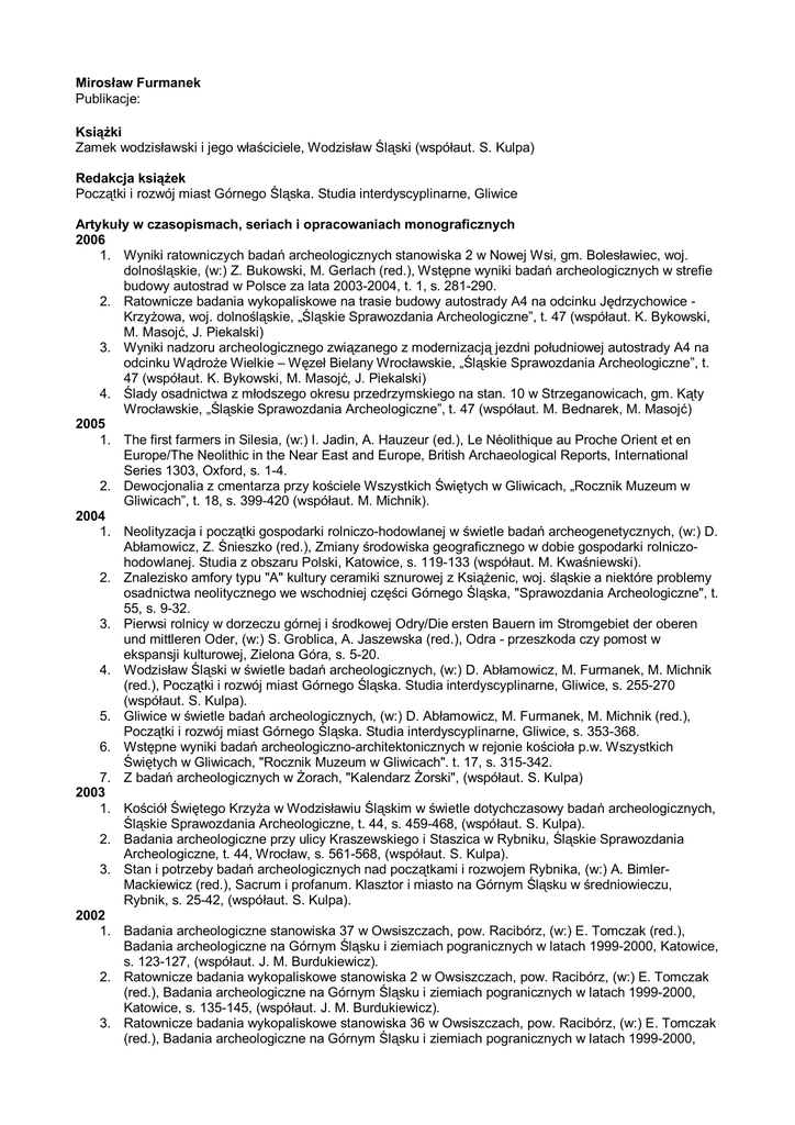 Mirosław Furmanek Publikacje: Książki Zamek wodzisławski i jego właściciele, Wodzisław Śląski (współaut. S. Kulpa) Redakcja książek Początki i rozwój miast Górnego Śląska. Studia interdyscyplinarne, Gliwice Artykuły w czasopismach, seriach i opracowaniach monograficznych 2006 1. Wyniki ratowniczych badań archeologicznych stanowiska 2 w Nowej Wsi, gm. Bolesławiec, woj. dolnośląskie, (w:) Z. Bukowski, M. Gerlach (red.), Wstępne wyniki badań archeologicznych w strefie budowy autostrad w Polsce za lata 2003-2004, t. 1, s. 281-290. 2. Ratownicze badania wykopaliskowe na trasie budowy autostrady A4 na odcinku Jędrzychowice Krzyżowa, woj. dolnośląskie, „Śląskie Sprawozdania Archeologiczne”, t. 47 (współaut. K. Bykowski, M. Masojć, J. Piekalski) 3. Wyniki nadzoru archeologicznego związanego z modernizacją jezdni południowej autostrady A4 na odcinku Wądroże Wielkie – Węzeł Bielany Wrocławskie, „Śląskie Sprawozdania Archeologiczne”, t. 47 (współaut. K. Bykowski, M. Masojć, J. Piekalski) 4. Ślady osadnictwa z młodszego okresu przedrzymskiego na stan. 10 w Strzeganowicach, gm. Kąty Wrocławskie, „Śląskie Sprawozdania Archeologiczne”, t. 47 (współaut. M. Bednarek, M. Masojć) 2005 1. The first farmers in Silesia, (w:) I. Jadin, A. Hauzeur (ed.), Le Néolithique au Proche Orient et en Europe/The Neolithic in the Near East and Europe, British Archaeological Reports, International Series 1303, Oxford, s. 1-4. 2. Dewocjonalia z cmentarza przy kościele Wszystkich Świętych w Gliwicach, „Rocznik Muzeum w Gliwicach”, t. 18, s. 399-420 (współaut. M. Michnik). 2004 1. Neolityzacja i początki gospodarki rolniczo-hodowlanej w świetle badań archeogenetycznych, (w:) D. Abłamowicz, Z. Śnieszko (red.), Zmiany środowiska geograficznego w dobie gospodarki rolniczohodowlanej. Studia z obszaru Polski, Katowice, s. 119-133 (współaut. M. Kwaśniewski). 2. Znalezisko amfory typu "A" kultury ceramiki sznurowej z Książenic, woj. śląskie a niektóre problemy osadnictwa neolitycznego we wschodniej części Górnego Śląska, "Sprawozdania Archeologiczne", t. 55, s. 9-32. 3. Pierwsi rolnicy w dorzeczu górnej i środkowej Odry/Die ersten Bauern im Stromgebiet der oberen und mittleren Oder, (w:) S. Groblica, A. Jaszewska (red.), Odra - przeszkoda czy pomost w ekspansji kulturowej, Zielona Góra, s. 5-20. 4. Wodzisław Śląski w świetle badań archeologicznych, (w:) D. Abłamowicz, M. Furmanek, M. Michnik (red.), Początki i rozwój miast Górnego Śląska. Studia interdyscyplinarne, Gliwice, s. 255-270 (współaut. S. Kulpa). 5. Gliwice w świetle badań archeologicznych, (w:) D. Abłamowicz, M. Furmanek, M. Michnik (red.), Początki i rozwój miast Górnego Śląska. Studia interdyscyplinarne, Gliwice, s. 353-368. 6. Wstępne wyniki badań archeologiczno-architektonicznych w rejonie kościoła p.w. Wszystkich Świętych w Gliwicach, "Rocznik Muzeum w Gliwicach". t. 17, s. 315-342. 7. Z badań archeologicznych w Żorach, "Kalendarz Żorski", (współaut. S. Kulpa) 2003 1. Kościół Świętego Krzyża w Wodzisławiu Śląskim w świetle dotychczasowy badań archeologicznych, Śląskie Sprawozdania Archeologiczne, t. 44, s. 459-468, (współaut. S. Kulpa). 2. Badania archeologiczne przy ulicy Kraszewskiego i Staszica w Rybniku, Śląskie Sprawozdania Archeologiczne, t. 44, Wrocław, s. 561-568, (współaut. S. Kulpa). 3. Stan i potrzeby badań archeologicznych nad początkami i rozwojem Rybnika, (w:) A. BimlerMackiewicz (red.), Sacrum i profanum. Klasztor i miasto na Górnym Śląsku w średniowieczu, Rybnik, s. 25-42, (współaut. S. Kulpa). 2002 1. Badania archeologiczne stanowiska 37 w Owsiszczach, pow. Racibórz, (w:) E. Tomczak (red.), Badania archeologiczne na Górnym Śląsku i ziemiach pogranicznych w latach 1999-2000, Katowice, s. 123-127, (współaut. J. M. Burdukiewicz). 2. Ratownicze badania wykopaliskowe stanowiska 2 w Owsiszczach, pow. Racibórz, (w:) E. Tomczak (red.), Badania archeologiczne na Górnym Śląsku i ziemiach pogranicznych w latach 1999-2000, Katowice, s. 135-145, (współaut. J. M. Burdukiewicz). 3. Ratownicze badania wykopaliskowe stanowiska 36 w Owsiszczach, pow. Racibórz, (w:) E. Tomczak (red.), Badania archeologiczne na Górnym Śląsku i ziemiach pogranicznych w latach 1999-2000, Katowice, s. 107-122, (współaut. J. M. Burdukiewicz). 4. Badania ratownicze w Pławniowicach, pow. Gliwice, (w:) E. Tomczak (red.), Badania archeologiczne na Górnym Śląsku i ziemiach pogranicznych w latach 1999-2000, Katowice, s. 255-261, (współaut. H. Wojciechowska). 5. Badania sondażowe nowoodkrytego dworu na kopcu w Świerklanach Dolnych, st. 1, pow. Rybnik, (w:) E. Tomczak (red.), Badania archeologiczne na Górnym Śląsku i ziemiach pogranicznych w latach 1999-2000, Katowice, s. 413-420, (współaut. S. Kulpa). 6. Badania archeologiczne w Zwonowicach, st. 6, pow. Rybnik, (w:) E. Tomczak (red.), Badania archeologiczne na Górnym Śląsku i ziemiach pogranicznych w latach 1999-2000, Katowice, s. 275281, (współaut. S. Kulpa, M. Ciostek, W. Błasiak). 7. Rozpoznawcze badania stan. 1 w Książenicach, pow. Rybnik, (w:) E. Tomczak (red.), Badania archeologiczne na Górnym Śląsku i ziemiach pogranicznych w latach 1999-2000, Katowice, s. 160163, (współaut. S. Kulpa). 8. Ratownicze badania wykopaliskowe na stanowisku 14 w Kietlicach, pow. Głubczyce, (w:) E. Tomczak (red.), Badania archeologiczne na Górnym Śląsku i ziemiach pogranicznych w latach 1999-2000, Katowice, s. 128-134 (współaut. A. Rapiński). 9. Badania archeologiczno-architektoniczne kościoła p. w. Wszystkich Świętych w Gliwicach, (w:) E. Tomczak (red.), Badania archeologiczne na Górnym Śląsku i ziemiach pogranicznych w latach 1999-2000, Katowice, s. 379-382, (współaut. H. Wojciechowska) 10. Wyniki badań archeologicznych na terenie Rynku w Pszczynie w roku 2000, (w:) E. Tomczak (red.), Badania archeologiczne na Górnym Śląsku i ziemiach pogra