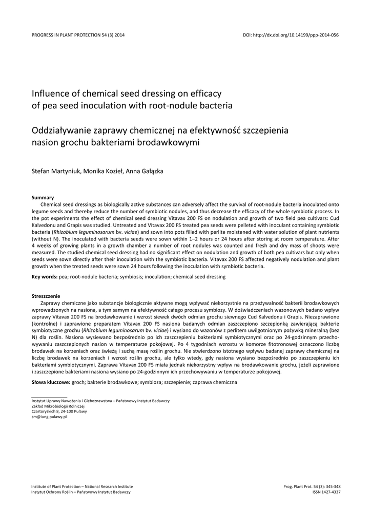 PROGRESS IN PLANT PROTECTION 54 (3) 2014 DOI: http://dx.doi.org/10.14199/ppp-2014-056 Influence of chemical seed dressing on efficacy of pea seed inoculation with root-nodule bacteria Oddziaływanie zaprawy chemicznej na efektywność szczepienia nasion grochu bakteriami brodawkowymi Stefan Martyniuk, Monika Kozieł, Anna Gałązka Summary Chemical seed dressings as biologically active substances can adversely affect the survival of root-nodule bacteria inoculated onto legume seeds and thereby reduce the number of symbiotic nodules, and thus decrease the efficacy of the whole symbiotic process. In the pot experiments the effect of chemical seed dressing Vitavax 200 FS on nodulation and growth of two field pea cultivars: Cud Kalvedonu and Grapis was studied. Untreated and Vitavax 200 FS treated pea seeds were pelleted with inoculant containing symbiotic bacteria (Rhizobium leguminosarum bv. viciae) and sown into pots filled with perlite moistened with water solution of plant nutrients (without N). The inoculated with bacteria seeds were sown within 1–2 hours or 24 hours after storing at room temperature. After 4 weeks of growing plants in a growth chamber a number of root nodules was counted and fresh and dry mass of shoots were measured. The studied chemical seed dressing had no significant effect on nodulation and growth of both pea cultivars but only when seeds were sown directly after their inoculation with the symbiotic bacteria. Vitavax 200 FS affected negatively nodulation and plant growth when the treated seeds were sown 24 hours following the inoculation with symbiotic bacteria. Key words: pea; root-nodule bacteria; symbiosis; inoculation; chemical seed dressing Streszczenie Zaprawy chemiczne jako substancje biologicznie aktywne mogą wpływać niekorzystnie na przeżywalność bakterii brodawkowych wprowadzonych na nasiona, a tym samym na efektywność całego procesu symbiozy. W doświadczeniach wazonowych badano wpływ zaprawy Vitavax 200 FS na brodawkowanie i wzrost siewek dwóch odmian grochu siewnego Cud Kalvedonu i Grapis. Niezaprawione (kontrolne) i zaprawione preparatem Vitavax 200 FS nasiona badanych odmian zaszczepiono szczepionką zawierającą bakterie symbiotyczne grochu (Rhizobium leguminosarum bv. viciae) i wysiano do wazonów z perlitem uwilgotnionym pożywką mineralną (bez N) dla roślin. Nasiona wysiewano bezpośrednio po ich zaszczepieniu bakteriami symbiotycznymi oraz po 24-godzinnym przechowywaniu zaszczepionych nasion w temperaturze pokojowej. Po 4 tygodniach wzrostu w komorze fitotronowej oznaczono liczbę brodawek na korzeniach oraz świeżą i suchą masę roślin grochu. Nie stwierdzono istotnego wpływu badanej zaprawy chemicznej na liczbę brodawek na korzeniach i wzrost roślin grochu, ale tylko wtedy, gdy nasiona wysiano bezpośrednio po zaszczepieniu ich bakteriami symbiotycznymi. Zaprawa Vitavax 200 FS miała jednak niekorzystny wpływ na brodawkowanie grochu, jeżeli zaprawione i zaszczepione bakteriami nasiona wysiano po 24-godzinnym ich przechowywaniu w temperaturze pokojowej. Słowa kluczowe: groch; bakterie brodawkowe; symbioza; szczepienie; zaprawa chemiczna Instytut Uprawy Nawożenia i Gleboznawstwa – Państwowy Instytut Badawczy Zakład Mikrobiologii Rolniczej Czartoryskich 8, 24-100 Puławy [email protected] Institute of Plant Protection – National Research Institute Instytut Ochrony Roślin – Państwowy Instytut Badawczy Prog. Plant Prot. 54 (3): 345-348 ISSN 1427-4337 346 Chemical seed dressing and inoculation of pea seeds / Chemiczne zaprawianie i szczepienie nasion grochu Wstęp / Introduction Przedsiewne zaprawianie nasion preparatami chemicznymi jest jednym z podstawowych zabiegów w nowoczesnej agrotechnice wielu roślin, w tym także strączkowych (Księżak i wsp. 1995; Podleśny i Brzózka 2001; Kutcher i wsp. 2002; Graham i Vance 2003). Zaprawy nasienne (fungicydy i insektycydy) ograniczają bowiem rozwój patogenów i szkodników nie tylko w czasie kiełkowania nasion, ale także w początkowych fazach rozwoju młodych siewek roślin. W przypadku uprawy roślin strączkowych (i innych motylkowatych) ważne jest również stosowanie szczepionek zawierających bakterie symbiotyczne (Rhizobium, Bradyrhizobium, Sinorhizobium) tych roślin. Wymienione bakterie przyczyniają się do powstawania na korzeniach roślin motylkowatych brodawek symbiotycznych, w których następuje redukcja (wiązania) azotu atmosferycznego do formy amonowej, przyswajalnej dla roślin (Graham i Vance 2003; Martyniuk 2012). Stosowanie szczepionek rizobiowych na ogół powoduje istotne zwyżki plonów roślin motylkowatych, zwłaszcza wtedy, gdy w glebie brak jest bakterii symbiotycznych, lub gdy liczebność tych bakterii w środowisku glebowym jest niska, np. na skutek wieloletniej przerwy w uprawie omawianych roślin lub nadmiernego zakwaszenia gleby (Rennie i Dubetz 1984; Kutcher i wsp. 2002). Preparaty szczepionkowe zawierające bakterie symbiotyczne stosowane są najczęściej na nasiona roślin motylkowatych, które powinny być także zaprawiane preparatami chemicznymi. Jednak niektóre substancje czynne zapraw nasiennych, np. mankozeb, niekorzystnie wpływają na przeżywalność bakterii brodawkowych wprowadzonych na nasiona, a tym samym zmniejszają liczbę zawiązywanych brodawek na korzeniach i efektywność całego procesu symbiozy tych bakterii z roślinami motylkowatymi (Martyniuk i wsp. 2000, 2002). Celem badań było poznanie wpływu zaprawy nasiennej Vitavax 200 FS na efektywność szczepienia nasion grochu (Pisum sativum L) bakteriami symbiotycznymi (Rhizobium leguminosarum biovar viciae) w doświadczeniach wazonowych. Materiały i metody / Materials and methods Materiały W przeprowadzonych doświadczeniach użyto nasion dwóch odmian grochu Cud Kalvedonu oraz Grapis, w stopniu odsiewu – oryginał. Do zaszczepiania nasion użyto przygotowanego w Zakładzie Mikrobiologii Instytutu Uprawy Nawożenia i Gleboznawstwa – Państw