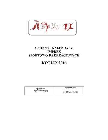 GMINNY KALENDARZ IMPREZ SPORTOWO-REKREACYJNYCH KOTLIN 2016 Opracował: mgr Marek Łapaj Zatwierdzam Wójt Gminy Kotlin ZIMA Nazwa zawodów, imprezy Miejsce Data Gminny turniej szachowy Kotlin 24.01.2016 Gminny turniej piłki siatkowej Kotlin 14.02.2016 Gminny turniej koszykówki „Streetball” Kotlin 21.02.2016 Sławoszew 20.03.2016 Kotlin Styczeń, luty, marzec 2016 Gminny turniej tenisa stołowego Opieka nad salą sport. (styczeń, luty, marzec po 40 godz wg potrzeb w soboty) WIOSNA Nazwa zawodów, imprezy Turniej piłki nożnej „Orlik” dla chłopców w wieku szkoły podstawowej Turniej piłki nożnej „Orlik Oldboy” z okazji Zawody rowerowe dla dzieci, młodzieży Turniej wsi o puchar Wójta Gminy Kotlin Miejsce Data Kotlin 17.04.2016 Kotlin 3.05.2016 Sławoszew 11.06.2016 Magnuszewice 18.06.2016 LATO Nazwa zawodów, imprezy Turniej piłki nożnej o puchar Wójta Gminy Kotlin Wakacyjna liga piłki nożnej „Orlik 2015” Plażowa Piłka Siatkowa Miejsce Data Kotlin 10 i 17.07.2016 Kotlin lipiec/sierpień 2016 Parzew 7.08.2016 JESIEŃ Nazwa zawodów, imprezy Gminny Turniej koszykówki „Orlik Streetball” Gminny turniej piłki nożnej „Orlik” dla szkół podstawowych Gminny turniej piłki nożnej „Orlik” dla chłopców z gimnazjum Turniej Niepodległości w halowej piłce nożnej o puchar Wójta Gminy Kotlin Gwiazdkowy turniej halowej piłki nożnej w kategorii orlik - open Gwiazdkowy turniej halowej piłki nożnej dla szkół gimnazjalnych Opieka nad salą sport. (styczeń, luty, marzec po 40 godz wg potrzeb w soboty) Miejsce Data Kotlin 11.09.2016 Kotlin 17.09.2016 Kotlin 16.10.2016 Kotlin 06 i 11.11.2016 Kotlin 3.12.2016 Kotlin 10.12.2016 Kotlin Listopad, grudzień 2016