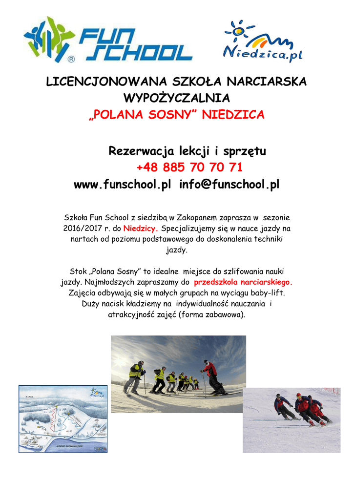 LICENCJONOWANA SZKOŁA NARCIARSKA WYPOŻYCZALNIA „POLANA SOSNY” NIEDZICA Rezerwacja lekcji i sprzętu +48 885 70 70 71 www.funschool.pl [email protected] Szkoła Fun School z siedzibą w Zakopanem zaprasza w sezonie 2016/2017 r. do Niedzicy. Specjalizujemy się w nauce jazdy na nartach od poziomu podstawowego do doskonalenia techniki jazdy. Stok „Polana Sosny” to idealne miejsce do szlifowania nauki jazdy. Najmłodszych zapraszamy do przedszkola narciarskiego. Zajęcia odbywają się w małych grupach na wyciągu baby-lift. Duży nacisk kładziemy na indywidualność nauczania i atrakcyjność zajęć (forma zabawowa). Cennik na sezon 2016/2017 r. LEKCJE INDYWIDUALNE (NARTY, SNOWBOARD) 70 zł 1 osoba 2 osoby 55 zł/os 3-4 osoby 45 zł/os 5-10 osób 35 zł/os Oszczędzaj w pakietach ! 1 osoba pakiet Cena Cena za 1 h w pakiecie 5h 325,00 zł 65,00 zł 7h 434,00 zł 62,00 zł 10 h 600,00 zł 60,00 zł Zajęcia pakietowe płatne z góry, do wykorzystania w sezonie 2016/2017r. po wcześniejszej rezerwacji telefonicznej +48 885 70 70 71. CENNIK WYPOŻYCZALNIA Rodzaj usługi 2 h Następna godzina Doba Komplet nart 25,00 zł 5,00 zł 45,00 zł Narty 15,00 zł 4,00 zł 30,00 zł Buty 13,00 zł 3,00 zł 25,00 zł Kijki 7,00 zł 3,00 zł 15,00 zł Snowboard komplet 25,00 zł 5,00 zł 50,00 zł Snowboard 20,00 zł 4,00 zł 35,00 zł Kask 6,00 zł 3,00 zł 15,00 zł UWAGA: grupy wycena indywidualna KURS SYLWESTROWY 28 – 31 grudzień 2016 r. 4 dniowy kurs (8 h lekcyjnych) – 310 zł Grupa poranna: 10:00- 12:00 Grupa popołudniowa: 14:00 -16:00 5 % zniżki – zapisy – 2 dzieci 10 % zniżki – 3 lub więcej KURSY FERYJNE DLA DZIECI Najlepsza propozycja by dzieci poprzez zabawę uczyły się jazdy na nartach wraz z rówieśnikami. Na terenie przedszkola znajdują się figurki i zabawki które umilają część zajęć. Na koniec kursu każde dziecko staruje w zawodach, kibicowanie rodziców obowiązkowe! Dla wszystkich uczestników dyplomy. Zapisz swoją pociechę już dziś ! Zapraszamy w poniższych terminach Zajęcia rozpoczynają się w poniedziałek, kończą w piątek. TERMIN I: 16 styczeń (poniedziałek) - 20 styczeń (piątek) 2017 r. TERMIN II: 23 styczeń (poniedziałek) - 27 styczeń (piątek) 2017 r. TERMIN III: 30 styczeń (poniedziałek) - 3 luty (piątek) 2017 r. TERMIN IV: 6 luty (poniedziałek) - 10 luty (piątek) 2017 r. TERMIN V: 13 luty (poniedziałek) - 17 luty (piątek) 2017 r. TERMIN VI: 20 luty (poniedziałek) - 24 luty (piątek) 2017 r. 5 % zniżki – zapisy – 2 dzieci 10 % zniżki – 3 lub więcej Kurs 5 dniowy obejmuje (10 h lekcyjnych) 390 w max. 5 osobowych grupach. zł ZAPISY: Prosimy o podanie i wysłanie maila na adres 1. 2. 3. 4. [email protected]: imienia i nazwiska dziecka tel. kontaktowego poziomu zaawansowania terminu kursu + nazwy stoku: NIEDZICA Do zakwalifikowania niezbędna jest wpłata za kurs w wysokości 150zł na poniższe konto: ING o Zakopane: 73 1050 1474 1000 0090 9254 5491 „FERIE Z RENIFEREM” ZAPRASZAMY DO UDZIAŁU W 5-DNIOWYCH KURSACH DLA DZIECI. DLA WSZYSTKICH UCZESTNIKÓW, MASKOTKA NASZEGO SZKÓŁKOWEGO RENIFERA I DYPLOM NA KONIEC KURSU ;)