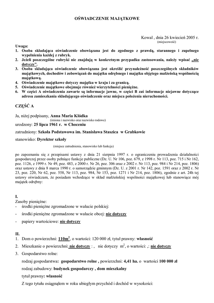 OŚWIADCZENIE MAJĄTKOWE Kowal , dnia 26 kwiecień 2005 r. (miejscowość) Uwaga: 1. Osoba składająca oświadczenie obowiązana jest do zgodnego z prawdą, starannego i zupełnego wypełnienia każdej z rubryk. 2. Jeżeli poszczególne rubryki nie znajdują w konkretnym przypadku zastosowania, należy wpisać „nie dotyczy”. 3. Osoba składająca oświadczenie obowiązana jest określić przynależność poszczególnych składników majątkowych, dochodów i zobowiązań do majątku odrębnego i majątku objętego małżeńską wspólnością majątkową. 4. Oświadczenie majątkowe dotyczy majątku w kraju i za granicą. 5. Oświadczenie majątkowe obejmuje również wierzytelności pieniężne. 6. W części A oświadczenia zawarte są informacje jawne, w części B zaś informacje niejawne dotyczące adresu zamieszkania składającego oświadczenie oraz miejsca położenia nieruchomości. CZĘŚĆ A Ja, niżej podpisany, Anna Maria Kłódka (imiona i nazwisko oraz nazwisko rodowe) urodzony: 25 lipca 1961 r. w Choceniu zatrudniony: Szkoła Podstawowa im. Stanisława Staszica w Grabkowie stanowisko: Dyrektor szkoły (miejsce zatrudnienia, stanowisko lub funkcja) po zapoznaniu się z przepisami ustawy z dnia 21 sierpnia 1997 r. o ograniczeniu prowadzenia działalności gospodarczej przez osoby pełniące funkcje publiczne (Dz. U. Nr 106, poz. 679, z 1998 r. Nr 113, poz. 715 i Nr 162, poz. 1126, z 1999 r. Nr 49, poz. 483, z 2000 r. Nr 26, poz. 306 oraz z 2002 r. Nr 113, poz. 984 i Nr 214, poz. 1806) oraz ustawy z dnia 8 marca 1990 r. o samorządzie gminnym (Dz. U. z 2001 r. Nr 142, poz. 1591 oraz z 2002 r. Nr 23, poz. 220, Nr 62, poz. 558, Nr 113, poz. 984, Nr 153, poz. 1271 i Nr 214, poz. 1806), zgodnie z art. 24h tej ustawy oświadczam, że posiadam wchodzące w skład małżeńskiej wspólności majątkowej lub stanowiące mój majątek odrębny: I. Zasoby pieniężne: - środki pieniężne zgromadzone w walucie polskiej: - środki pieniężne zgromadzone w walucie obcej: nie dotyczy - papiery wartościowe: nie dotyczy II. 1. Dom o powierzchni: 110m2, o wartości: 120 000 zł, tytuł prawny: własność 2. Mieszkanie o powierzchni: nie dotyczy : , nie dotyczy m2, o wartości: ,: nie dotyczy 3. Gospodarstwo rolne: rodzaj gospodarstwa: gospodarstwo rolne , powierzchni: 4,41 ha. o wartości 100 000 zł rodzaj zabudowy: budynek gospodarczy , dom mieszkalny tytuł prawny: własność Z tego tytułu osiągnąłem w roku ubiegłym przychód i dochód w wysokości: 100.000 zł, dochód – 50 000 zł 4. Inne nieruchomości: nie dotyczy powierzchnia: o wartości: tytuł prawny: III. Posiadam udziały w spółkach handlowych – należy podać liczbę i emitenta udziałów: nie dotyczy .......................................................................................................................................................................... udziały te stanowią pakiet większy niż 10% udziałów w spółce: ................................................................... .......................................................................................................................................................................... Z tego tytułu osiągnąłem(ęłam) w roku ubiegłym dochód w wysokości: ...................................................... .......................................................................................................................................................................... IV. Posiadam akcje w spółkach handlowych – należy podać liczbę i emitenta akcji: nie dotyczy akcje te stanowią pakiet większy niż 10% akcji w spółce: nie stanowią .......................................................................................................................................................................... Z tego tytułu osiągnąłem(ęłam) w roku ubiegłym dochód w wysokości: ........................................ V. Nabyłem(am) (nabył mój małżonek, z wyłączeniem mienia przynależnego do jego majątku odrębnego) od Skarbu Państwa, innej państwowej osoby prawnej, jednostek samorządu terytorialnego, ich związków lub od komunalnej osoby prawnej następujące mienie, które podlegało zbyciu w drodze przetargu – należy podać opis mienia i datę nabycia, od kogo: nie dotyczy VI. 1. Prowadzę działalność gospodarczą2 (należy podać formę prawną i przedmiot działalności): nie dotyczy - osobiście : - wspólnie z innymi osobami ................................................................................................................. Z tego tytułu osiągnąłem(ęłam) w roku ubiegłym przychód i dochód w wysokości: ............................. ................................................................................................................................................................... 2. Zarządzam działalnością gospodarczą lub jestem przedstawicielem, pełnomocnikiem takiej działalności (należy podać formę prawną i przedmiot działalności): nie dotyczy - osobiście ............................................................................................................................................. ................................................................................................................................................................... - wspólnie z innymi osobami ................................................................................................................. .................................................................................................................................................................. Z tego tytułu osiągnąłem(ęłam) w roku ubiegłym dochód w wysokości: ................................................ .......................................................................................................................................................