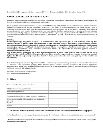 Dom Maklerski Fio o.c.p., a.s., Kollárovo námestie 15, 811 06 Bratislava (dalej jako „Fio“ albo „Dom Maklerski“) KWESTIONARIUSZ INWESTYCYJNY Partnerem handlowym Domu Maklerskiego jest: osoba fizyczna lub osoba prawna, która nie jest inwestorem profesjonalnym (nie jest tzw. profesjonalnym klientem, ani posiadającym licencję). Klient wypełnia niniejszy kwestionariusz na prośbę Domu Maklerskiego DOBROWOLNIE. Kwestionariusz ma umożliwić Domowi Maklerskiemu identyfikację potrzeb, umiejętności oraz doświadczeń klienta w zakresie obrotu papierami wartościowymi i może na podstawie uzyskanych informacji może klientowi zaproponować swoje doradztwo lub w jego imieniu zarządzać. Dom Maklerski poprzez doradztwo może zwiększyć skuteczność inwestowania klienta, aby klient uniknął ryzyka związanego z obrotem papierami wartościowymi albo by zwiększył ten obrót, w sposób indywidualnie dopasowany do potrzeb klienta. Dom Maklerski ma obowiązek przedłożenia klientowi kwestionariusza inwestycyjnego na podstawie § 73g ustęp 1 litera b) Ustawy o papierach wartościowych nr 566/2001 UWAGA: Klient odpowiadając na pytania w części 1 i 2 kwestionariusza musi się liczyć z tym, że Dom Maklerski, oceni czy dane finansowe klienta są wystarczające, aby podejmował ryzyko finansowe zgodne z identycznym działaniem lub wysokością kredytu udzielanego klientowi. Odpowiedz na dalsze pytania zawarte w kwestionariuszu umożliwia Domowi Maklerskiemu dokładniejszy sposób weryfikacji wiedzy/doświadczenia klienta i szczegółowe określenie możliwości czy ich brak, inwestycyjnego doradztwa. Dom Maklerski zobowiązuje klienta do odpowiedzi na wszystkie pytania zawarte w kwestionariuszu inwestycyjnym. Jeśli Klient odmówi odpowiedzi na pytania kwestionariusza lub na część z nich odpowie nieprawdziwie naraża się na niebezpieczeństwo, że Dom Maklerski nieprawidłowo oceni jego potrzeby i zaproponuje mu strategię inwestycyjną, która nie będzie dla Klienta najbardziej optymalna.. Klient w takim przypadku nie może domagać się zwrotu środków ani rekompensaty. Dom Maklerski uprasza klientów, aby informowali FIO o każdorazowej zmianie informacji podanych w niniejszym kwestionariuszu - z powodów, które wymieniono powyżej. Dom Maklerski prosi Klientów o coroczną aktualizację lub ponowne wypełnienie kwestionariusza. Klient może wypełnić kwestionariusz również w formie elektronicznej, jeśli jego tożsamość zostanie potwierdzona i jeśli dom maklerski daje taką możliwość. Pracownik, który dostarcza kwestionariusz: ………………………………………………… Data wypełnienia kwestionariusza:………………………………………………………… 1. Klient Imię i nazwisko, firma, nazwa handlowa: PESEL (data urodzenia), REGON: Rezydentura podatkowa: Numer dowodu osobistego klienta lub osoby kontaktowej: Osoba kontaktowa lub pełnomocnik w przypadku osoby prawnej: Telefon: e-mail: 2. Wiedza i doświadczenie klienta w zakresie obrotu instrumentami inwestycyjnymi Nie chcę informować domu maklerskiego na temat mojego doświadczenia w zakresie inwestycji i instrumentów inwestycyjnych* * Nieudzielenie odpowiedzi nie pozwoli Domowi Maklerskiemu na prawidłowe oszacowanie wiedzy i doświadczenia klienta i ocenę ryzyka związanego z inwestowaniem. Dom Maklerski Fio o.c.p., a.s., Kollárovo námestie 15, 811 06 Bratislava (dalej jako „Fio“ albo „Dom Maklerski“) O stopniu znajomości tematyki i moim doświadczeniu w zakresie inwestowania świadczą następujące odpowiedzi. 2.1 Wiedza i doświadczenie w inwestowaniu w latach: Poziom wiedzy związanej z obrotem akcjami, obligacjami, funduszami inwestycyjnymi i podobnymi instrumentami: Ilość lat Ogólna znajomość rynków instrumentów pochodnych (derywatów): Ilość lat Doświadczenie w obrocie na Giełdzie Papierów Wartościowych w Warszawie: Ilość lat Doświadczenie w zakresie obrotu instrumentami inwestycyjnymi na rynkach środkowoeuropejskich: Ilość lat Doświadczenie w obrocie na giełdach amerykańskich: AMEX, NASDAQ, NYSE: Ilość lat Doświadczenie w obrocie na giełdzie frankfurckiej Deutsche Börse - XETRA: Ilość lat Brak Średnia Dobra Bardzo dobra Brak Średnia Dobra Bardzo dobra Brak Średnia Dobra Bardzo dobra Brak Średnia Dobra Bardzo dobra Brak Średnia Dobra Bardzo dobra Brak Średnia Dobra Bardzo dobra 2.2 Znajomość kluczowych pojęć inwestycyjnych Mechanizm i ryzyko obrotu papierami wartościowymi z wykorzystaniem margins: Rozumiem w wystarczającym stopniu Pojęcia zostały mi wyjaśnione przez Dom Maklerski Nie rozumiem, ale nie będę wykorzystywał tych narzędzi Zasada efektu dźwigni finansowej (leverage): Rozumiem w wystarczającym stopniu Pojęcia zostały mi wyjaśnione przez Dom Maklerski Nie rozumiem, ale nie będę wykorzystywał tych narzędzi Mechanizm zawierania kontraktu futures: Rozumiem w wystarczającym stopniu Pojęcia zostały mi wyjaśnione przez Dom Maklerski Nie rozumiem, ale nie będę wykorzystywał tych narzędzi Zasada krótkiej sprzedaży (short sales): Rozumiem w wystarczającym stopniu Pojęcia zostały mi wyjaśnione przez Dom Maklerski Nie rozumiem, ale nie będę wykorzystywał tych narzędzi Dom Maklerski Fio o.c.p., a.s., Kollárovo námestie 15, 811 06 Bratislava (dalej jako „Fio“ albo „Dom Maklerski“) Zasada marking to market (codzienne rozrachunki zysków i strat): Rozumiem w wystarczającym stopniu Pojęcia zostały mi wyjaśnione przez Dom Maklerski Nie rozumiem, ale nie będę wykorzystywał tych narzędzi Zasady działania obowiązkowego Funduszu gwarancyjnego: Rozumiem zasady wypłaty, nie byłbym uprawniony do wypłaty Rozumiem zasady wypłat rekompensat i myślę, że byłbym uprawniony do wypłaty wartości instrumentów inwestycyjnych oraz środków pieniężnych przekazanych domowi maklerskiemu (na podstawie §82 Ustawy o papierach wartościowych), maksymalnie jednak do wysokości od