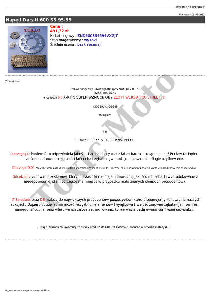 Informacje o produkcie Utworzono 03-03-2017 Napęd Ducati 600 SS 95-99 Cena : 491,32 zł Nr katalogowy : ZND600SS9599VXGJT Stan magazynowy : wysoki Średnia ocena : brak recenzji ot o Zmienione! Zestaw napędowy - dwie zębatki (przednia) JTF736.15 i (tylna) JTR735.41 + Łańcuch DID X-RING SUPER WZMOCNIONY ZŁOTY WERSJA PRO STREET !!! DID520VX2-G&B98 M 98 ogniw do: c 1. Ducati 600 SS >01853 1995-1999 r. Dlaczego JT? Ponieważ to odpowiednia jakość - bardzo dobry materiał za bardzo rozsądną cenę! Ponieważ dopiero xi złożenie odpowiedniej jakości łańcucha i zębatek gwarantuje odpowiednio długie użytkowanie. Dlaczego DID? Ponieważ skoro najlepsi mu zaufali z Valentino Rossim na czele, to uważamy, że i Ty powinieneś czuć się wystarczająco bezpiecznie na motocyklu. Odradzamy kupowanie zestawów, których składniki nie mają jednorodnej jakości: np. zębatki wyprodukowane z To nieodpowiedniej stali (co często ma miejsce w przypadku mało znanych chińskich producentów). JT Sprockets oraz DID należą do największych producentów podzespołów, które proponujemy Państwu na naszych aukcjach. Dopiero odpowiednia jakość wszystkich elementów (wyjątkowa trwałość zarówno zębatek jak również i samego łańcucha) oraz właściwe ich założenie, jak również konserwacja będą gwarancją Twojej satysfakcji. Uwaga! Warunkiem gwarancji ze strony producenta DID jest założenie łańcucha w serwisie motocykli!!! Wygenerowano w programie www.oscGold.com