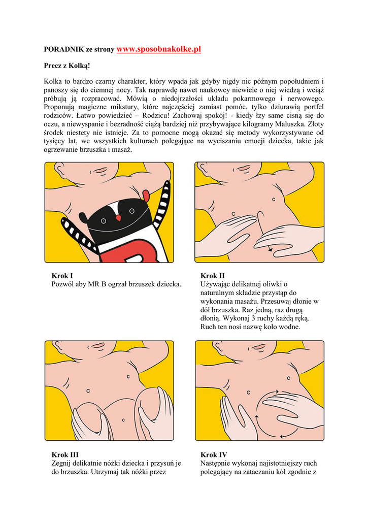 PORADNIK ze strony www.sposobnakolke.pl Precz z Kolką! Kolka to bardzo czarny charakter, który wpada jak gdyby nigdy nic późnym popołudniem i panoszy się do ciemnej nocy. Tak naprawdę nawet naukowcy niewiele o niej wiedzą i wciąż próbują ją rozpracować. Mówią o niedojrzałości układu pokarmowego i nerwowego. Proponują magiczne mikstury, które najczęściej zamiast pomóc, tylko dziurawią portfel rodziców. Łatwo powiedzieć – Rodzicu! Zachowaj spokój! - kiedy łzy same cisną się do oczu, a niewyspanie i bezradność ciążą bardziej niż przybywające kilogramy Maluszka. Złoty środek niestety nie istnieje. Za to pomocne mogą okazać się metody wykorzystywane od tysięcy lat, we wszystkich kulturach polegające na wyciszaniu emocji dziecka, takie jak ogrzewanie brzuszka i masaż. Krok I Pozwól aby MR B ogrzał brzuszek dziecka. Krok II Używając delikatnej oliwki o naturalnym składzie przystąp do wykonania masażu. Przesuwaj dłonie w dół brzuszka. Raz jedną, raz drugą dłonią. Wykonaj 3 ruchy każdą ręką. Ruch ten nosi nazwę koło wodne. Krok III Zegnij delikatnie nóżki dziecka i przysuń je do brzuszka. Utrzymaj tak nóżki przez Krok IV Następnie wykonaj najistotniejszy ruch polegający na zataczaniu kół zgodnie z około 6 sekund po czym delikatnie je rozluźnij chwytając za łydki lub stopy i potrząsając. Dokładnie ta jak strzepuje się pyłek z kocyka czy przesiewa mąkę. Nie szarp dziecka i nie wyrywaj nóżek, ruch nie może być gwałtowny. Uwaga: jeśli Maluch nie chce przykurczyć nóżek, możesz położyć na jego brzuszku własne dłonie i lekko ucisnąć. ruchem wskazówek zegara. Jedną dłonią wykonaj półokrąg jakby kreśląc na tarczy zegara godziny od 12 do 6, po czym uzupełnij okrąg drugą dłonią. Nie odrywaj rąk od brzuszka, Twój dotyk działa rozgrzewajaco i kojąco. Wykonaj 6 kółek. Ruchem kolistym możesz masować brzuszek dziecka również podczas zabawy czy noszenia na rękach. Pamiętaj: zawsze masuj okrężnymi ruchami zgodnie z ruchem wskazówek zegara. To niezwykle istotne dla pracy jelit. Krok V Powtórz sekwencje z przytulaniem zgiętych nóżek dziecka do brzuszka.dłonie i lekko ucisnąć. Powtórz kroki masażu 3 razy Podnieś, przytul i pocałuj niemowlę nucąc mu do ucha głośne „Szzssssssssssss”. Jeśli dziecko głośno płacze możesz spróbować uspokoić je równie głośnym gwizdaniem. Odwrócenie uwagi pomoże mu zapomnieć o bólu i skupić się na czymś innym. Masaż idealnie wpływa na tworzenie więzi z dzieckiem. Uwagi: Nie masuj Malucha bezpośrednio po jedzeniu. Działaj profilaktycznie – masuj Maluszka kilka razy w ciągu dnia, nie w momencie ataku kolki. W miejscu wykonywania masażu powinno być ciepło. Dbaj o jakość oliwki do masażu – wybieraj naturalne produkty bez dodatku parabenów. PEG czy sztucznych zapachów. Zachowaj cierpliwość, efekty powinny pojawić się już po kilku dniach. Więcej informacji na www.sposobnakolke.pl