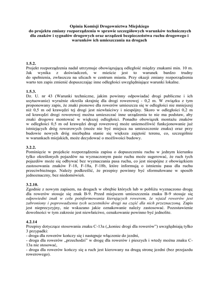 Opinia Komisji Drogownictwa Miejskiego do projektu zmiany rozporządzenia w sprawie szczegółowych warunków technicznych dla znaków i sygnałów drogowych oraz urządzeń bezpieczeństwa ruchu drogowego i warunków ich umieszczania na drogach 1.5.2. Projekt rozporządzenia nadal utrzymuje obowiązującą odległość między znakami min. 10 m. Jak wynika z doświadczeń, w mieście jest to warunek bardzo trudny do spełnienia, zwłaszcza na ulicach w centrum miasta. Przy okazji zmiany rozporządzenia warto ten zapis zmienić dopuszczając inne odległości uwzględniające warunki lokalne. 1.5.3. Dz. U. nr 43 (Warunki techniczne, jakim powinny odpowiadać drogi publiczne i ich usytuowanie) wyraźnie określa skrajnię dla drogi rowerowej - 0,2 m. W związku z tym proponowany zapis, że znaki pionowe dla rowerów umieszcza się w odległości nie mniejszej niż 0,5 m od krawędzi tej drogi jest niewłaściwy i niespójny. Skoro w odległości 0,2 m od krawędzi drogi rowerowej można umieszczać inne urządzenia to nie ma podstaw, aby znaki drogowe montować w większej odległości. Ponadto obowiązek montażu znaków w odległości 0,5 m od krawędzi drogi rowerowej może uniemożliwić funkcjonowanie już istniejących dróg rowerowych (może nie być miejsca na umieszczenie znaku) oraz przy budowie nowych dróg niezbędna stanie się większa zajętość terenu, co, szczególnie w warunkach miejskich, może decydować o możliwości budowy. 3.2.2. Pominięcie w projekcie rozporządzenia zapisu o dopuszczeniu ruchu w jednym kierunku tylko określonych pojazdów na wyznaczonym pasie ruchu może sugerować, że ruch tych pojazdów może się odbywać bez wyznaczania pasa ruchu, co jest niespójne z obowiązkiem zastosowania znaków F-18, F-18a, F-18b, które informują o istnieniu pasa dla ruchu przeciwbieżnego. Należy podkreślić, że przepisy powinny być sformułowane w sposób jednoznaczny, bez niedomówień. 3.2.10. Zgodnie z nowym zapisem, na drogach w obrębie których lub w pobliżu wyznaczono drogę dla rowerów stosuje się znak B-9. Przed miejscem umieszczenia znaku B-9 stosuje się odpowiedni znak w celu poinformowania kierujących rowerem, że wjazd rowerów jest zabroniony i poprowadzenia tych uczestników drogi na część dla nich przeznaczoną. Zapis jest nieprecyzyjny, nie wskazano jakie oznakowanie należy zastosować. Pozostawienie dowolności w tym zakresie jest niewłaściwe, oznakowanie powinno być jednolite. 4.2.14 Przepisy dotyczące stosowania znaku C-13a („koniec drogi dla rowerów”) uwzględniają tylko 3 przypadki: - droga dla rowerów kończy się i następuje włączenie do jezdni, - droga dla rowerów „przechodzi” w drogę dla rowerów i pieszych i wtedy można znaku C13a nie stosować, - droga dla rowerów kończy się a ruch jest kierowany na drugą stronę jezdni (bez przejazdu rowerowego). Wykreślenie ostatniego zdania mówiącego o powinności przeprowadzania rowerów po przejściu dla pieszych jest zabiegiem niezrozumiałym. Dotychczasowy zapis poniekąd obligował do wyznaczenia przejścia dla pieszych w miejscu, w którym ciąg rowerowy kierowany jest na drugą stronę drogi, a warunki lokalne nie pozwalają na bezpieczne wyznaczenie przejazdu dla rowerzystów. Nie uwzględniono również innych przypadków jak np. doprowadzenie drogi rowerowej do obszaru rekreacyjnego (park, zalew itp.) lub usługowego (centrum handlowe) itp. Ponadto kontynuacją drogi dla rowerów może być również „strefa zamieszkania” a nie tylko droga dla rowerów i pieszych. Mamy przypadki, że ulica , na odcinku miedzy dwoma innymi ulicami, w połowie stanowi drogę dla pieszych i rowerów a na drugim odcinku posiada jezdnię i odbywa się tam ruch (w ograniczonym zakresie),oznakowany znakiem D-40 (strefa zamieszkania). W takich przypadkach zasadne jest, aby nie stosować znaku C-13a (ruch rowerów kontynuowany jest w strefie zamieszkania poprzez znak D-40). 5.2.6.4. Drugi akapit pozostaje w sprzeczności z pierwszym oraz z zasadami stosowania rozwiązań wymuszających ograniczenie prędkości pojazdów – nie na każdej drodze i nie w każdym miejscu rozwiązania te można stosować. Wykreślono również zapis mówiący o zaleceniu przeprowadzania roweru po przejściu dla pieszych w przypadku niemożności bezpiecznego wyznaczenia przejazdu dla rowerzystów. Brak tego zapisu nie wpłynie na zmianę uwarunkowań terenowych, może natomiast skutkować koniecznością budowania dodatkowych, często długich objazdów prowadzących drogi rowerowe do skrzyżowań. 5.2.11 oraz 5.2.12. Zapisy dotyczące znaków D-11 i D-12 dopuszczają stosowanie pod napisem BUS napisy określające innych użytkowników oraz symbol roweru. Właściwe jest aby dopuścić alternatywnie stosowanie tabliczki pod znakiem, zawierającej nazwy takich użytkowników. W przypadku oznakowania już istniejącego technicznie łatwiej i taniej jest dołożyć tabliczkę, niż wymienić wszystkie znaki (nie zawsze możliwe jest doklejenie napisów na istniejących tablicach z braku wolnego miejsca). 5.2.4. Zgodnie z proponowanym zapisem stanowiska dla pojazdów osób niepełnosprawnych powinny mieć nawierzchnię barwy niebieskiej. W uzasadnieniu wyjaśniono, że ma to ułatwić łatwiejszą lokalizację osobom niepełnosprawnym. Z drugiej strony linie wyznaczające stanowiska postojowe stosuje się „.. na wydzielonych parkingach bez ustalonych konstrukcyjnie stanowisk”. Czyli na parkingach z wydzielonymi konstrukcyjnie miejscami np. z kostki wystarczy oznakowanie pionowe, a na ulicach/drogach musi być pionowe, poziome i jeszcze niebieska nawierzchnia. Oznakowanie miejsc postojowych w ścisłym centrum miasta (nie tylko dla osób niepełnosprawnych) stwarza dużo kłopotu. Zwłaszcza jeśli, są to miejsca płatne, które zgodnie z obowiązującymi przepisami muszą być oznakowane znakami pionowymi i poziomymi. Większość ulic po rewitalizacji ma nawierzchnię tworzącą wzory