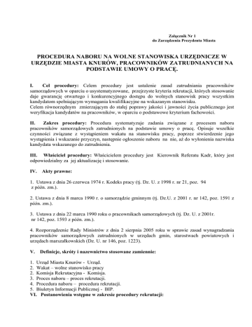 Załącznik Nr 1 do Zarządzenia Prezydenta Miasta PROCEDURA NABORU NA WOLNE STANOWISKA URZĘDNICZE W URZĘDZIE MIASTA KNURÓW, PRACOWNIKÓW ZATRUDNIANYCH NA PODSTAWIE UMOWY O PRACĘ. I. Cel procedury: Celem procedury jest ustalenie zasad zatrudniania pracowników samorządowych w oparciu o usystematyzowane, przejrzyste kryteria rekrutacji, których stosowanie daje gwarancję otwartego i konkurencyjnego dostępu do wolnych stanowisk pracy wszystkim kandydatom spełniającym wymagania kwalifikacyjne na wskazanym stanowisku. Celem równorzędnym zmierzającym do stałej poprawy jakości i jawności życia publicznego jest weryfikacja kandydatów na pracowników, w oparciu o podstawowe kryterium fachowości. II. Zakres procedury: Procedura systematyzuje zadania związane z procesem naboru pracowników samorządowych zatrudnionych na podstawie umowy o pracę. Opisuje wszelkie czynności związane z wystąpieniem wakatu na stanowisku pracy, poprzez stwierdzenie jego wystąpienia i wskazanie przyczyn, następnie ogłoszenie naboru na nie, aż do wyłonienia nazwiska kandydata wskazanego do zatrudnienia. III. Właściciel procedury: Właścicielem procedury jest Kierownik Referatu Kadr, który jest odpowiedzialny za jej aktualizację i stosowanie. IV. Akty prawne: 1. Ustawa z dnia 26 czerwca 1974 r. Kodeks pracy (tj. Dz. U. z 1998 r. nr 21, poz. 94 z późn. zm.). 2. Ustawa z dnia 8 marca 1990 r. o samorządzie gminnym (tj. Dz.U. z 2001 r. nr 142, poz. 1591 z późn. zm.). 3. Ustawa z dnia 22 marca 1990 roku o pracownikach samorządowych (tj. Dz. U. z 2001r. nr 142, poz. 1593 z późn. zm.). 4. Rozporządzenie Rady Ministrów z dnia 2 sierpnia 2005 roku w sprawie zasad wynagradzania pracowników samorządowych zatrudnionych w urzędach gmin, starostwach powiatowych i urzędach marszałkowskich (Dz. U. nr 146, poz. 1223). V. Definicje, skróty i nazewnictwo stosowane zamiennie: 1. Urząd Miasta Knurów - Urząd. 2. Wakat – wolne stanowisko pracy 2. Komisja Rekrutacyjna - Komisja. 3. Proces naboru – proces rekrutacji. 4. Procedura naboru – procedura rekrutacji. 5. Biuletyn Informacji Publicznej - BIP. VI. Postanowienia wstępne w zakresie procedury rekrutacji: 1. Postanowienia ogólne: 1.1. Każdy wakat na stanowisku pracy występujący w Urzędzie Miasta Knurów, objęty jest procesem rekrutacji. Procesem tym zostają objęte stanowiska, w przypadku wystąpienia takiego wakatu lub w przypadku podjęcia decyzji o utworzeniu nowego stanowiska pracy. Proces rekrutacji odbywa się w sposób otwarty i konkurencyjny w postępowaniu rekrutacyjnym opartym na przejrzystych kryteriach i równym dostępie do wolnych miejsc pracy. 1.2. W przypadku podjęcia decyzji o dokonaniu wewnętrznego przesunięcia w grupie stanowisk urzędniczych, wynikającego z dokonywanych zmian reorganizacyjnych nie powodujących zwiększenia zatrudnienia, nie stosuje się procedury rekrutacji. Decyzję taką podejmuje Prezydent Miasta. 1.3. Z procedury rekrutacji zwolnieni są pracownicy zatrudniani na stanowiskach pomocniczych i stanowiskach obsługi; w przypadku wakatu występującego na tych stanowiskach dobór kandydata do zatrudnienia odbywa się w oparciu o analizę złożonych ofert pracy, w tym załączonego CV wraz z opisem przebiegu pracy zawodowej. Ogłoszenie o wolnym miejscu pracy w tej grupie stanowisk podaje się do publicznej wiadomości poprzez umieszczenie w Biuletynie Informacji Publicznej oraz na tablicy ogłoszeń Urzędu. 1.4.W szczególnie uzasadnionych przypadkach decyzję o innym trybie ogłoszenia informacji o wolnym miejscu pracy (publikacji ogłoszenia w prasie) w grupie pracowników zatrudnianych na stanowiskach pomocniczych i stanowiskach obsługi podejmuje Sekretarz Miasta w porozumieniu z Naczelnikiem Wydziału Organizacyjnego i Kadr. W przypadku zastosowania procedury rekrutacji dla wskazanego stanowiska, proces rekrutacji kandydata na wolne stanowisko pracy odbywa się analogicznie jak dla pracowników zatrudnianych w grupie stanowisk urzędniczych. 1.5.Otwartym i konkurencyjnym procesem rekrutacji, w przypadku wystąpienia takiej potrzeby, zostaną objęci wolontariusze lub pracownicy zatrudniani do robót publicznych. Podjęcie decyzji o przeprowadzeniu naboru w tej grupie pozyskiwanych pracowników, każdorazowo zostaje opublikowane w BIP oraz wywieszone na informacyjnej tablicy ogłoszeń. Kwalifikacja kandydatów odbywa się po przeprowadzeniu rozmów w trybie określonym niniejszą procedurą. 1.6. Za prawidłową organizację i przebieg procesu rekrutacji w prowadzonym postępowaniu odpowiada Sekretarz Miasta działający z upoważnienia Prezydenta Miasta. 2. Wymogi stawiane kandydatom do zatrudnienia na stanowiskach pracowników samorządowych oraz samorządowych stanowiskach urzędniczych: 2.1. Pracownikiem samorządowym zatrudnionym na podstawie umowy o pracę może być osoba, która: 1/ posiada kwalifikacje zawodowe wymagane do wykonywania pracy na określonym stanowisku, 2/ posiada stan zdrowia pozwalający na zatrudnienie na określonym stanowisku. 2 2.2. Pracownikiem samorządowym zatrudnionym na stanowisku urzędniczym może być osoba zatrudniana na podstawie umowy o pracę, która spełnia wymagania określone w ppkt 2.1 oraz: 1/ posiada co najmniej wykształcenie średnie, 2/ nie była karana za przestępstwo popełnione umyślnie, 3/ cieszy się nieposzlakowaną opinią. VII. Przebieg procedury rekrutacji: 1. Zgłoszenie konieczności zatrudnienia pracownika: 1.1. Potrzebę zatrudnienia pracownika Prezydentowi Miasta zgłasza Sekretarz Miasta, w oparciu o wniosek uzasadniający utworzenie nowego stanowiska pracy bądź zatrudnienie w związku z powstałym wakatem. Wniosek taki sporządzany jest przez Kierownika Referatu Kadr lub Naczelnika Wydziału w którym zaistniała potrzeba zatrudnienia pracownika na samorządowym stanowisku: urzędniczym, pomocniczym lub stanowisku obsługi. 1.2. W przypadku nowoutworzonych stanowisk, konieczna jest analiza skutków finansowych z