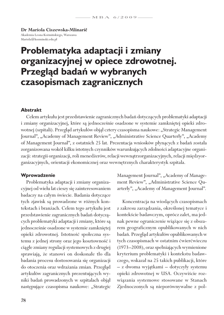 – M BA 6/2 0 0 9– Dr Mariola Ciszewska-Mlinariþ Akademia Leona Koźmińskiego, Warszawa [email protected] Problematyka adaptacji i zmiany organizacyjnej w opiece zdrowotnej. Przegląd badań w wybranych czasopismach zagranicznych Abstrakt Celem artykułu jest przedstawienie zagranicznych badań dotyczących problematyki adaptacji i zmiany organizacyjnej, które są jednocześnie osadzone w systemie zamkniętej opieki zdrowotnej (szpitali). Przegląd artykułów objął cztery czasopisma naukowe: „Strategic Management Journal”, „Academy of Management Review”, „Administrative Science Quarterly”, „Academy of Management Journal”, z ostatnich 25 lat. Prezentacja wniosków płynących z badań została zorganizowana wokół kilku istotnych czynników warunkujących zdolności adaptacyjne organizacji: strategii organizacji, roli menedżerów, relacji wewnątrzorganizacyjnych, relacji międzyorganizacyjnych, orientacji ekonomicznej oraz wewnętrznych charakterystyk szpitala. Wprowadzenie Problematyka adaptacji i zmiany organizacyjnej od wielu lat cieszy się zainteresowaniem badaczy na całym świecie. Badania dotyczące tych zjawisk są prowadzone w różnych kontekstach i branżach. Celem tego artykułu jest przedstawienie zagranicznych badań dotyczących problematyki adaptacji i zmiany, które są jednocześnie osadzone w systemie zamkniętej opieki zdrowotnej. Istotność społeczna systemu z jednej strony oraz jego kosztowność i ciągłe zmiany regulacji systemowych z drugiej sprawiają, że stanowi on doskonałe tło dla badania procesu dostosowania się organizacji do otoczenia oraz wdrażania zmian. Przegląd artykułów zagranicznych prezentujących wyniki badań prowadzonych w szpitalach objął następujące czasopisma naukowe: „Strategic 78 Management Journal”, „Academy of Management Review”, „Administrative Science Quarterly”, „Academy of Management Journal”. Koncentracja na wiodących czasopismach z zakresu zarządzania, określonej tematyce i kontekście badawczym, oprócz zalet, ma jednak pewne ograniczenie wiążące się z obszarem geograficznym opublikowanych w nich badań. Przegląd artykułów opublikowanych w tych czasopismach w ostatnim ćwierćwieczu (1973–2008), oraz spełniających wymienione kryterium problematyki i kontekstu badawczego, wskazał na 25 takich publikacji, które – z dwoma wyjątkami – dotyczyły systemu opieki zdrowotnej w USA. Oczywiście rozwiązania systemowe stosowane w Stanach Zjednoczonych są nieporównywalne z pol- – A R T Y K U ŁY – Tabela 1. Chronologiczna prezentacja analizowanych badań z wybranych czasopism zagranicznych Autor Przedmiot badań Rushing (1974) Wydajność i skuteczność w szpitalach for i non-profit Pfeffer i Salancik (1977) Organizacyjny kontekst i długość kadencji dyrektora Zarządzanie przez cele jako narzędzie wspierające organizowanie i kontrolę Wpływ czynników indywidualnych, organizacyjnych i kontekstualnych (środowiskowych) na wdrożenie innowacji technologicznych i administracyjnych Adaptacja do bezprecedensowych, nagłych zdarzeń w otoczeniu (jolts) Dystrybucja władzy w szpitalach for- i non profit Uwarunkowania wdrożenia praktyk racjonalizujących koszty w szpitalach w odpowiedzi na zewnętrzne presje ograniczania kosztów Czynniki wpływające na niestabilność przywództwa w szpitalach Czynniki ograniczające adaptację szpitali oraz zwiększające zagrożenie ich likwidacji Covaleski i Dirsmith (1981) Kimberly i Evanisko (1981) Meyer (1982) Carper i Litschert (1983) Provan (1987) Alexander, Fennel i Halpern (1993) Gruca i Nath (1994) Dranove i Schanley (1995) Motywy powstania systemów wielo-szpitalnych Goes i Park (1997) Wpływ powiązań organizacyjnych na proces innowacji Ocena dostosowania organizacji do dynamicznego otoczenia - test relatywnej inercji Przetrwanie szpitali i źródła ich legitymizacji w zmieniającym się otoczeniu Wpływ różnic poznawczych zespołu menedżerskiego na proces zarządzania strategicznego Wpływ odmienności zdań zespołu decydentów na jakość decyzji Wykorzystanie zarządzania wrażeniami w prezentacji zmiany strukturalnej aktorom instytucjonalnym Wpływ czynników rynkowych i instytucjonalnych na radykalne przekształcenia Uwarunkowania wdrożenia innowacyjnych praktyk zarządczych (TQM) w szpitalach Ruef (1997) Ruef i Scott (1998) Miller, Burke i Glick (1998) Dooley i Fryxell (1999) Próba badawcza Szpitale ogólne, nie większe niż 95 łóżek 57 szpitali 2 szpitale 210 szpitali 3 studia przypadków i próba 19 szpitali 115 szpitali ogólnych 303 szpitale non profit 1534 szpitale gminne non profit, na przestrzeni 8 lat 96 szpitali, w tym 15, które zostały zamknięte 13 systemów, zrzeszających 56 szpitali 400 szpitali na przestrzeni 10 lat 617 szpitali (w ok. 11 lat, w tym 15% zamkniętych) 143 szpitale, na przestrzeni 46 lat 106 szpitali Zespoły decydentów z 86 szpitali Przewaga konkurencyjna w sektorze opieki zdrowotnej 15 szpitali non profit, analiza dokumentacji i raportów 147 szpitali, które zostały przekształcone 150 szpitali podległych Dep. Spraw Weteranów, USA 16 szpitali, w tym 9 akademickich i 7 gminnych 824 szpitale Wpływ polityki wynagradzania na wyniki organizacji 333 szpitale ogólne Chadwick, Hunter i Walston (2004) Wpływ sposobu przeprowadzenia downsizingu na osiągane przez szpitale wyniki 114 szpitali, które przeszły downsizing Young, Charns i Heeren (2004) Wpływ typu struktury na wyniki organizacyjne i kapitał 11 szpitali ogólnych, 642 społeczny respondentów Ferlie, Fitzgerald, Wood i Hawkins (2005) Czynniki ograniczające rozprzestrzenianie się innowacji 8 studiów przypadków innowacji, UK Katz-Navon, Naveh i Stern (2005) Wpływ procedur bezpieczeństwa i ich percepcji na błędy lekarskie 3 szpitale ogólne, 632 respondentów, Izrael Arndt i Bigelow (2000) D’Aunno, Succi i Alexander (2000) Young, Charns i Shortell (2001) Edmondson, Bohmer i Pisano (2001) Doug