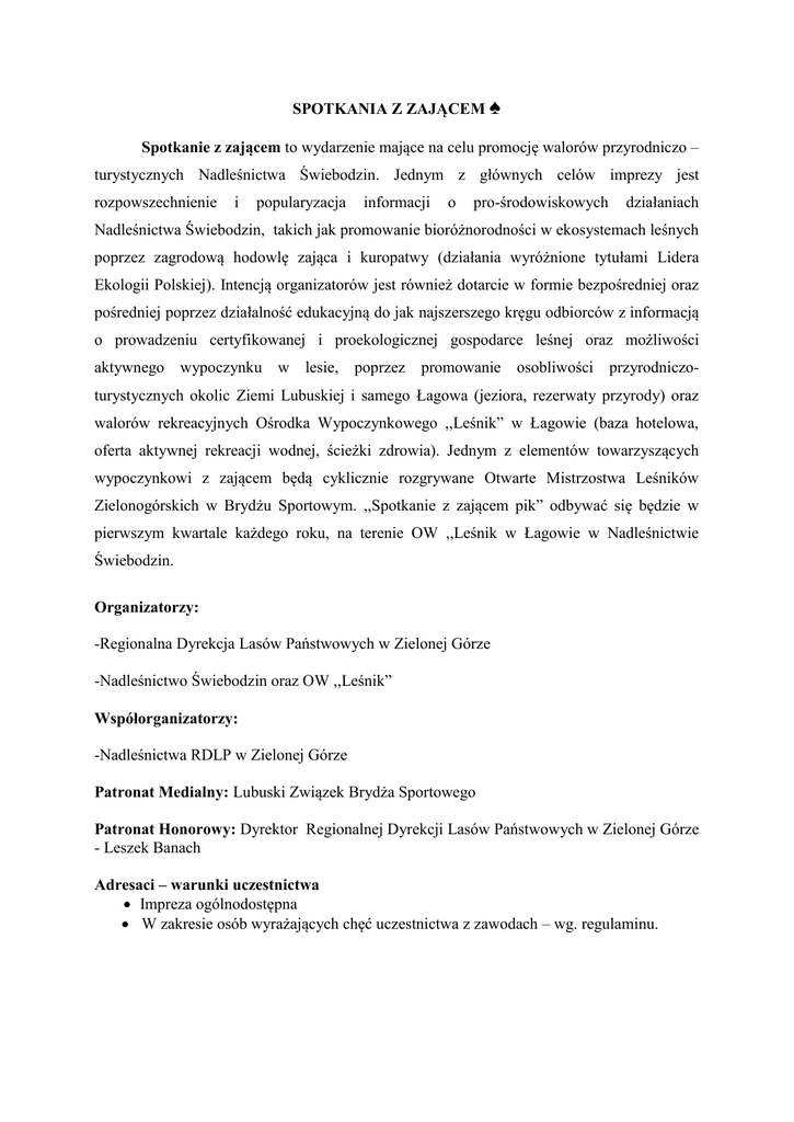 SPOTKANIA Z ZAJĄCEM ♠ Spotkanie z zającem to wydarzenie mające na celu promocję walorów przyrodniczo – turystycznych Nadleśnictwa Świebodzin. Jednym z głównych celów imprezy jest rozpowszechnienie i popularyzacja informacji o pro-środowiskowych działaniach Nadleśnictwa Świebodzin, takich jak promowanie bioróżnorodności w ekosystemach leśnych poprzez zagrodową hodowlę zająca i kuropatwy (działania wyróżnione tytułami Lidera Ekologii Polskiej). Intencją organizatorów jest również dotarcie w formie bezpośredniej oraz pośredniej poprzez działalność edukacyjną do jak najszerszego kręgu odbiorców z informacją o prowadzeniu certyfikowanej i proekologicznej gospodarce leśnej oraz możliwości aktywnego wypoczynku w lesie, poprzez promowanie osobliwości przyrodniczoturystycznych okolic Ziemi Lubuskiej i samego Łagowa (jeziora, rezerwaty przyrody) oraz walorów rekreacyjnych Ośrodka Wypoczynkowego ,,Leśnik” w Łagowie (baza hotelowa, oferta aktywnej rekreacji wodnej, ścieżki zdrowia). Jednym z elementów towarzyszących wypoczynkowi z zającem będą cyklicznie rozgrywane Otwarte Mistrzostwa Leśników Zielonogórskich w Brydżu Sportowym. ,,Spotkanie z zającem pik” odbywać się będzie w pierwszym kwartale każdego roku, na terenie OW ,,Leśnik w Łagowie w Nadleśnictwie Świebodzin. Organizatorzy: -Regionalna Dyrekcja Lasów Państwowych w Zielonej Górze -Nadleśnictwo Świebodzin oraz OW ,,Leśnik” Współorganizatorzy: -Nadleśnictwa RDLP w Zielonej Górze Patronat Medialny: Lubuski Związek Brydża Sportowego Patronat Honorowy: Dyrektor Regionalnej Dyrekcji Lasów Państwowych w Zielonej Górze - Leszek Banach Adresaci – warunki uczestnictwa Impreza ogólnodostępna W zakresie osób wyrażających chęć uczestnictwa z zawodach – wg. regulaminu. Program Imprezy: 1. Elementy o charakterze edukacyjno-krajoznawczym: oficjalne otwarcie Imprezy z udziałem przedstawiciela Dyrektora RDLP w Zielonej Górze, prezentacje ekspozycji fotograficznych, filmowych i multimedialnych, dotyczących okolicznych lasów, rezerwatów przyrody, hodowli zagrodowej zająca i kuropatw oraz ścieżek edukacyjnych, prezentacja oferty OW Leśnik, wystawy związane z „Lubuskim Latem Filmowym” - historia festiwalu, ciekawostki, „Gwiazdy filmu w Łagowie” , „Śladami Joanitów” - spacer po Łagowie połączony ze zwiedzaniem rezerwatu przyrody „Nad Jeziorem Trześniowskim” oraz zamku Joanitów - siedziby komandorii – XIV wieku, „Tiergarten” – założony przez margrabiego Christiana, Ludwika Hohenzolloerna – komtura łagowskiego zamku, Ścieżka przyrodnicza „Sokola Góra” – grodzisko obronne z XII wieku, Zabytkowy cmentarz ewangelicki – przykład uszanowania pamięci o wcześniejszych mieszkańcach Łagowa. 2. Otwarte Mistrzostwa Leśników Zielonogórskich w Brydżu Sportowym. Regulamin stanowi załącznik do niniejszego pisma. 3. Zajęcia fakultatywne o tematyce leśnej: zagrodowa hodowla zwierzyny łownej, zajęcy i kuropatw. Dane teleadresowe organizatorów 1. RDLP w Zielonej Górze ul. Kazimierza Wielkiego 24 a, 65- 950 Zielona Góra Tel: 068 3254451 adres e-mail [email protected] 2. Nadleśnictwo Świebodzin ul Wojska Polskiego 3, 66-200 Świebodzin, tel. 0683822001, adres e-mail [email protected] 3. OW ,,Leśnik” ul. Chrobrego 10, 66-220 Łagów tel. 0683412509, e-mail [email protected] Orientacyjny koszt udziału w imprezie dla każdego nadleśnictwa (zgodnie z harmonogramem imprez edukacyjno-promocyjno-sportowych) – ok. 400 zł na nadleśnictwo. Przedstawiciel organizatora: Dariusz Kiewlicz