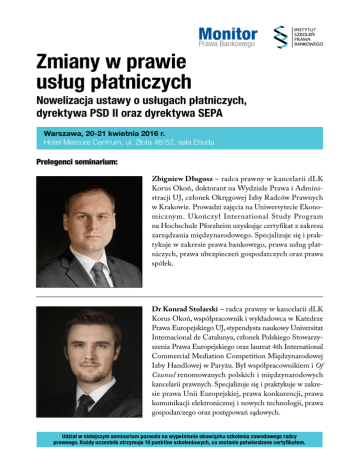 Zmiany w prawie usług płatniczych Nowelizacja ustawy o usługach płatniczych, dyrektywa PSD II oraz dyrektywa SEPA Warszawa, 20-21 kwietnia 2016 r. Hotel Mercure Centrum, ul. Złota 48/52, sala Etiuda Prelegenci seminarium: Zbigniew Długosz – radca prawny w kancelarii dLK Korus Okoń, doktorant na Wydziale Prawa i Administracji UJ, członek Okręgowej Izby Radców Prawnych w Krakowie. Prowadzi zajęcia na Uniwersytecie Ekonomicznym. Ukończył International Study Program na Hochschule Pforzheim uzyskując certyfikat z zakresu zarządzania międzynarodowego. Specjalizuje się i praktykuje w zakresie prawa bankowego, prawa usług płatniczych, prawa ubezpieczeń gospodarczych oraz prawa spółek. Dr Konrad Stolarski – radca prawny w kancelarii dLK Korus Okoń, współpracownik i wykładowca w Katedrze Prawa Europejskiego UJ, stypendysta naukowy Universitat Internacional de Catalunya, członek Polskiego Stowarzyszenia Prawa Europejskiego oraz laureat 4th International Commercial Mediation Competition Międzynarodowej Izby Handlowej w Paryżu. Był współpracownikiem i Of Counsel renomowanych polskich i międzynarodowych kancelarii prawnych. Specjalizuje się i praktykuje w zakresie prawa Unii Europejskiej, prawa konkurencji, prawa komunikacji elektronicznej i nowych technologii, prawa gospodarczego oraz postępowań sądowych. Udział w niniejszym seminarium pozwala na wypełnienie obowiązku szkolenia zawodowego radcy prawnego. Każdy uczestnik otrzymuje 10 punktów szkoleniowych, co zostanie potwierdzone certyfikatem. Cele seminarium: Celem seminarium jest podsumowanie problemów praktycznych związanych ze stosowaniem nowych oraz nadchodzących regulacji polskich i unijnych w sektorze usług płatniczych. Zostaną omówione w szczególności uregulowania dyrektywy 2015/2366 w sprawie usług płatniczych (PSD II), rozporządzenia SEPA End-Date oraz planowanych nowelizacji ustawy o usługach płatniczych. Regulacje te zostaną przedstawione w kontekście innych regulacji prawnych określających zasady prowadzenia działalności przez banki i innych dostawców usług płatniczych. Grupa docelowa: przedstawiciele banków, SKOK-ów oraz innych dostawców usług płatniczych, w szczególności: – członkowie zarządów – pracownicy departamentów produktowych – pracownicy departamentów prawnych – pracownicy departamentów operacyjnych – pracownicy departamentów IT – pracownicy departamentów compliance – pracownicy departamentów odpowiadających za obsługę klientów indywidualnych przedstawiciele organów nadzoru nad rynkiem finansowym przedstawiciele organów ochrony konsumentów Udział w niniejszym seminarium pozwala na wypełnienie obowiązku szkolenia zawodowego radcy prawnego. Każdy uczestnik otrzymuje 10 punktów szkoleniowych, co zostanie potwierdzone certyfikatem. PROGRAM Środa, 21 kwietnia 10.00-10.15 – Rejestracja uczestników 10.15-11.45 Zagadnienia ogólne drugiej dyrektywy o usługach płatniczych (PSD II) PSD II w pakiecie nowych regulacji (PSD II, EMD, PAD, MIFREG, NIS, eIDAS, SecuRePay, EBA Guidelines, GDPR) Planowane nowelizacje ustawy o usługach płatniczych Siatka terminologiczna nowych regulacji (karta płatnicza, debetowa, kredytowa, przedpłacona, system kart płatniczych, marka płatnicza, schemat płatniczy, organizacja kartowa) Nowe środki nadzorcze NBP i KNF oraz obowiązki informacyjne w świetle nowych regulacji 11.45-12.15 – Przerwa na kawę 12.15-13.45 Zakres zastosowania dyrektywy PSD II Nowe usługi płatnicze w regulacji PSD II Zmiana katalogu wyłączeń z zakresu zastosowania PSD II Rozszerzenie zakresu terytorialnego i walutowego stosowania PSD Zapewnienie rachunków bankowych dla instytucji płatniczych 13.45-14.45 –Lunch 14.45-16.15 Third party providers (TPP) w PSD II Inicjacja płatności oraz agregacja informacji z rachunków a stanowisko KNF Standard i protokół komunikacji pomiędzy ASPSP a TPP Bank w roli TPP Skutki odmowy TPP przez bank dostępu do rachunku klienta 16.15-16.45 – Pytania i dyskusja PROGRAM Czwartek, 21 kwietnia 10.00-11.45 Nowe zasady odpowiedzialności banków Autoryzacja transakcji i wymóg silnego uwierzytelnienia klienta Ochrona użytkownika TPP Rozpatrywanie reklamacji transakcji oszukańczych w których wystąpił TPP Odpowiedzialność TPP i podział kosztów pomiędzy ASPSP i TPP w przypadku transakcji oszukańczej 11.45-12.15 – Przerwa na kawę 12.15-13.45 Podwyższenie standardów bezpieczeństwa płatności w banku Obowiązki z zakresu zarządzania ryzykiem operacyjnym przy wykonywaniu transakcji płatniczych Zarządzanie incydentami bezpieczeństwa w świetle przepisów PSD II i rekomendacji sektorowych oraz obowiązek ich notyfikacji organom nadzoru i użytkownikowi Incydenty bezpieczeństwa a naruszenie danych osobowych użytkownika Włączenie European Banking Authority do listy organów nadzorczych bezpośrednio zaangażowanych w kwestie nadzoru bezpieczeństwa 13.45-14.45 –Lunch 14.45-16.15 Rozporządzenie SEPA End-Date Interoperacyjność i dostępność dostawcy Problematyka wdrożenia ISO 20022 XML oraz konwersji danych Wykonywanie transakcji płatniczych i R-transakcji Nowe terminy dostosowania działalności dostawców 16.15-16.45 – Pytania i dyskusja WARUNKI UCZESTNICTWA W SEMINARIUM Prosimy o przesyłanie zgłoszeń udziału w seminarium oraz danych potrzebnych do wystawienia faktury faksem lub mailem na adres [email protected]. Organizatorem seminarium jest: Instytut Szkoleń Prawa Bankowego s.c. ul. Ks. E. Lubomirskiego 5 05-250 Radzymin tel/faks 22 786 60 87 Termin nadsyłania zgłoszeń do 11 kwietnia 2016 r. Warunkiem uczestnictwa w spotkaniu jest wniesienie opłaty na konto Instytutu Szkoleń Prawa Bankowego po otrzymaniu faktury VAT. Koszt uczestnictwa w Seminarium wynosi 1500,00 zł (plus 23% VAT) Cena obejmuje uczestnictwo w wykładach, pakiet materiałów seminaryjnych, lunch, przerwy kawowe oraz certyfikat. Po otrzymaniu zgłoszenia udziału, organiza